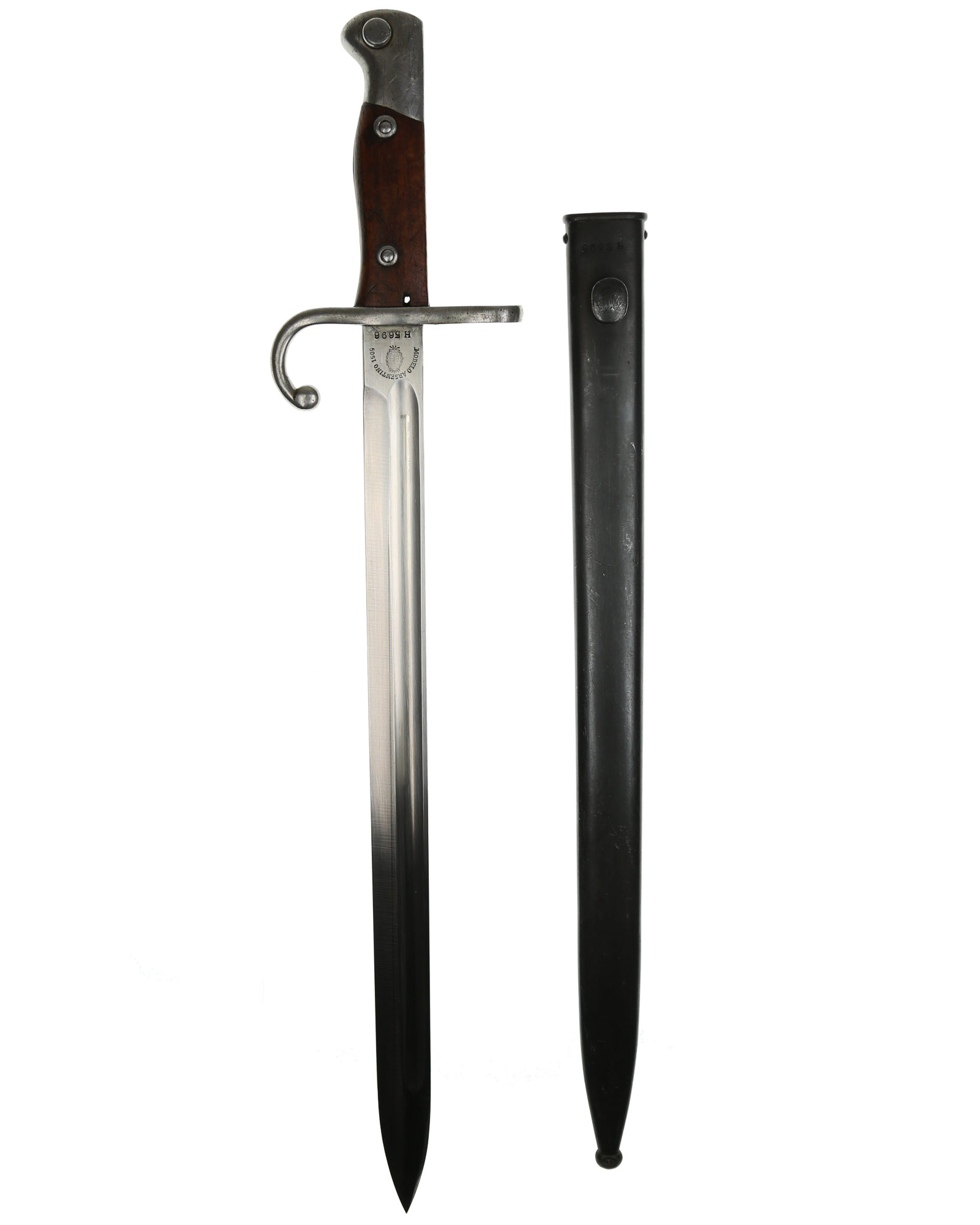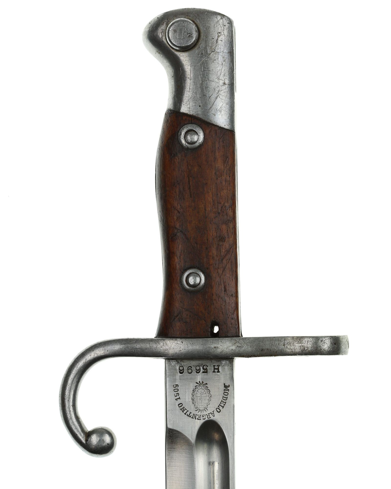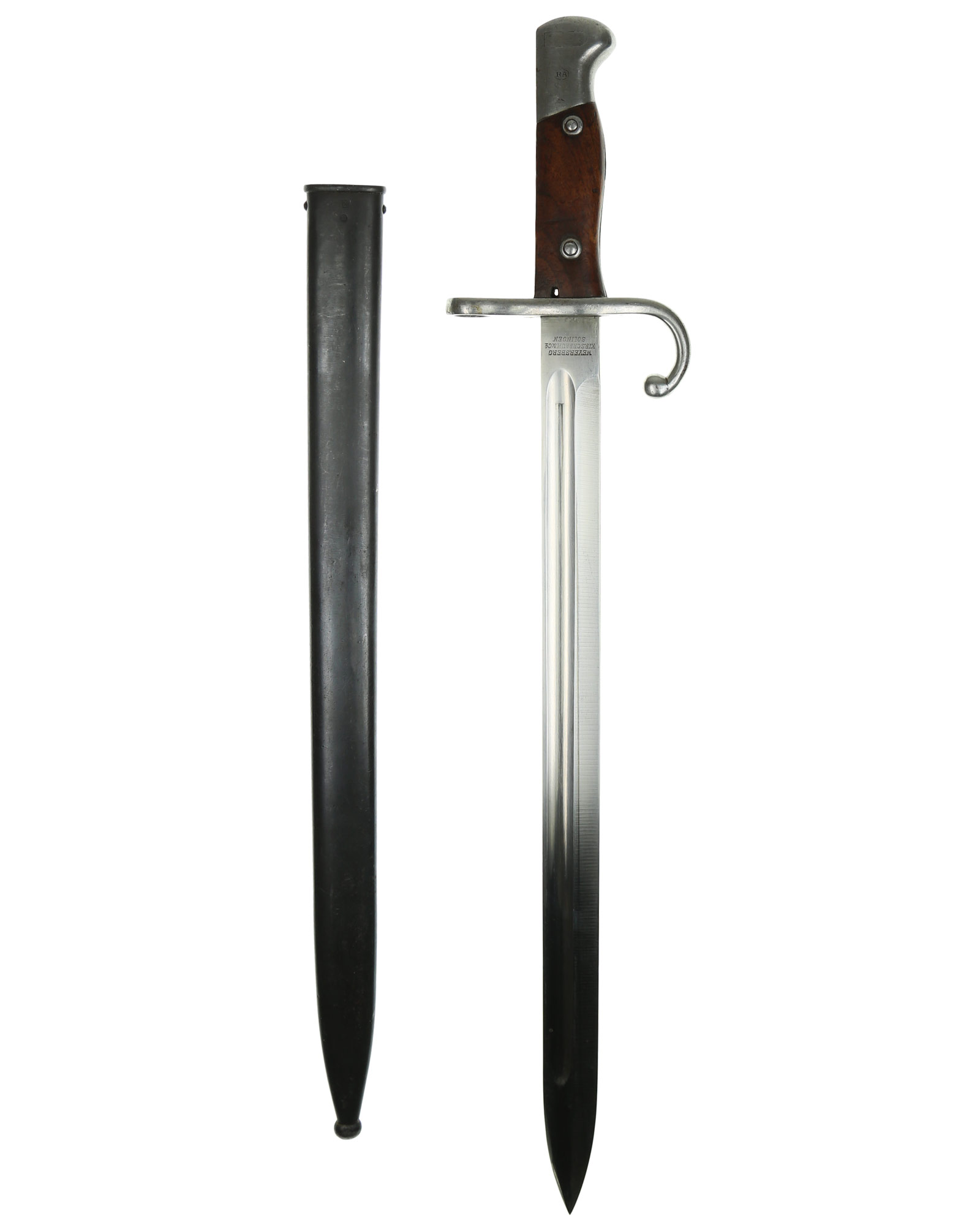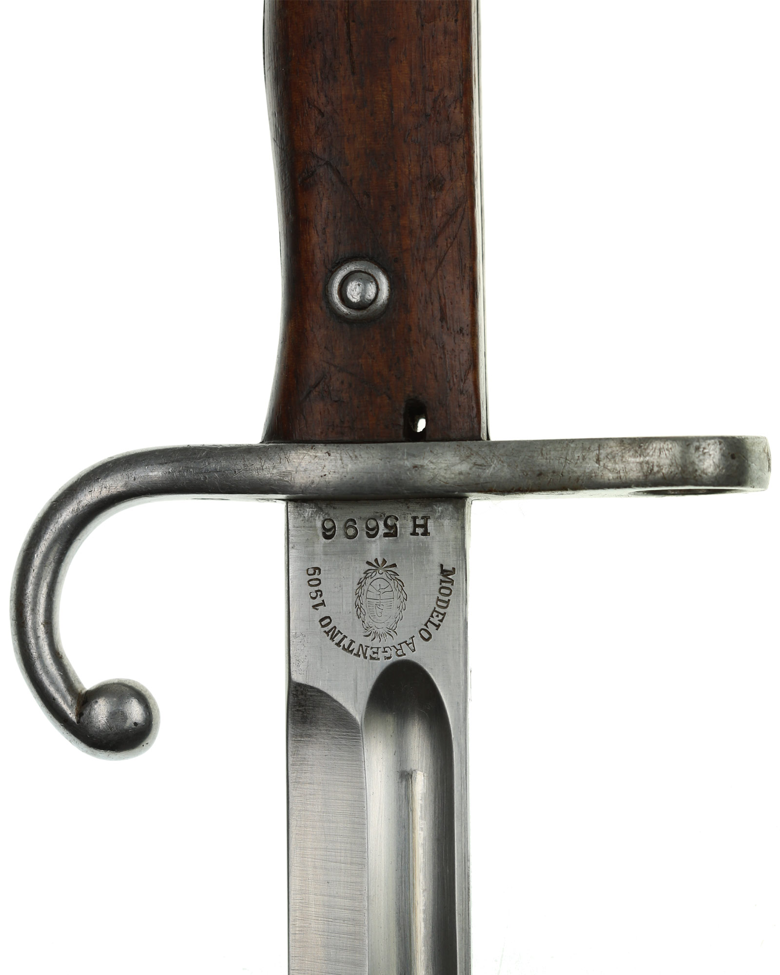 Modelo Argentino 1909 Mauser Sword Bayonet by Weyersberg Kirschbaum Solingen in EXC++ condition. Wood grip, steel crossguard, and hooked "blade-breaker" quillon. The latching mechanism is of the push-button type. The blades is single-edged, and fullered on both sides. The blade is stamped - on the ricasso - with Weyersberg, Kirschbaum & Cie Solingen on one side, on the other is the Argentine Crest (this is usually ground off when released from the arsenal as surplus wares) and Modelo Argentino 1909. The scabbards is of sheet-rolled steel and dark "blued" finish.
