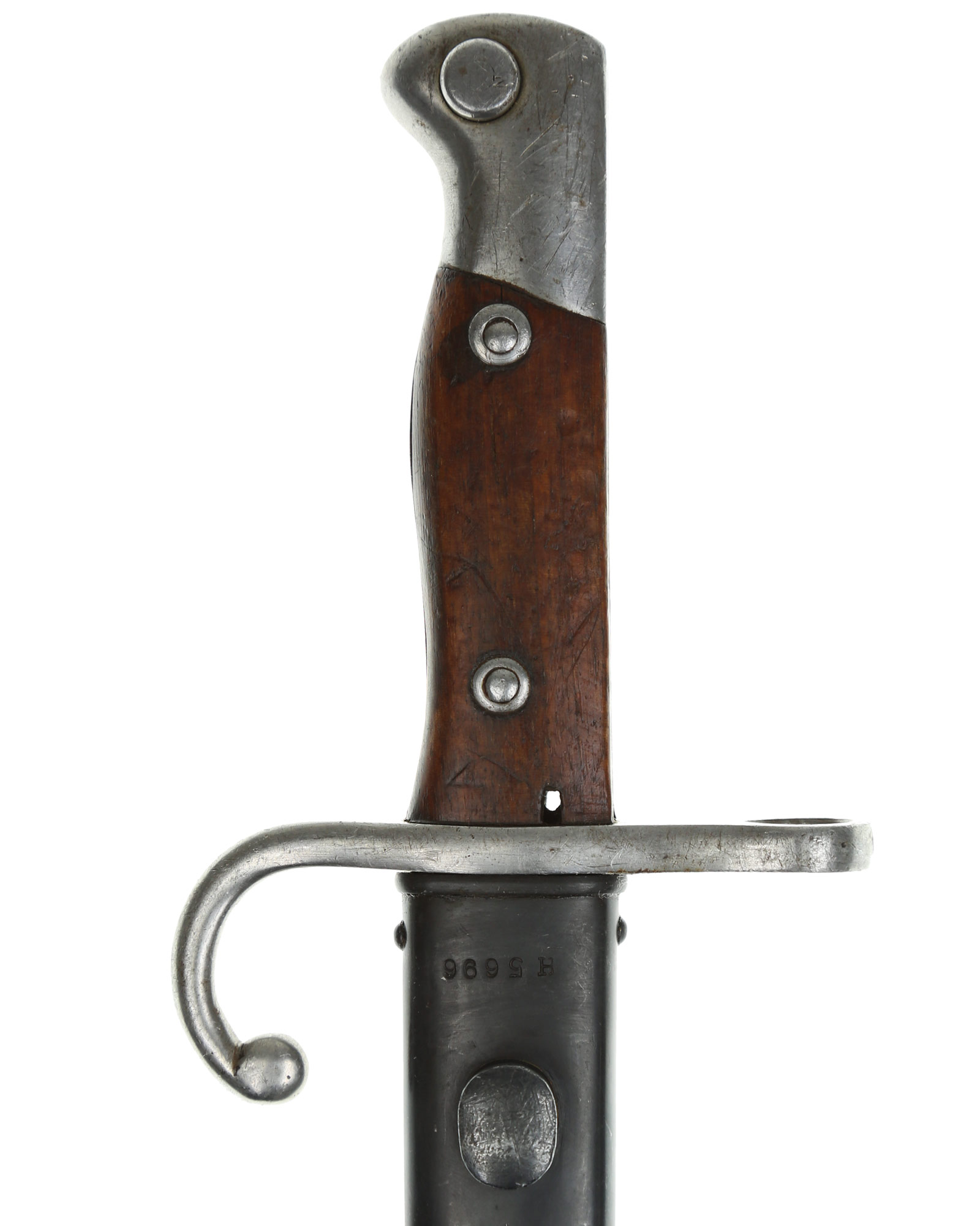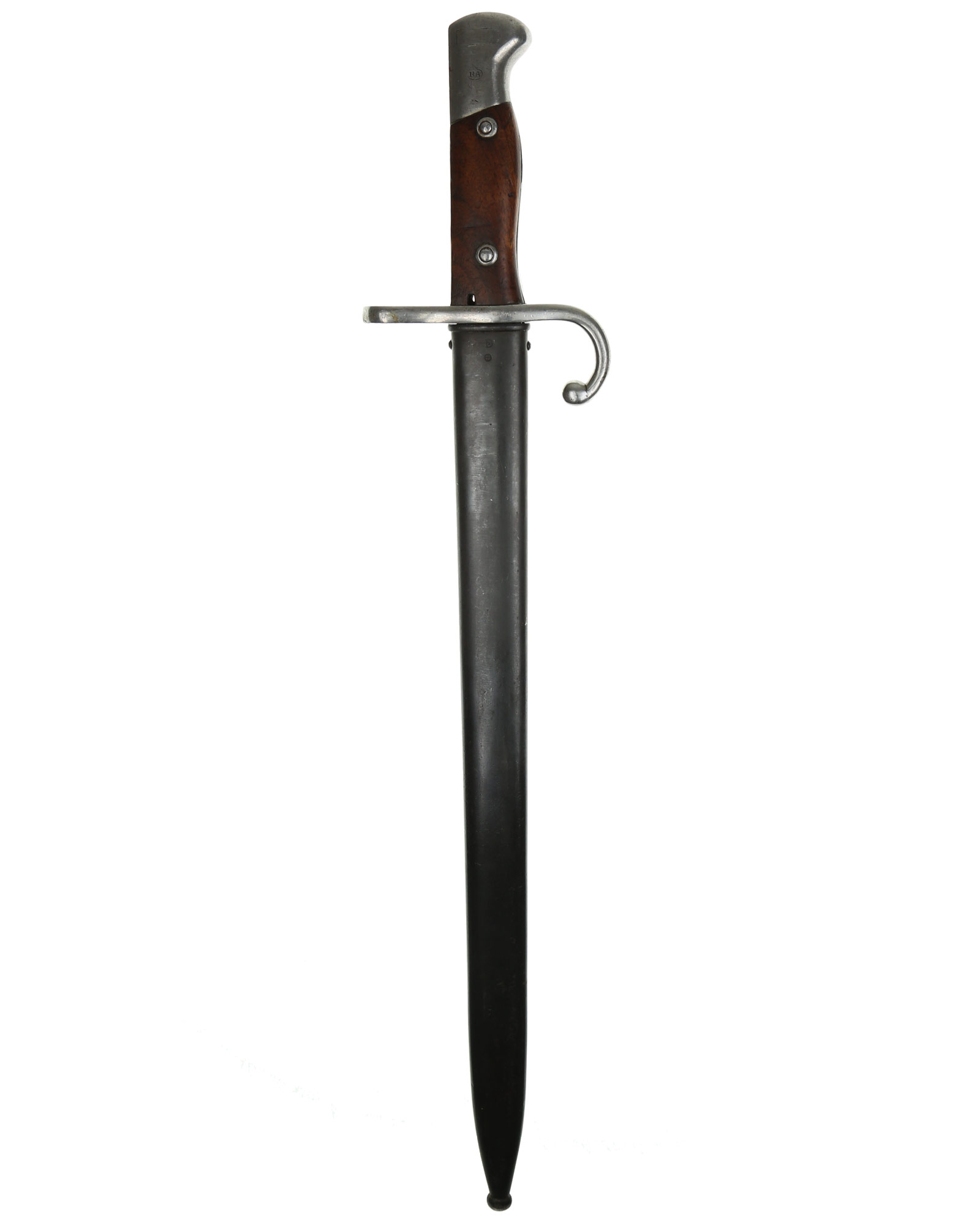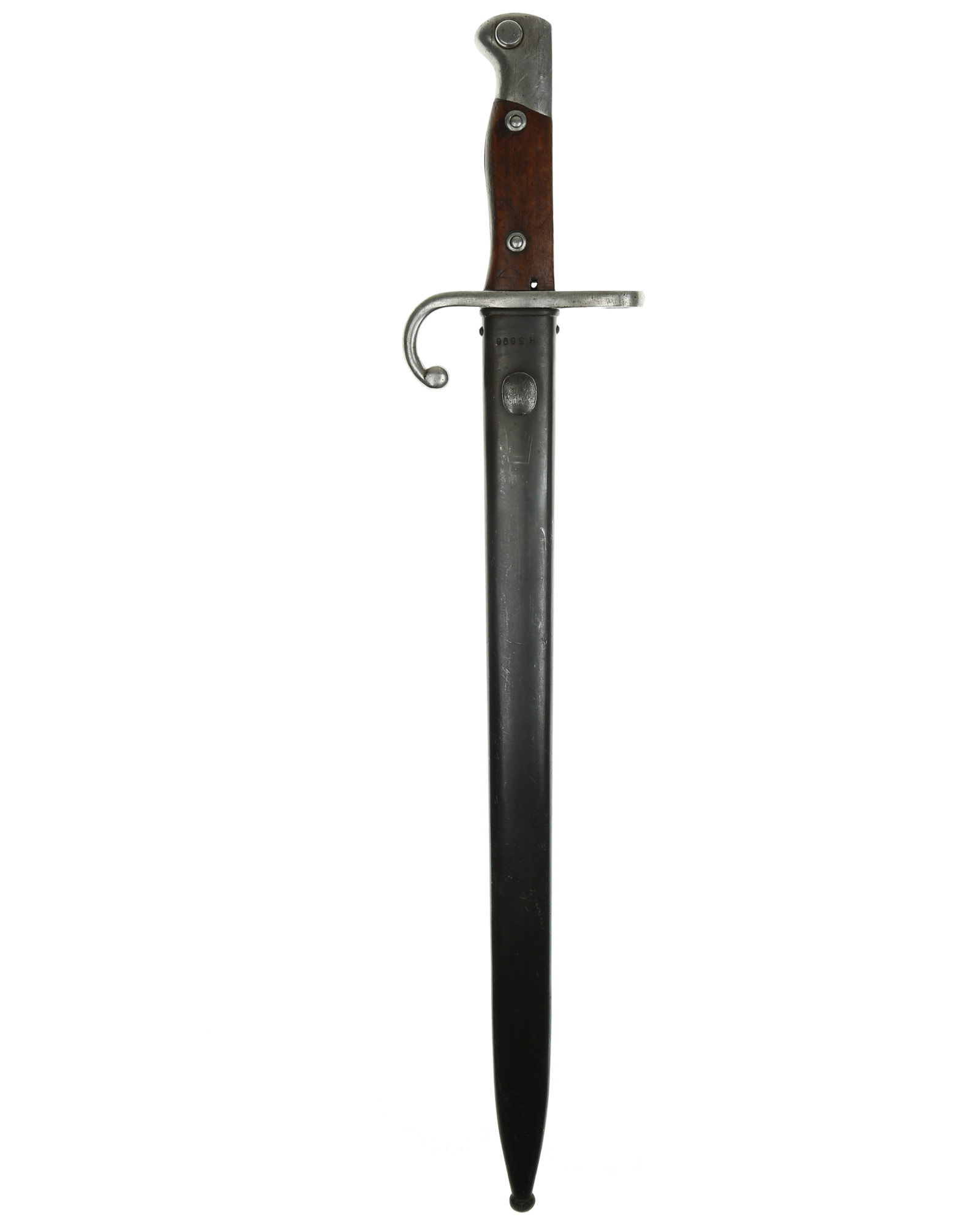 Modelo Argentino 1909 Mauser Sword Bayonet by Weyersberg Kirschbaum Solingen in EXC++ condition. Wood grip, steel crossguard, and hooked "blade-breaker" quillon. The latching mechanism is of the push-button type. The blades is single-edged, and fullered on both sides. The blade is stamped - on the ricasso - with Weyersberg, Kirschbaum & Cie Solingen on one side, on the other is the Argentine Crest (this is usually ground off when released from the arsenal as surplus wares) and Modelo Argentino 1909. The scabbards is of sheet-rolled steel and dark "blued" finish.
