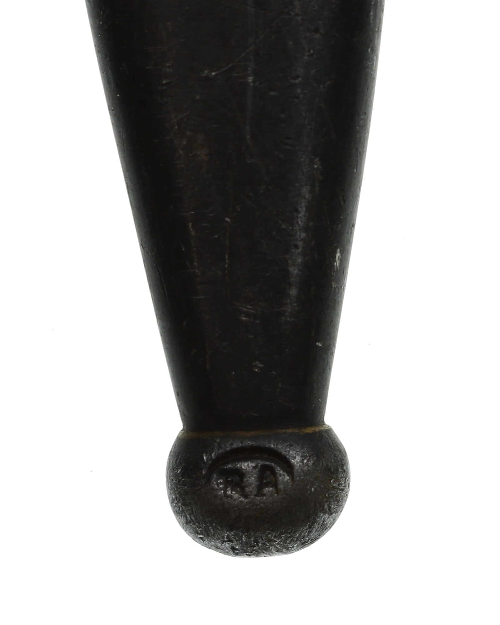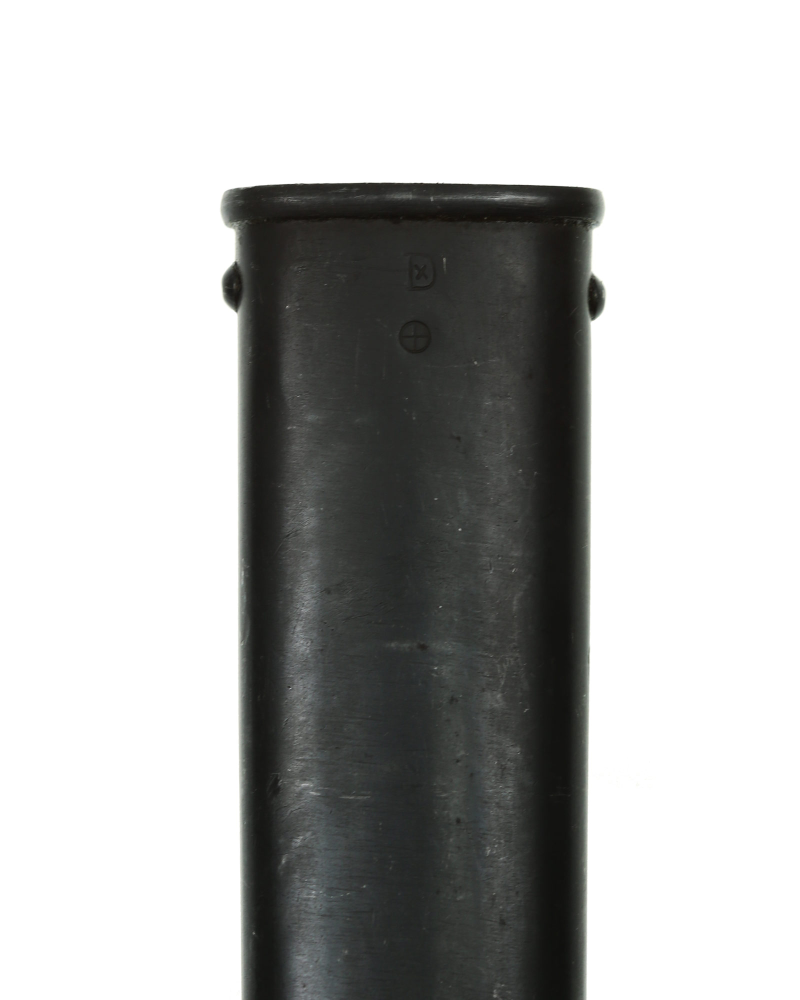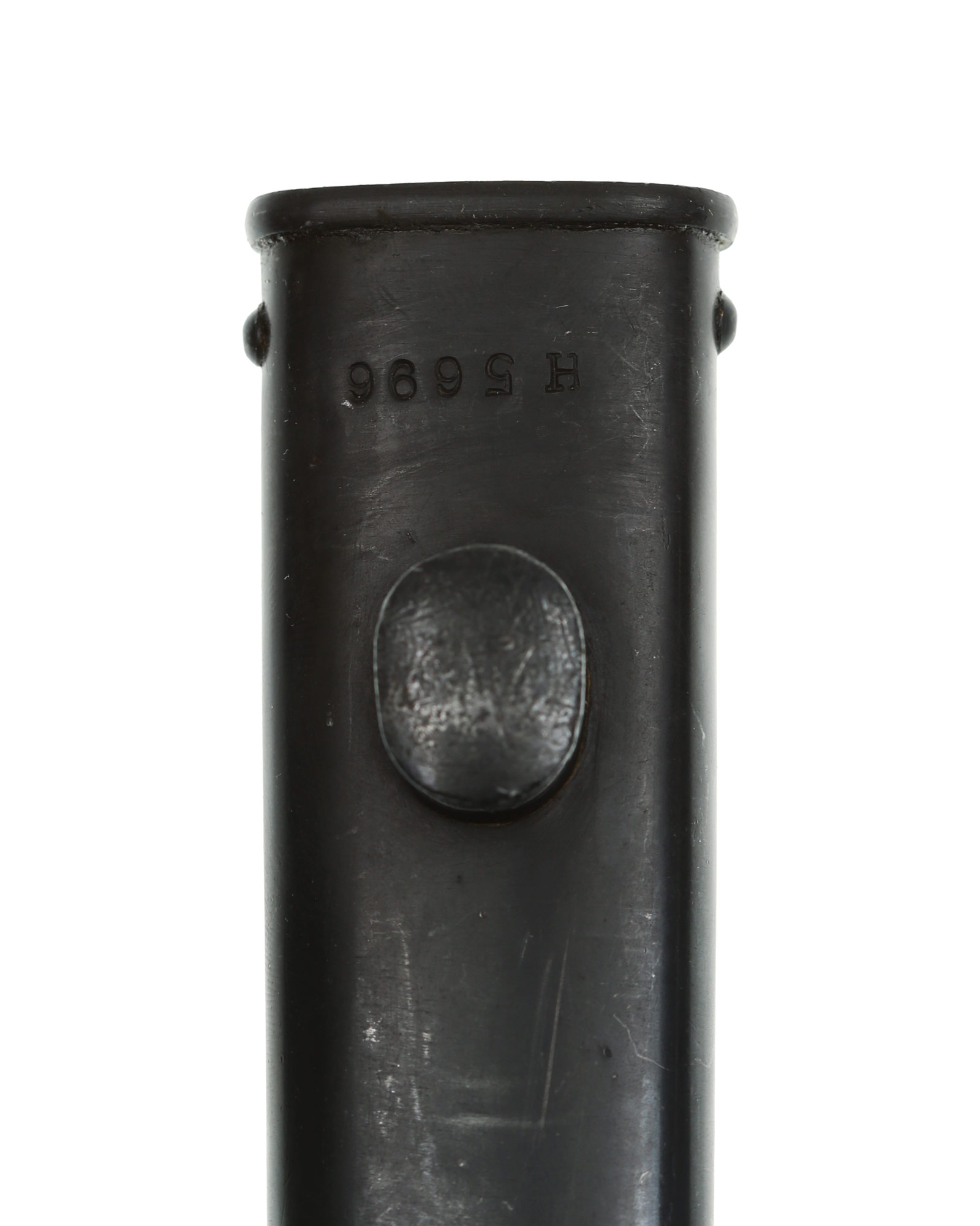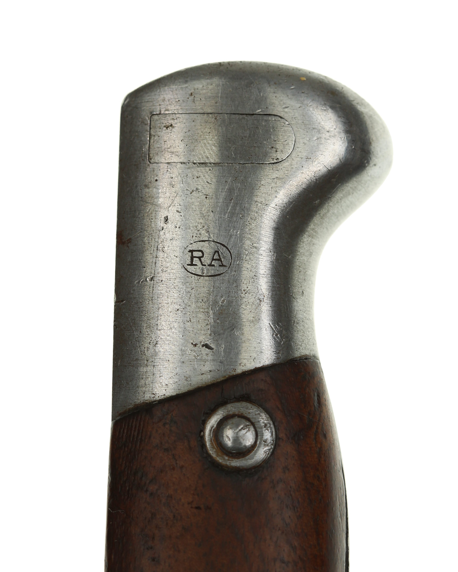 Modelo Argentino 1909 Mauser Sword Bayonet by Weyersberg Kirschbaum Solingen in EXC++ condition. Wood grip, steel crossguard, and hooked "blade-breaker" quillon. The latching mechanism is of the push-button type. The blades is single-edged, and fullered on both sides. The blade is stamped - on the ricasso - with Weyersberg, Kirschbaum & Cie Solingen on one side, on the other is the Argentine Crest (this is usually ground off when released from the arsenal as surplus wares) and Modelo Argentino 1909. The scabbards is of sheet-rolled steel and dark "blued" finish.