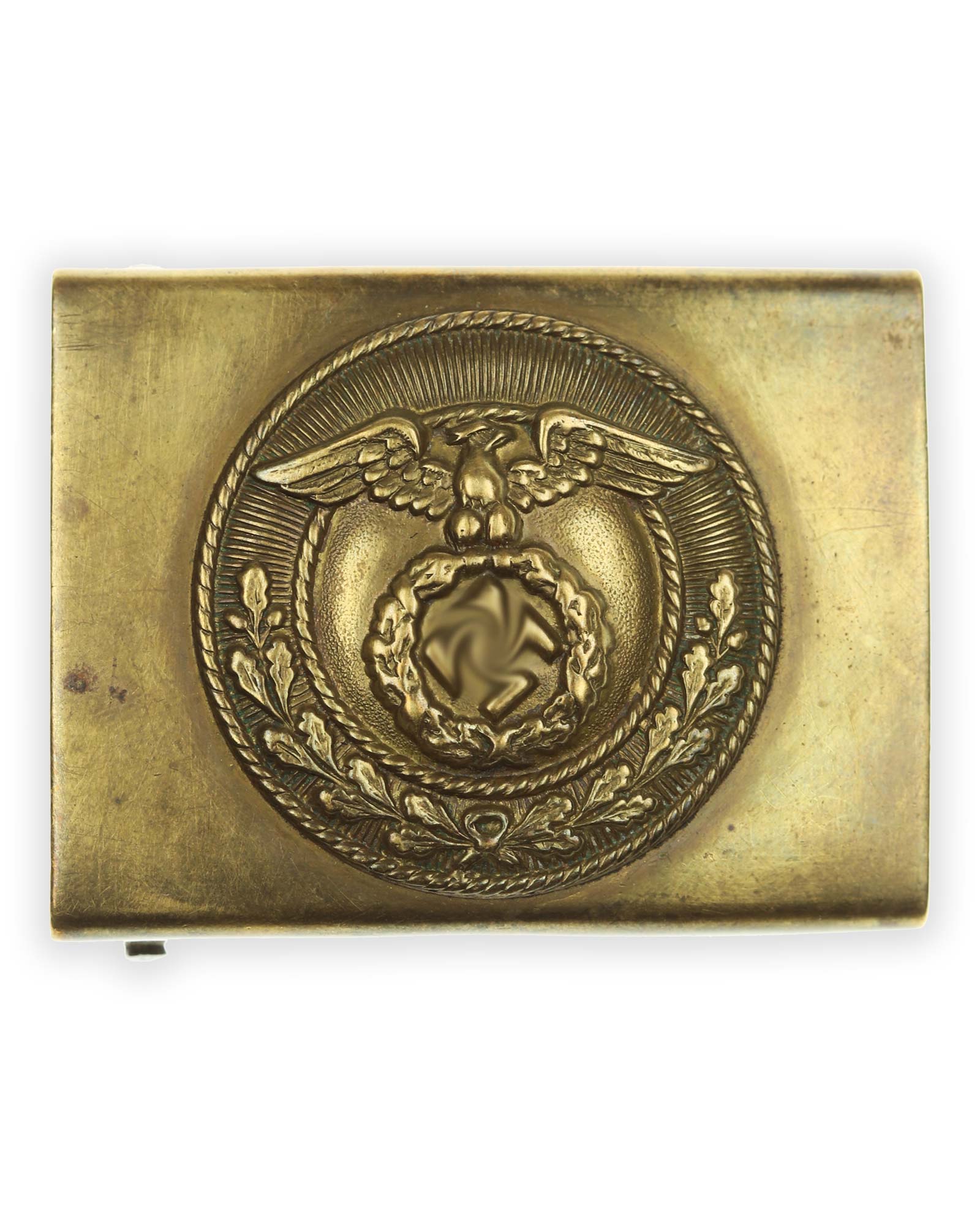 SA [Sturmabteilungen] Enlisted Man's Belt Buckle with Sunwheel Swastika. In die stamped brass with stamped brass face plate affixed by two rivets, unmarked reverse. The condition is EXC+. Total weight 42 g. Dimensions: 62,62 x 48,19 mm.