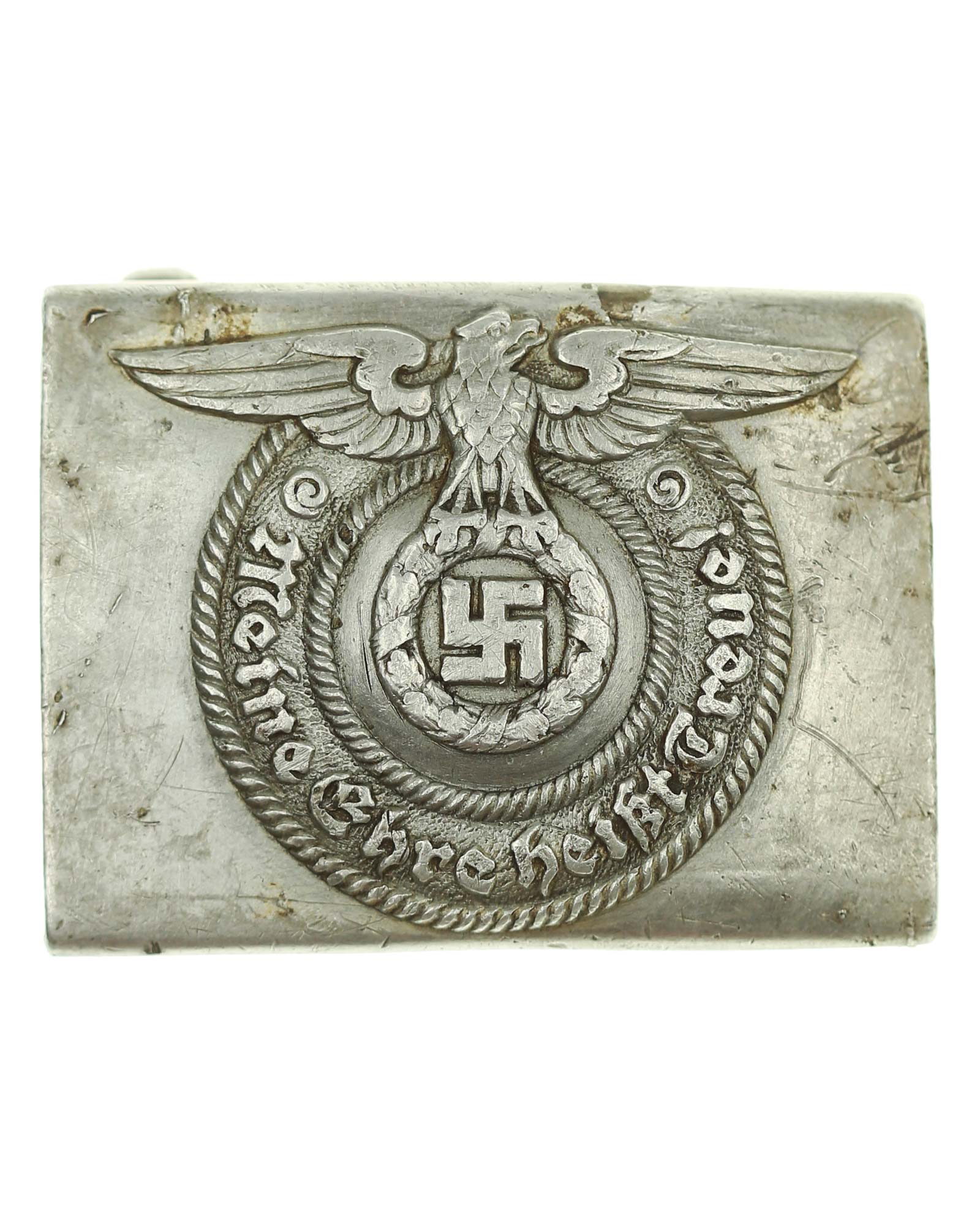 Waffen SS enlisted belt buckle in aluminum design. On the front is the imperial eagle with a swastika and the inscription: Meine Ehre heißt Treue «My honor is loyalty». Reverse with the RZM manufacturer: RZM 36/38 SS, Overhoff & Cie, Lüdenscheid. Waffen SS belt buckle in uncleaned condition as found. Total weight 22 g. Dimensions: 48,15 x 65,21 mm.