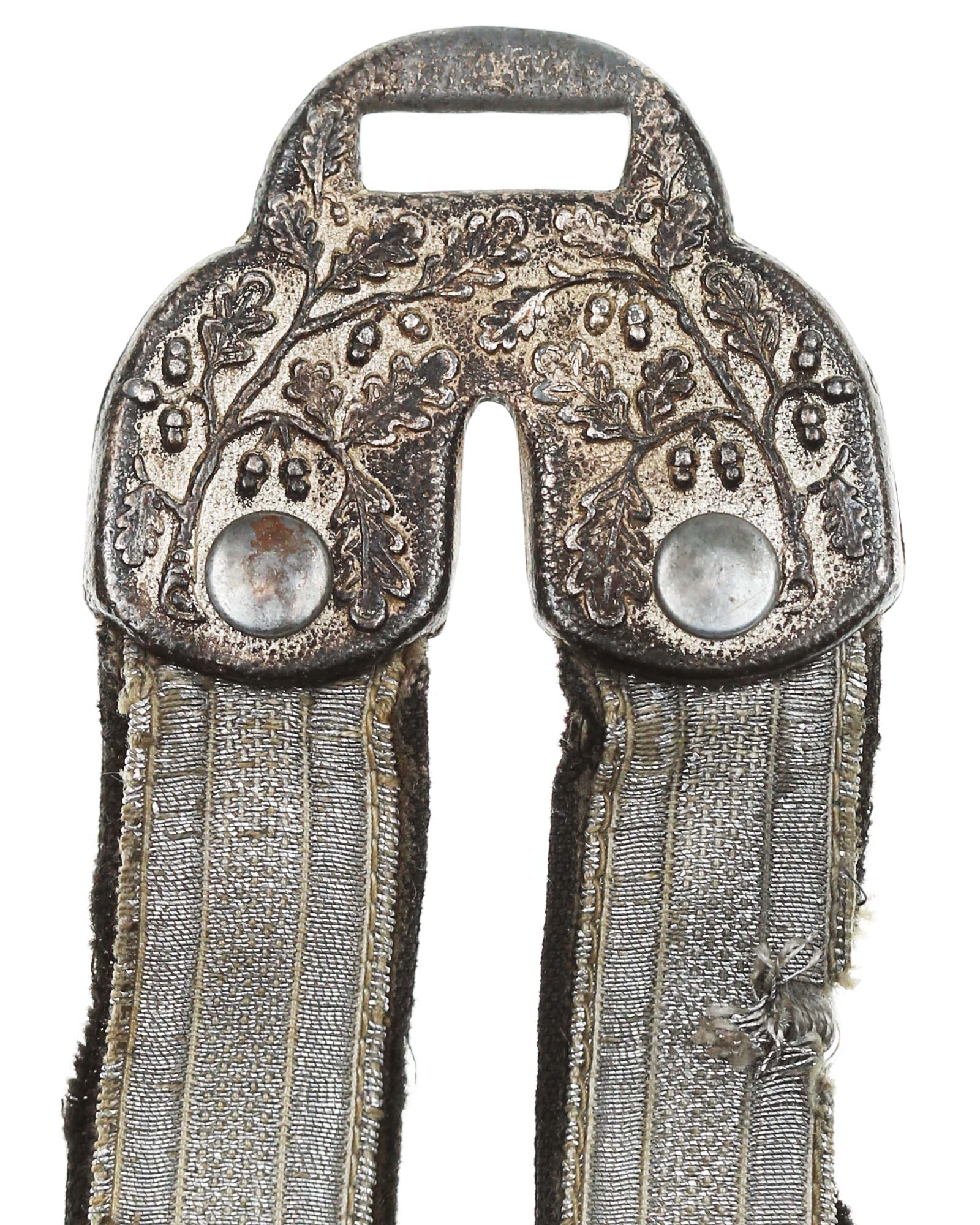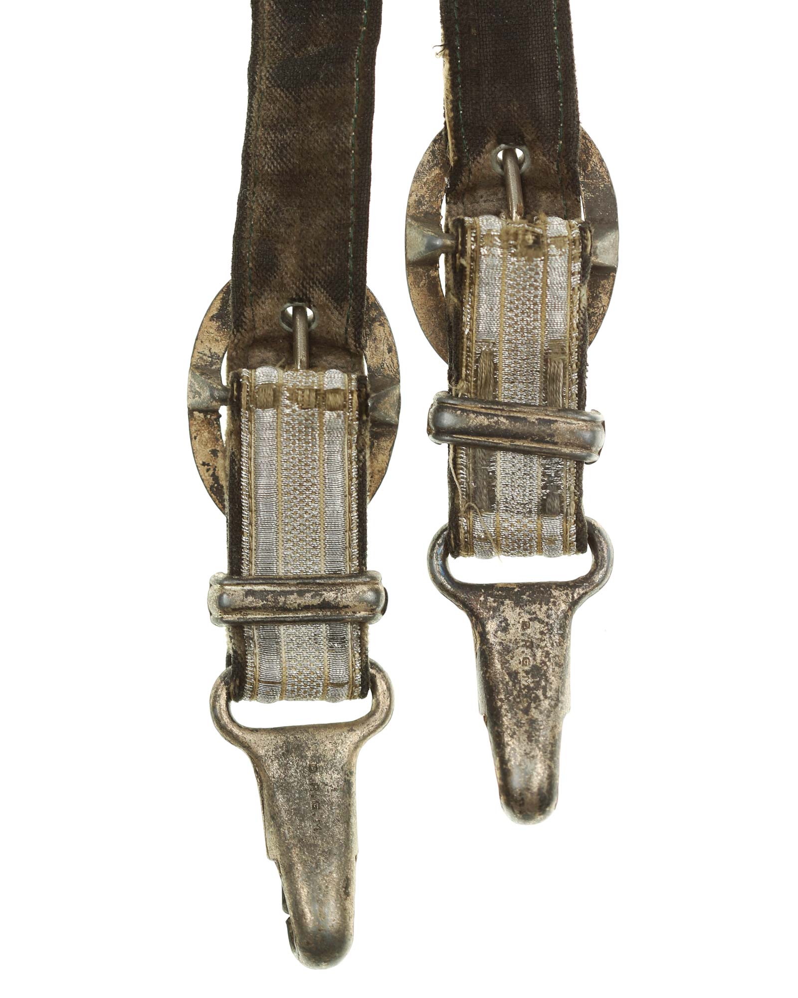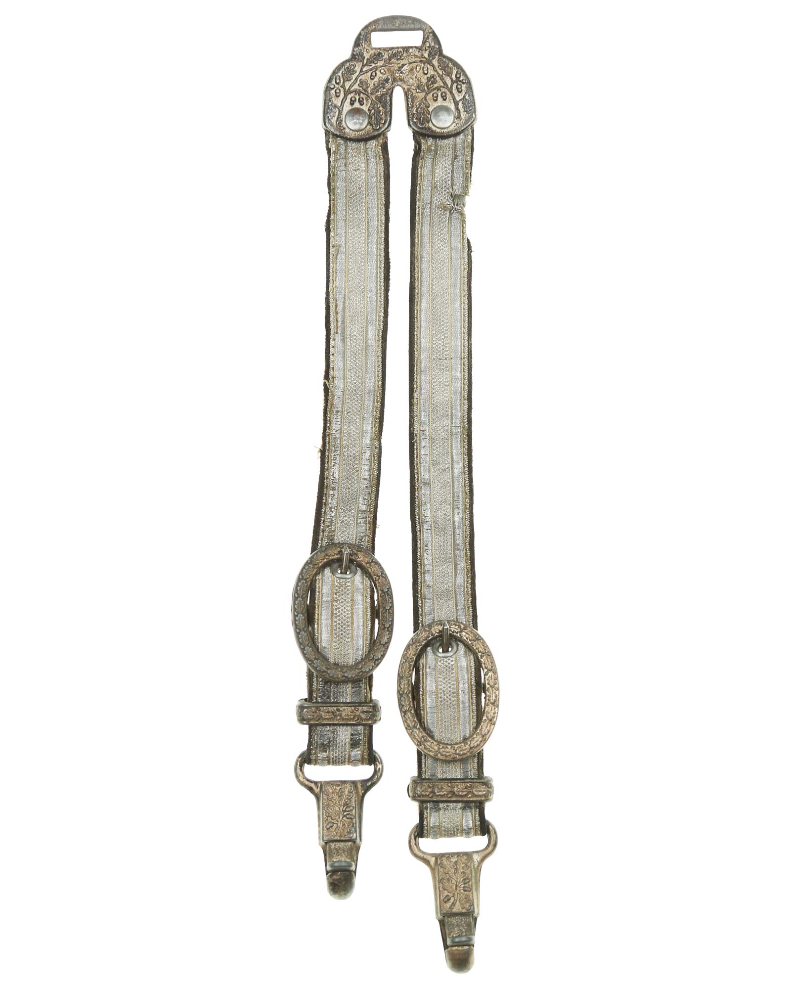 Hangers for Army Officer’s Dagger in Deluxe-Edition. Two-piece silver hanger cast lined. Back marked with DRGM. Totel lenght 28 cm.