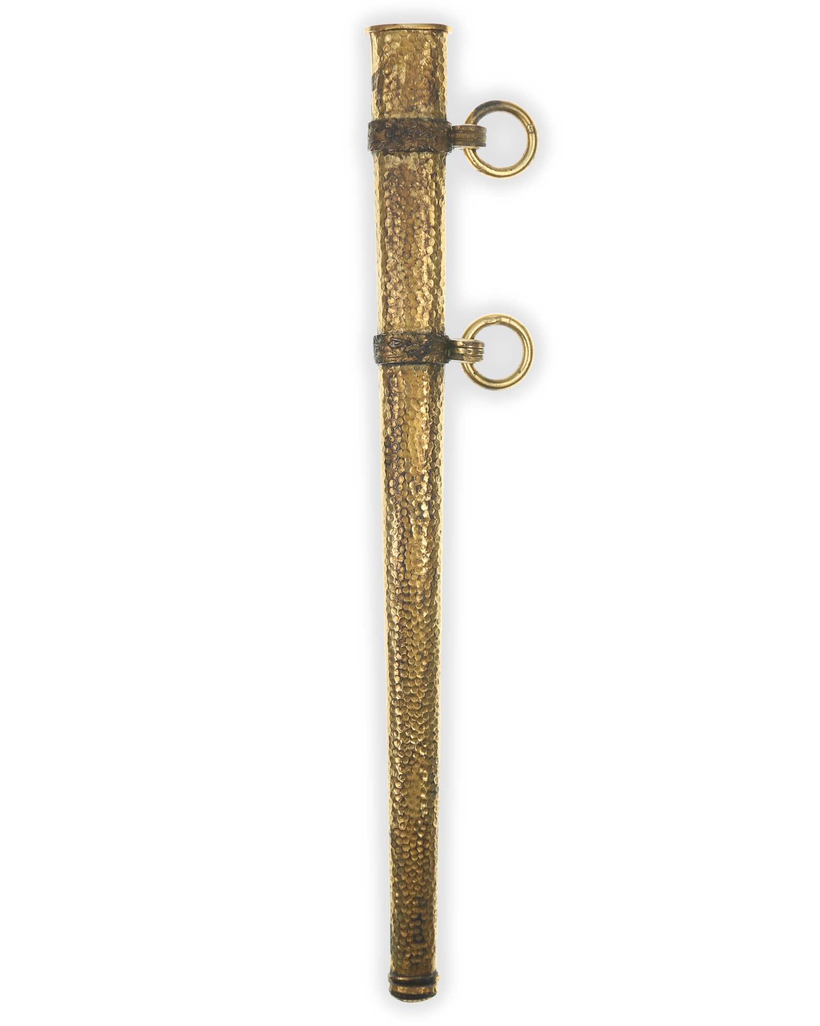 The scabbard is straight throughout and has an excellent hammered finish. This finish is nicely set off by the straight-across bands. These bands feature overlapping oak leaves with acorns in between and show only mild wear. The eyelets have the hammered finish.