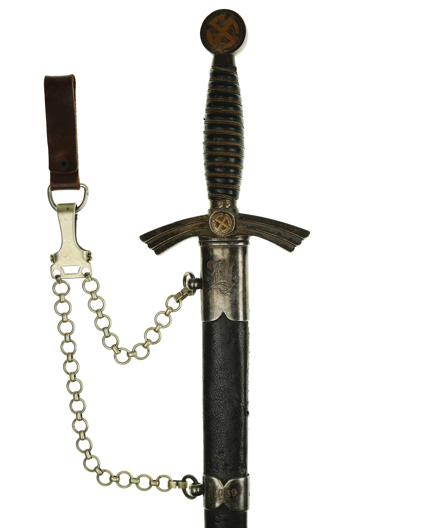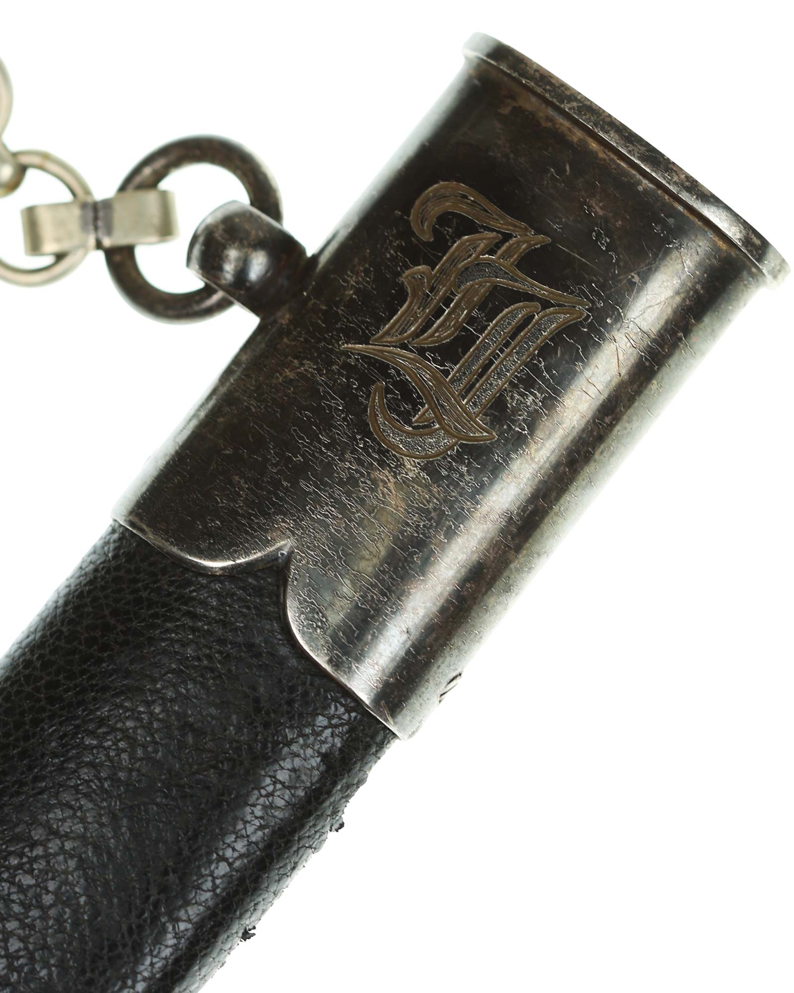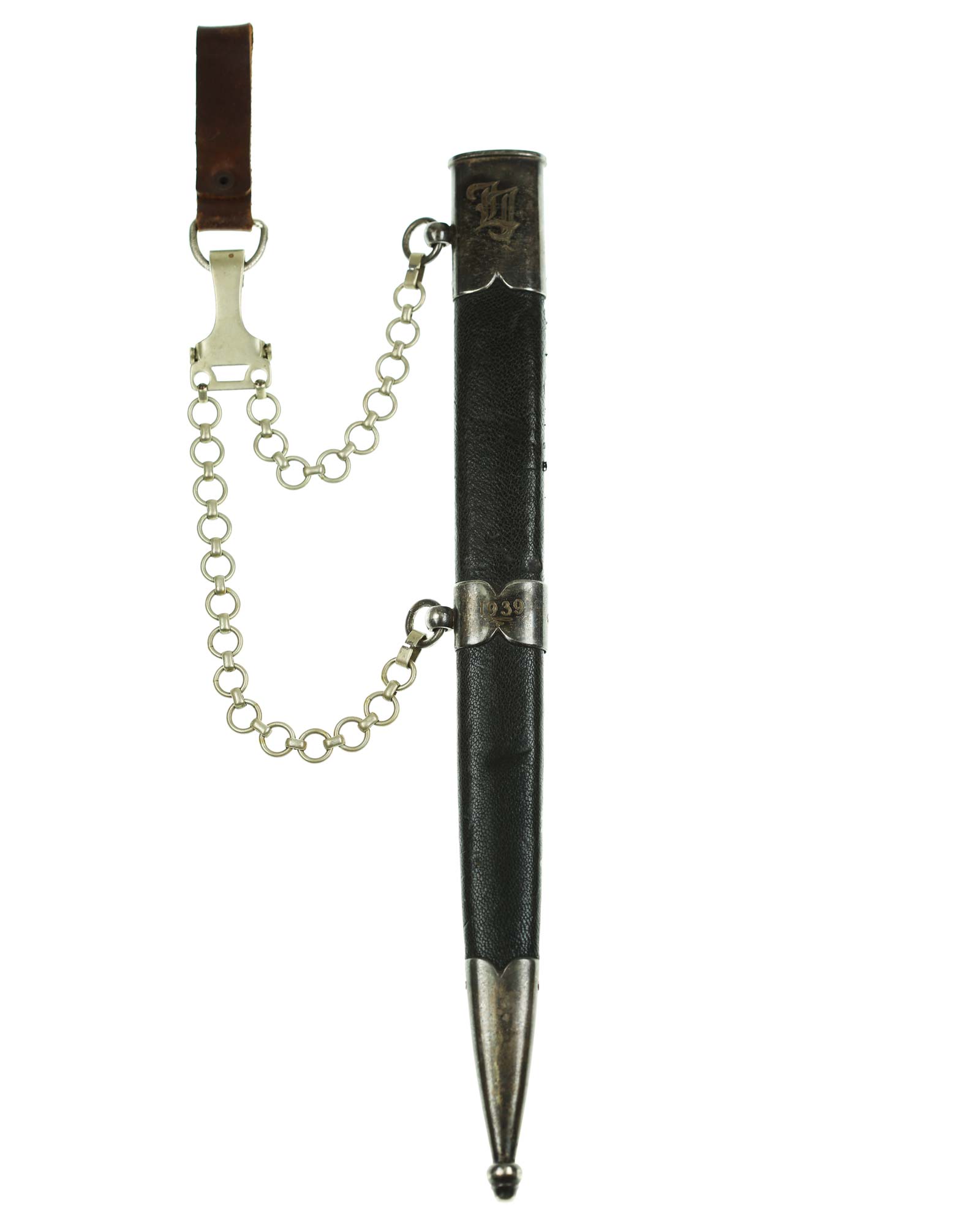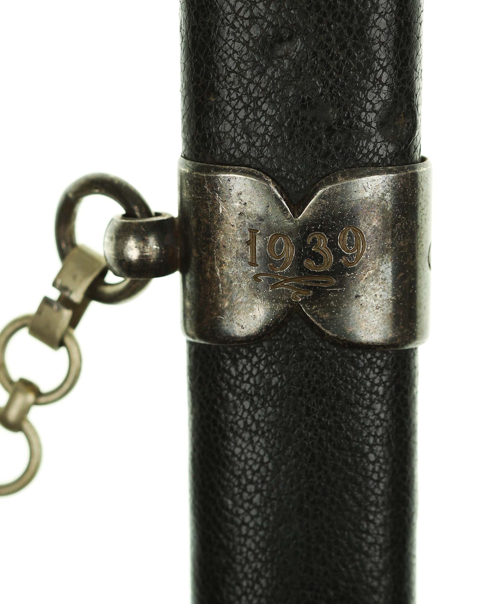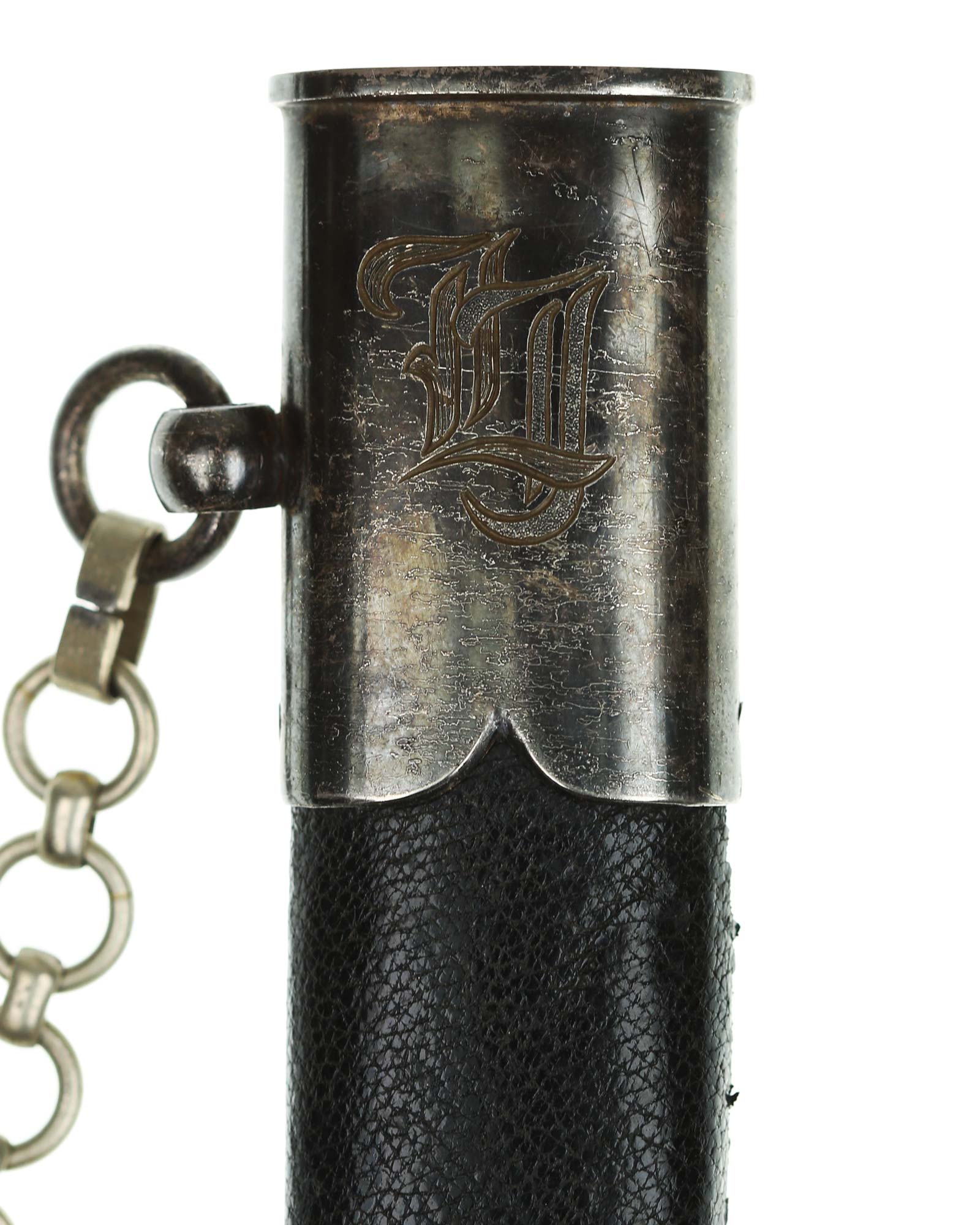 Scabbard: The scabbard shell is straight throughout. This scabbard is also covered in matching blue Moroccan leather. The silvered solid nickel scabbard mounts are also in Near Mint condition. All scabbard mounts are decorated, reverse is with Initial LJ - 1939. The mounts are retained by headless flush mounted screws. The solid nickel chain is in fine condition. The chain has the usual nine upper and fourteen lower links and are connected to an unmarked snap clip.