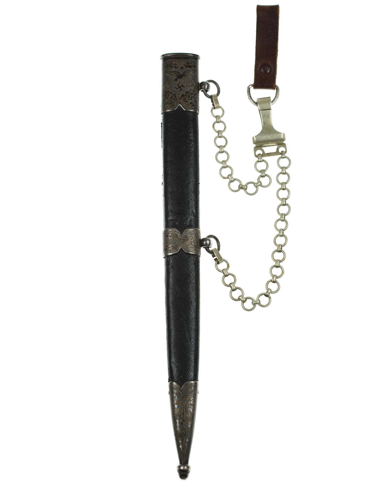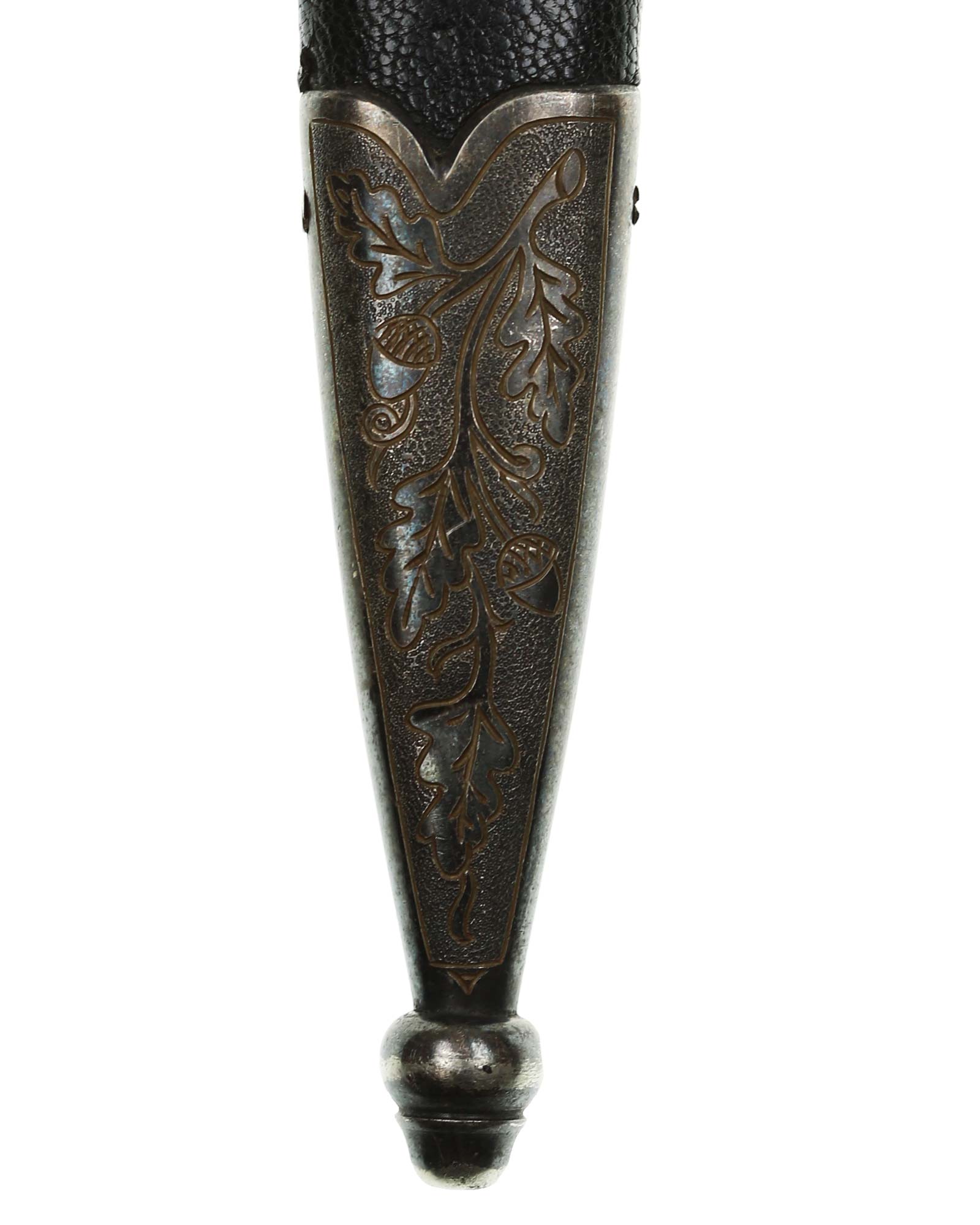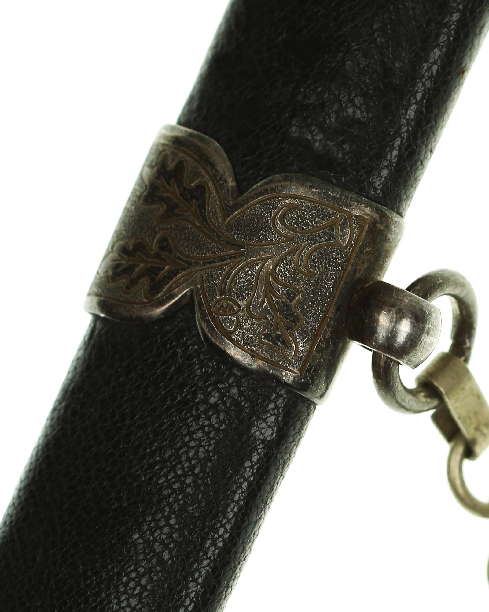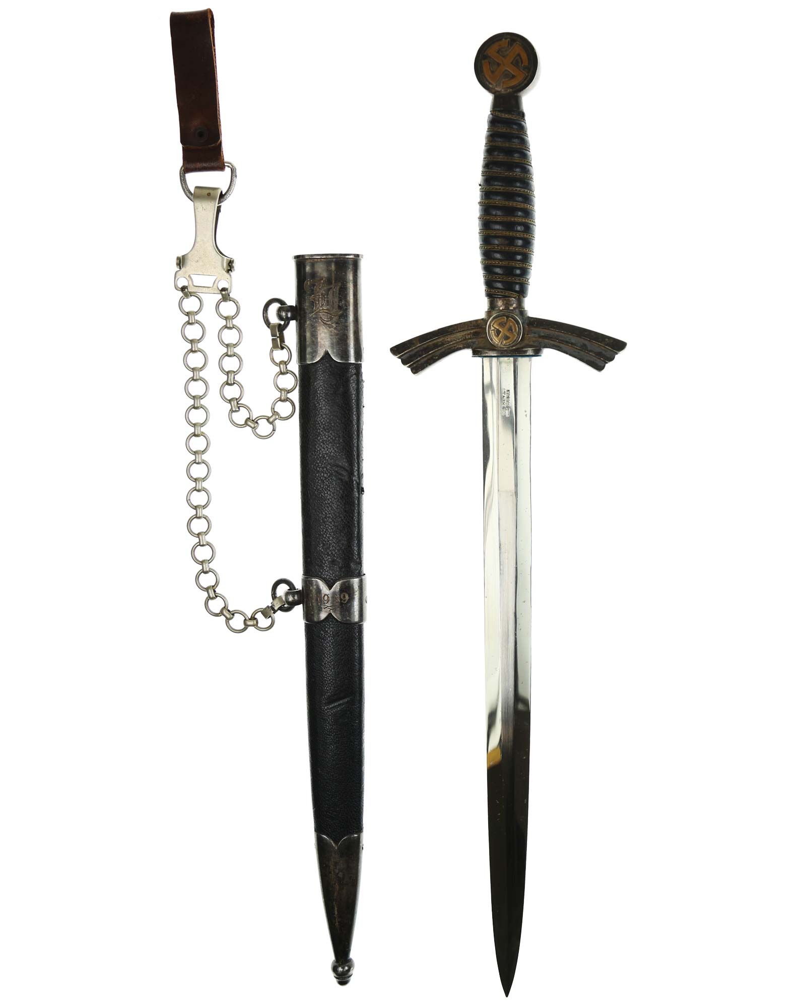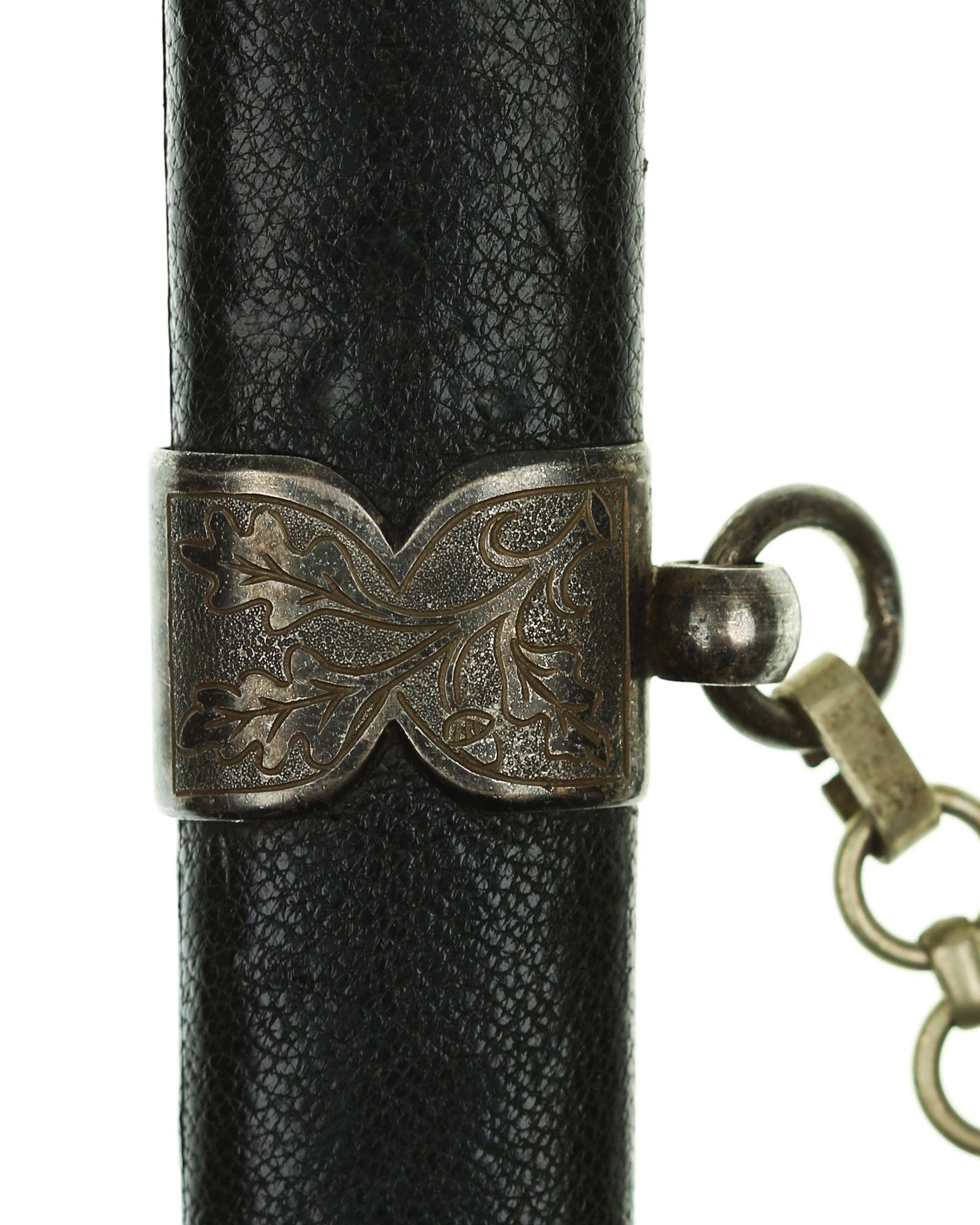 Scabbard: The scabbard shell is straight throughout. This scabbard is also covered in matching blue Moroccan leather. The silvered solid nickel scabbard mounts are also in Near Mint condition. All scabbard mounts are decorated, reverse is with Initial LJ - 1939. The mounts are retained by headless flush mounted screws. The solid nickel chain is in fine condition. The chain has the usual nine upper and fourteen lower links and are connected to an unmarked snap clip.