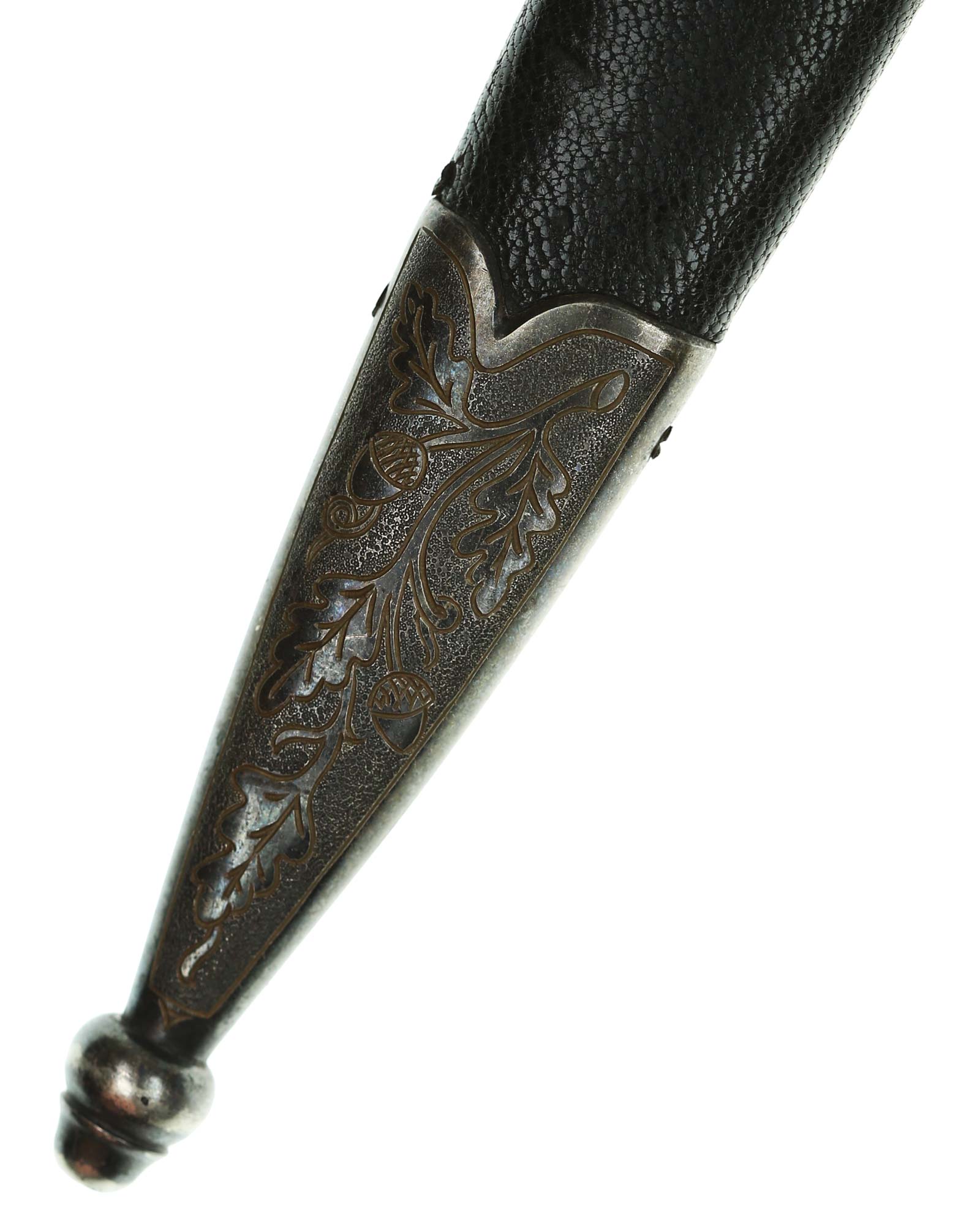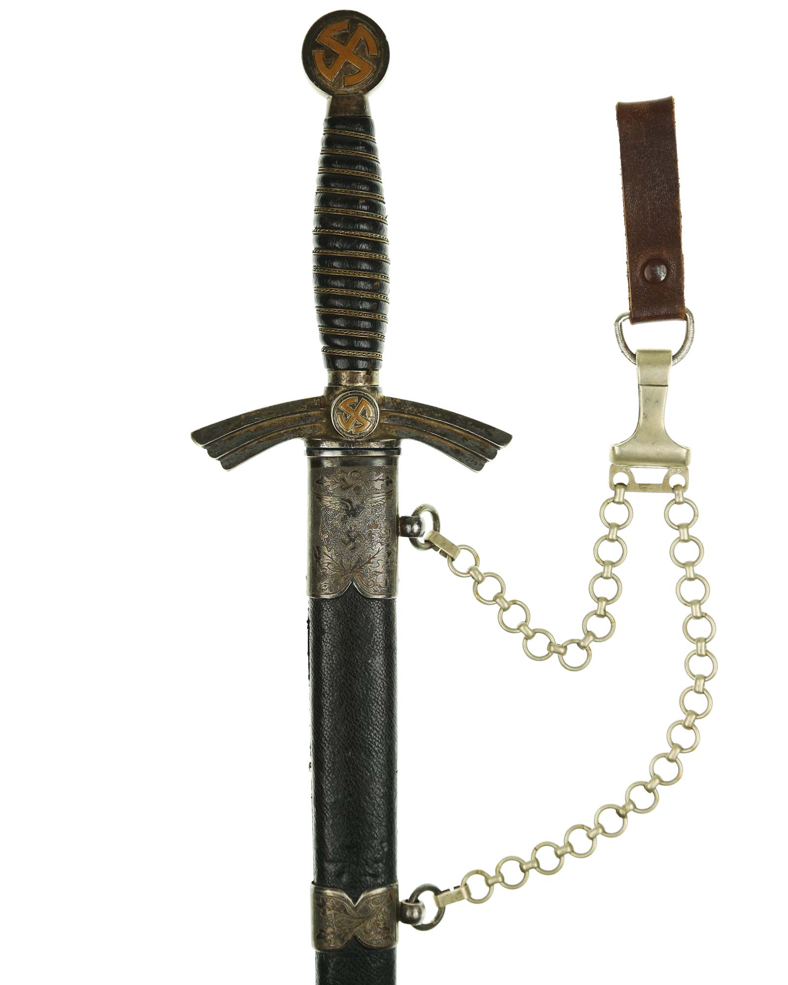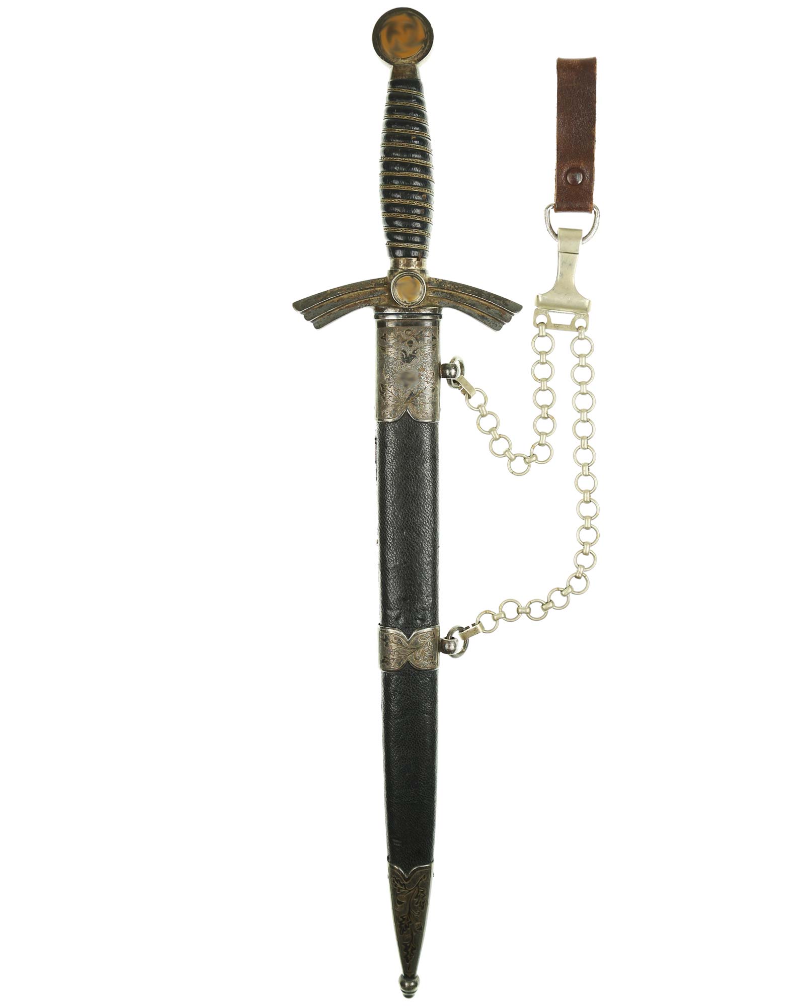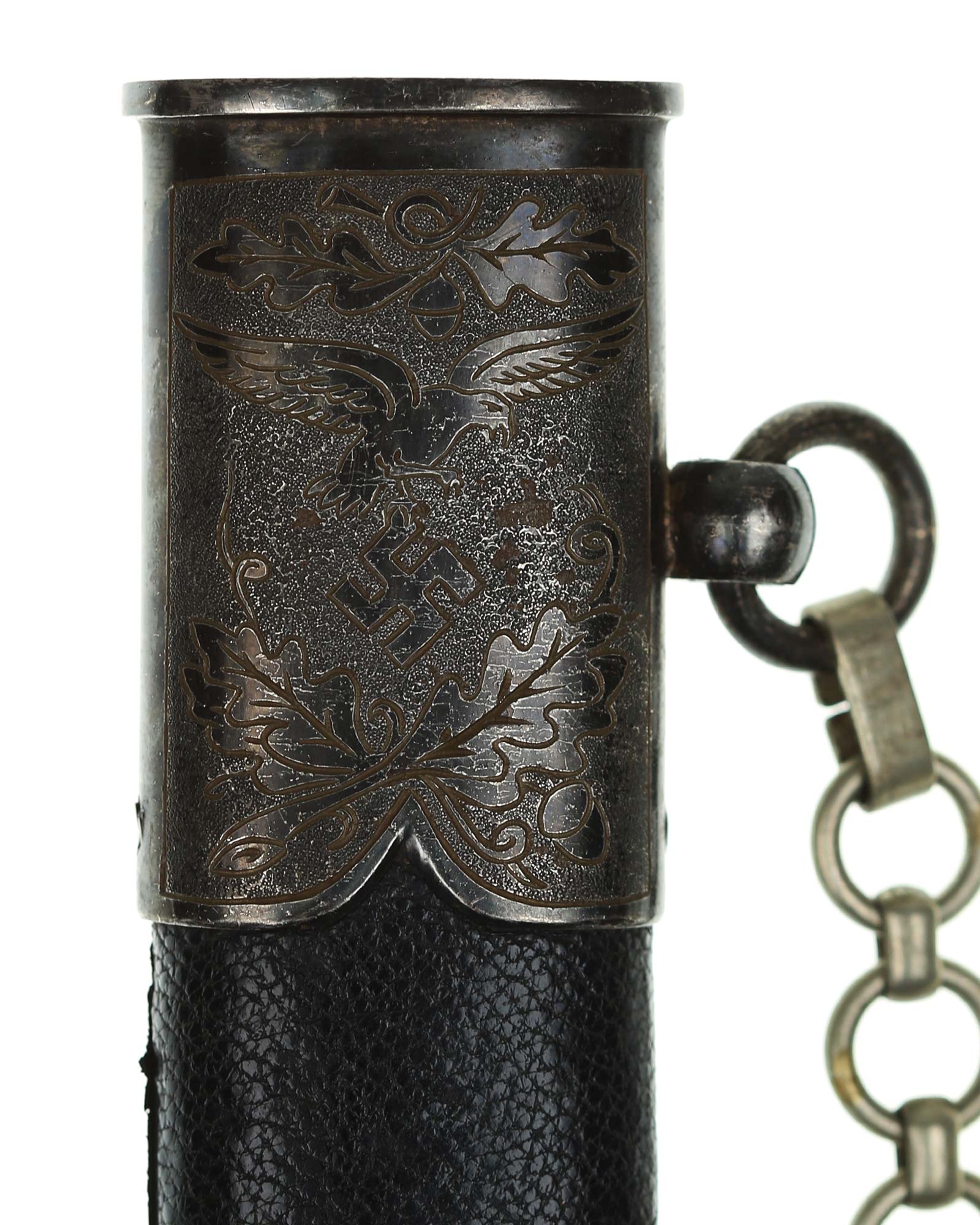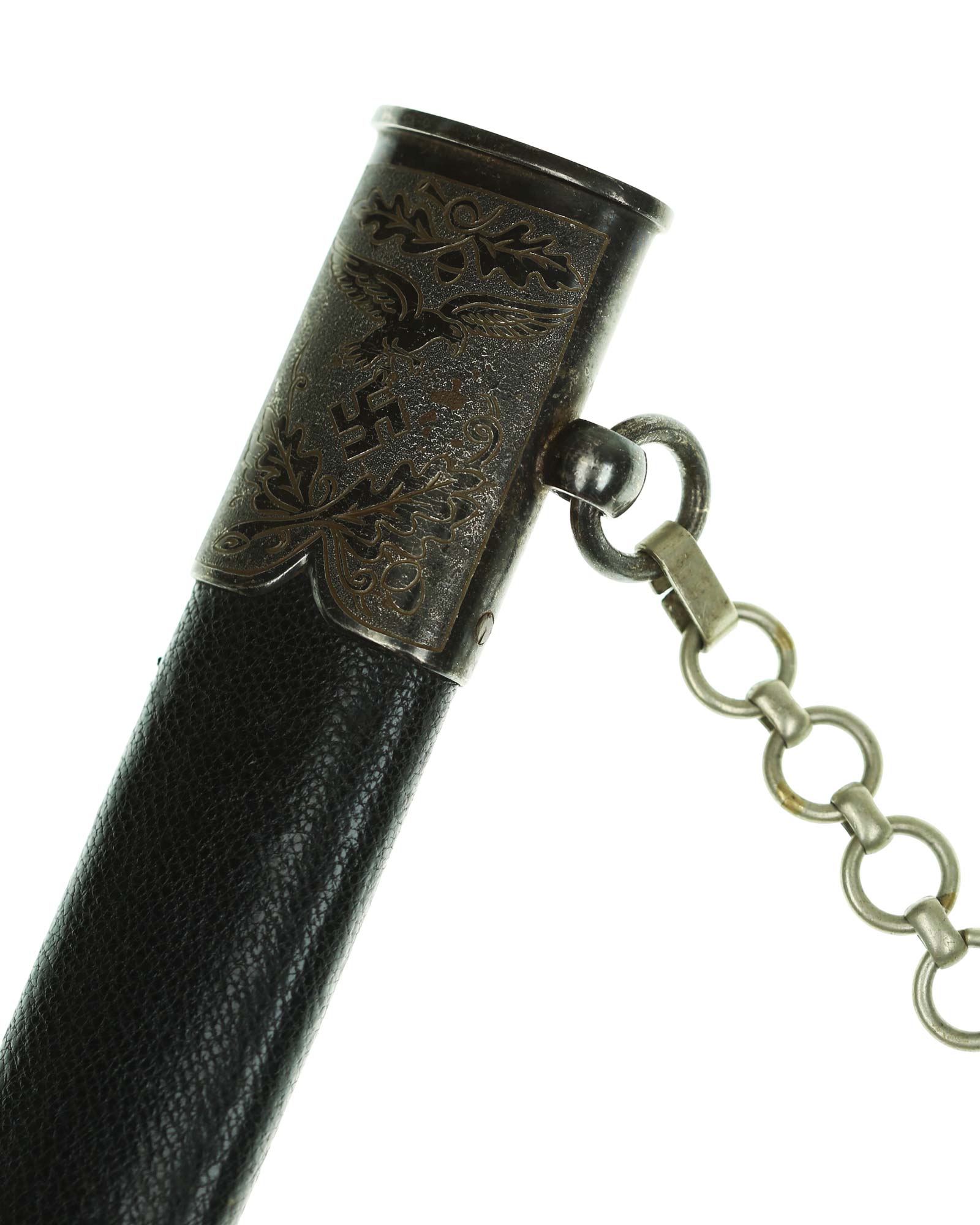 Scabbard: The scabbard shell is straight throughout. This scabbard is also covered in matching blue Moroccan leather. The silvered solid nickel scabbard mounts are also in Near Mint condition. All scabbard mounts are decorated, reverse is with Initial LJ - 1939. The mounts are retained by headless flush mounted screws. The solid nickel chain is in fine condition. The chain has the usual nine upper and fourteen lower links and are connected to an unmarked snap clip.