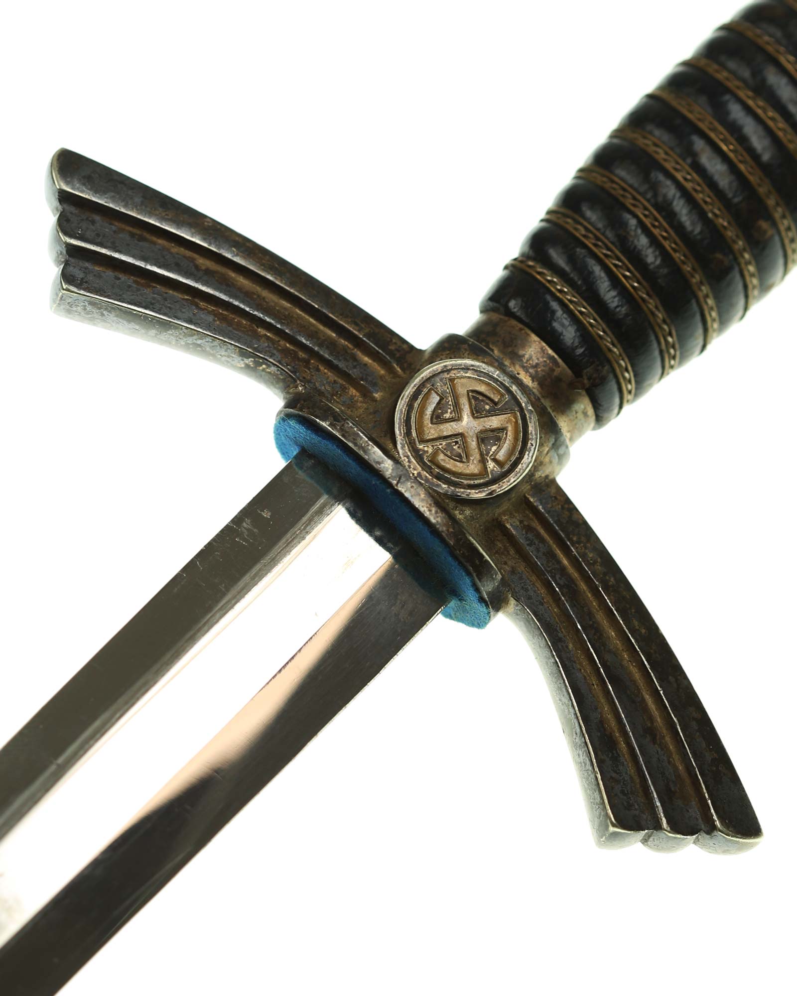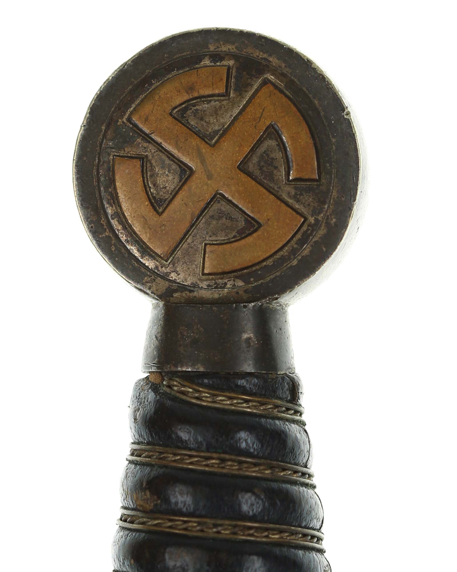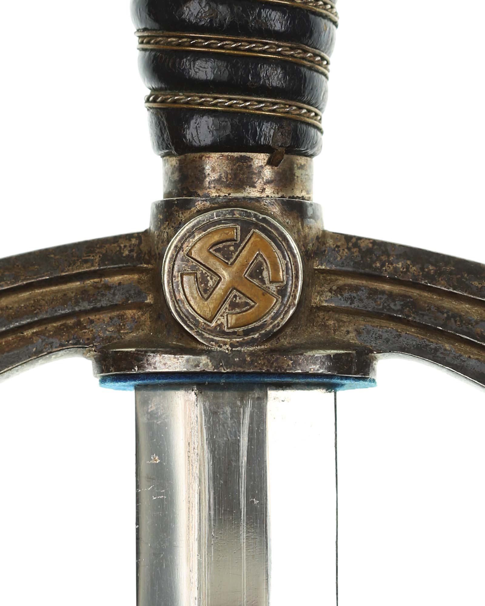 Grip: The grip is of hand carved wood covered in dark blue Moroccan leather. This leather is still in very fine condition throughout. This grip is tightly wrapped with triple strands of fine brass wire, the center strand being twisted. The pommel is in choice condition, showing little (if any) signs of wear and with full silvering between the legs of the sunwheels. The same is true of the crossguard sunwheels. The original gilded brass finish of the sunwheels are is in terrific condition, and sits in stark contrast against the darkly patinated silvering.