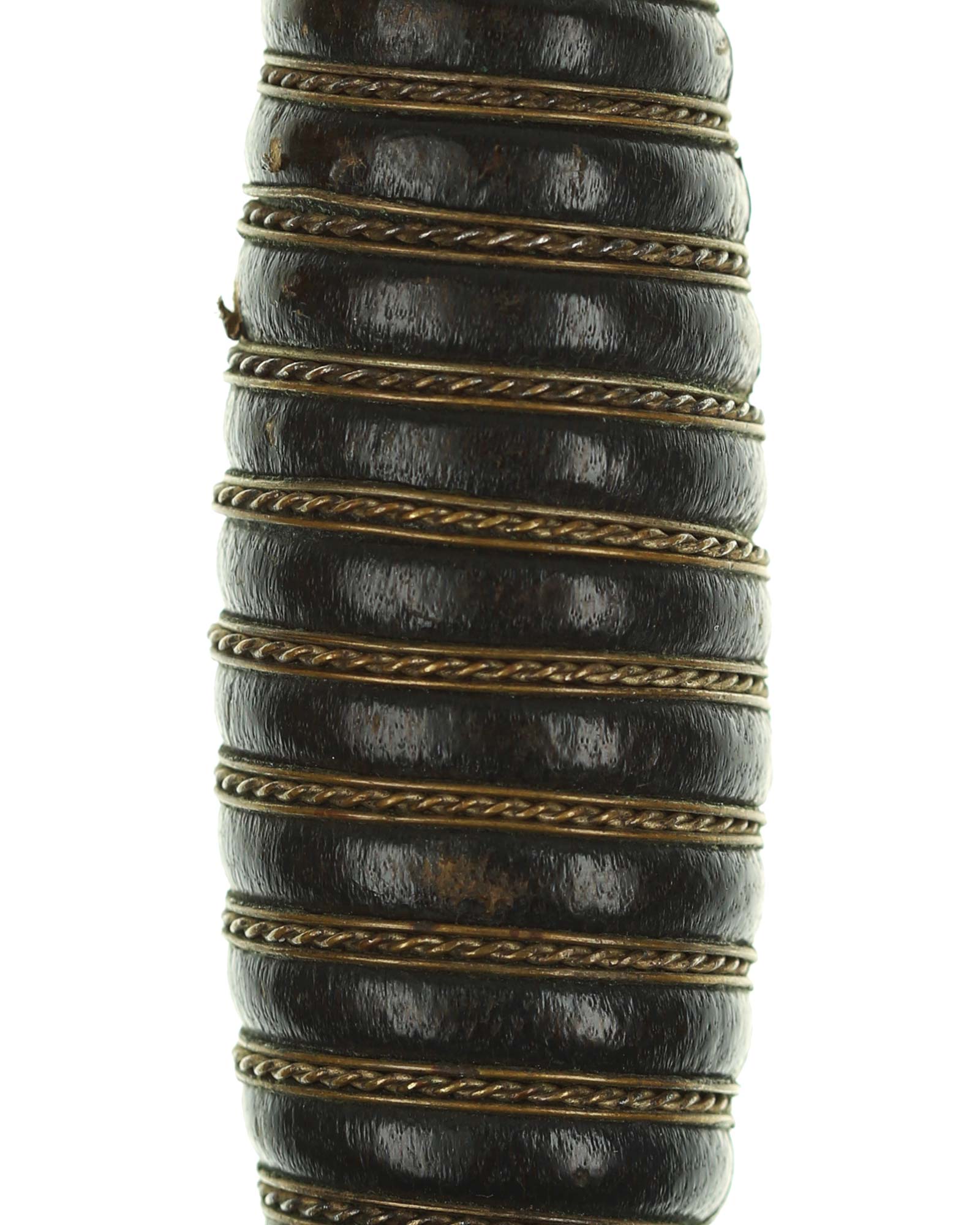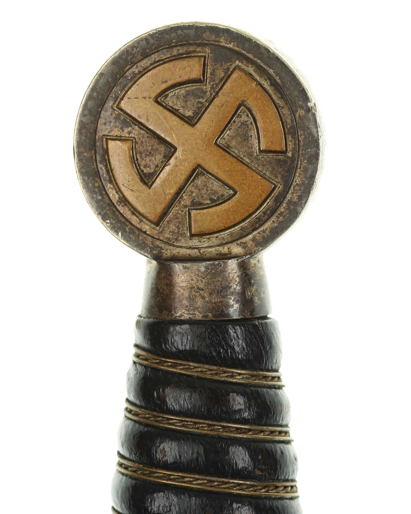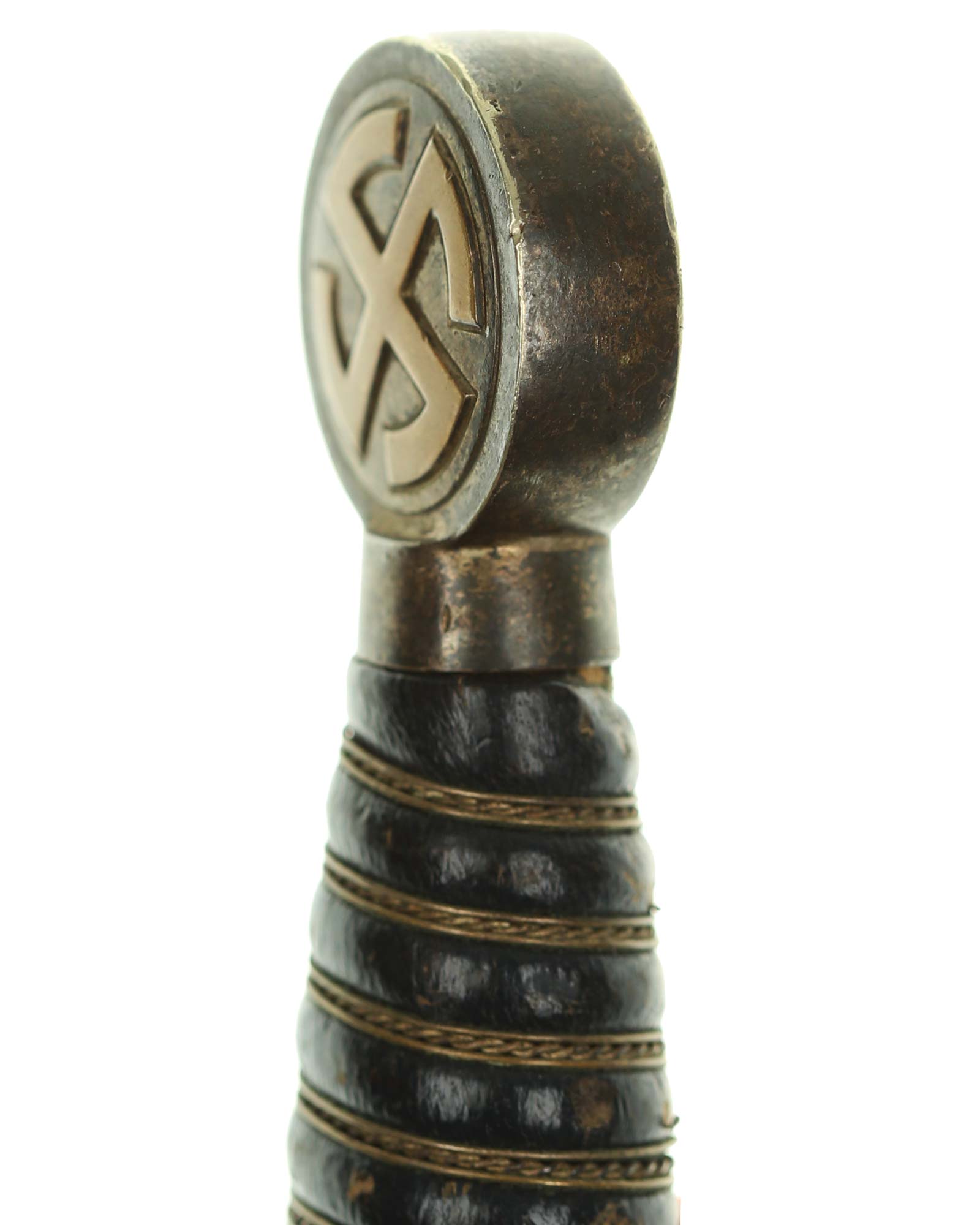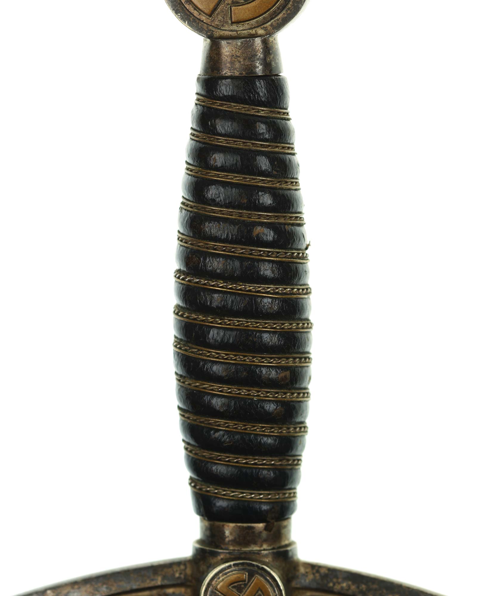 Grip: The grip is of hand carved wood covered in dark blue Moroccan leather. This leather is still in very fine condition throughout. This grip is tightly wrapped with triple strands of fine brass wire, the center strand being twisted. The pommel is in choice condition, showing little (if any) signs of wear and with full silvering between the legs of the sunwheels. The same is true of the crossguard sunwheels. The original gilded brass finish of the sunwheels are is in terrific condition, and sits in stark contrast against the darkly patinated silvering.