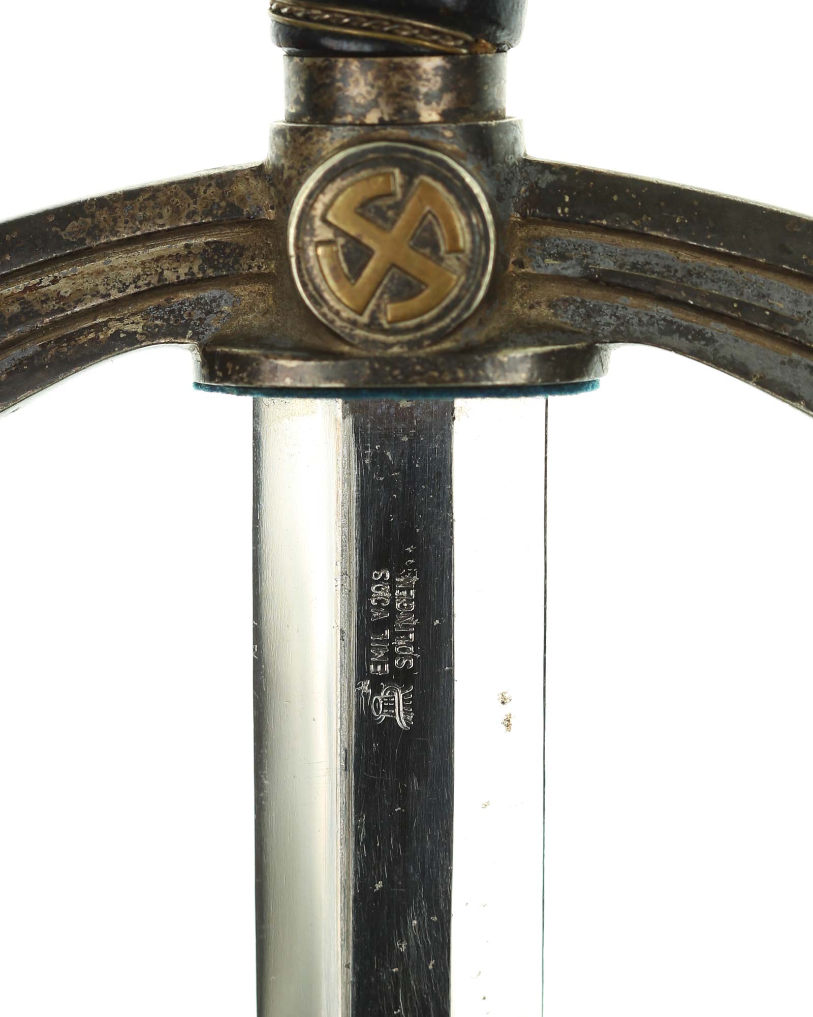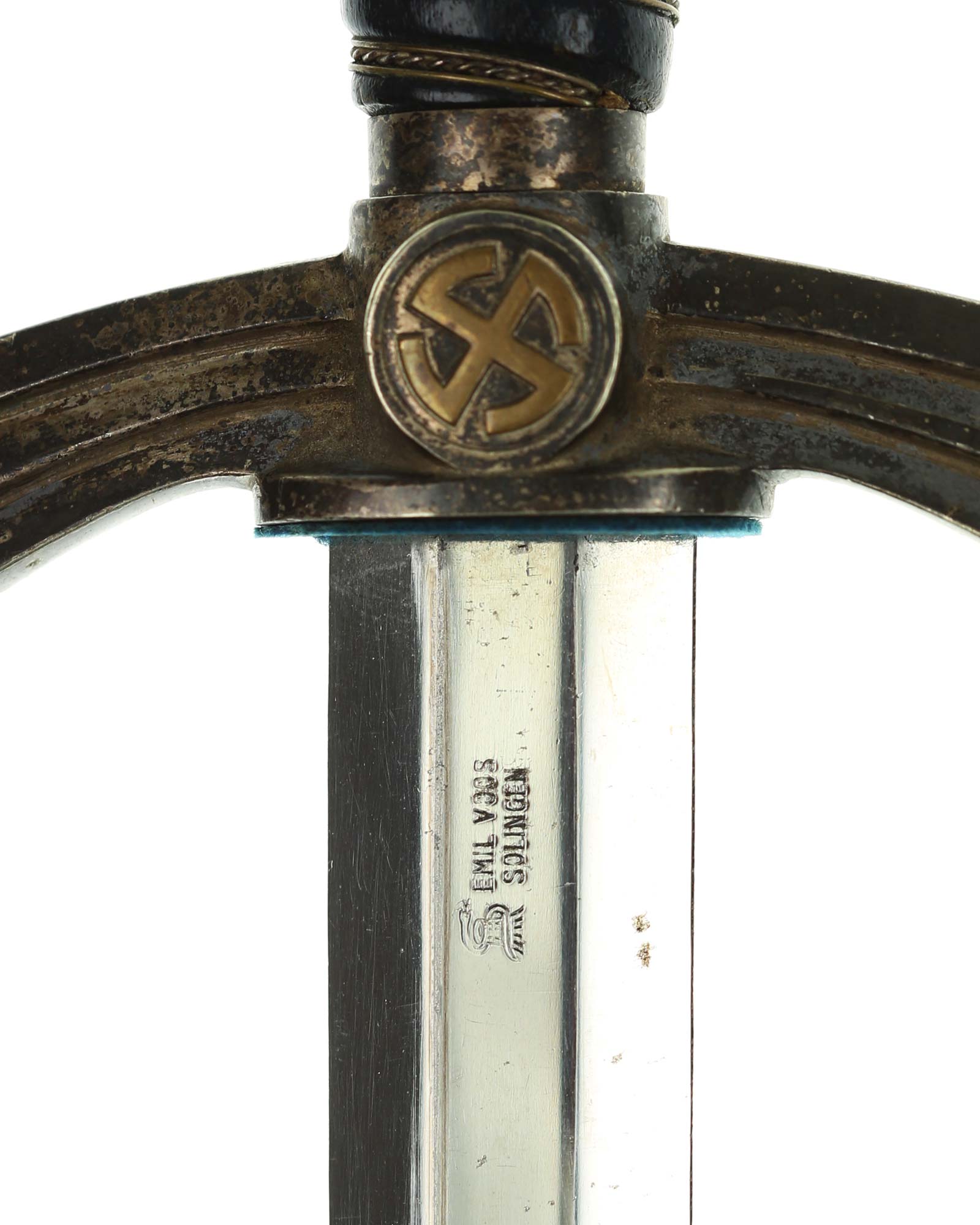 Blade: The blade is a truly fine example, with highest quality nickel-plating, mirror-bright and with a fine, needle-like tip. The reverse ricasso is stamped with Emil Voos Solingen trademark. The original blade buffer is intact and in place.