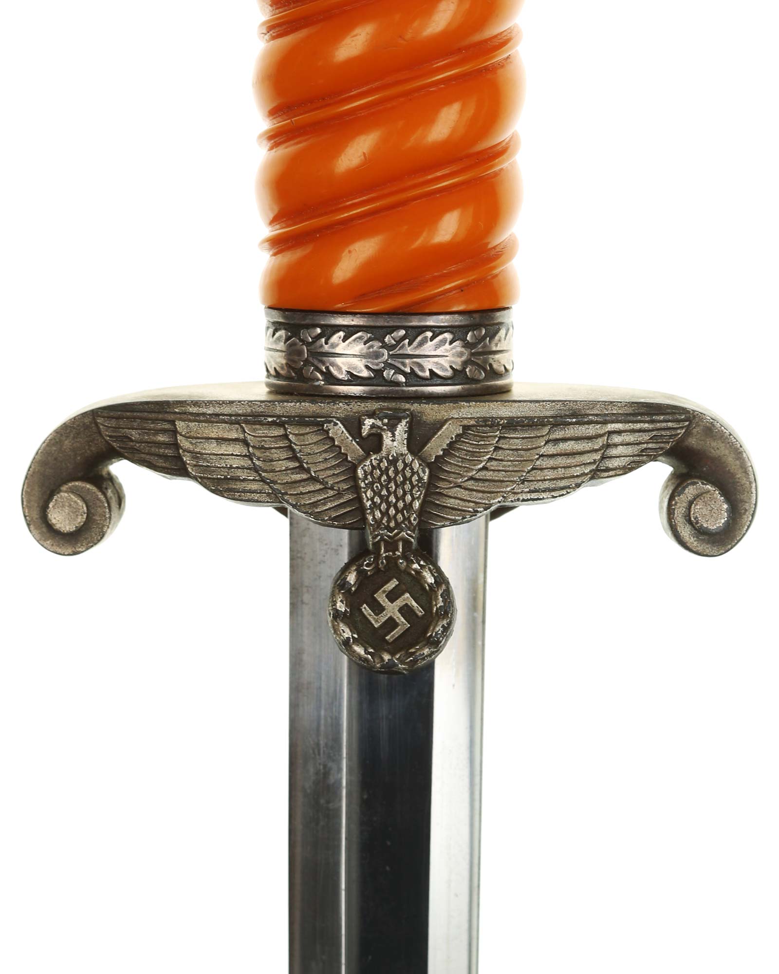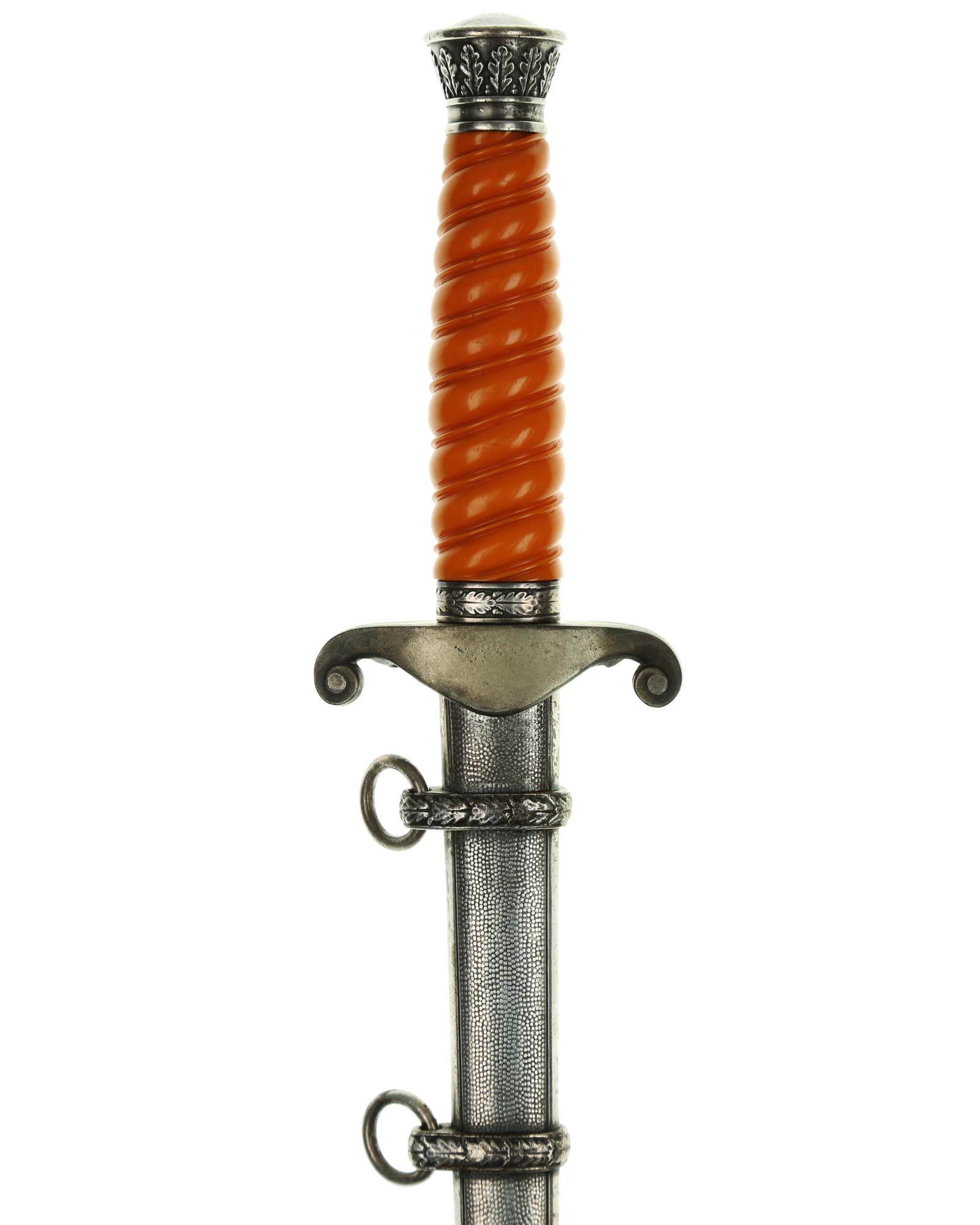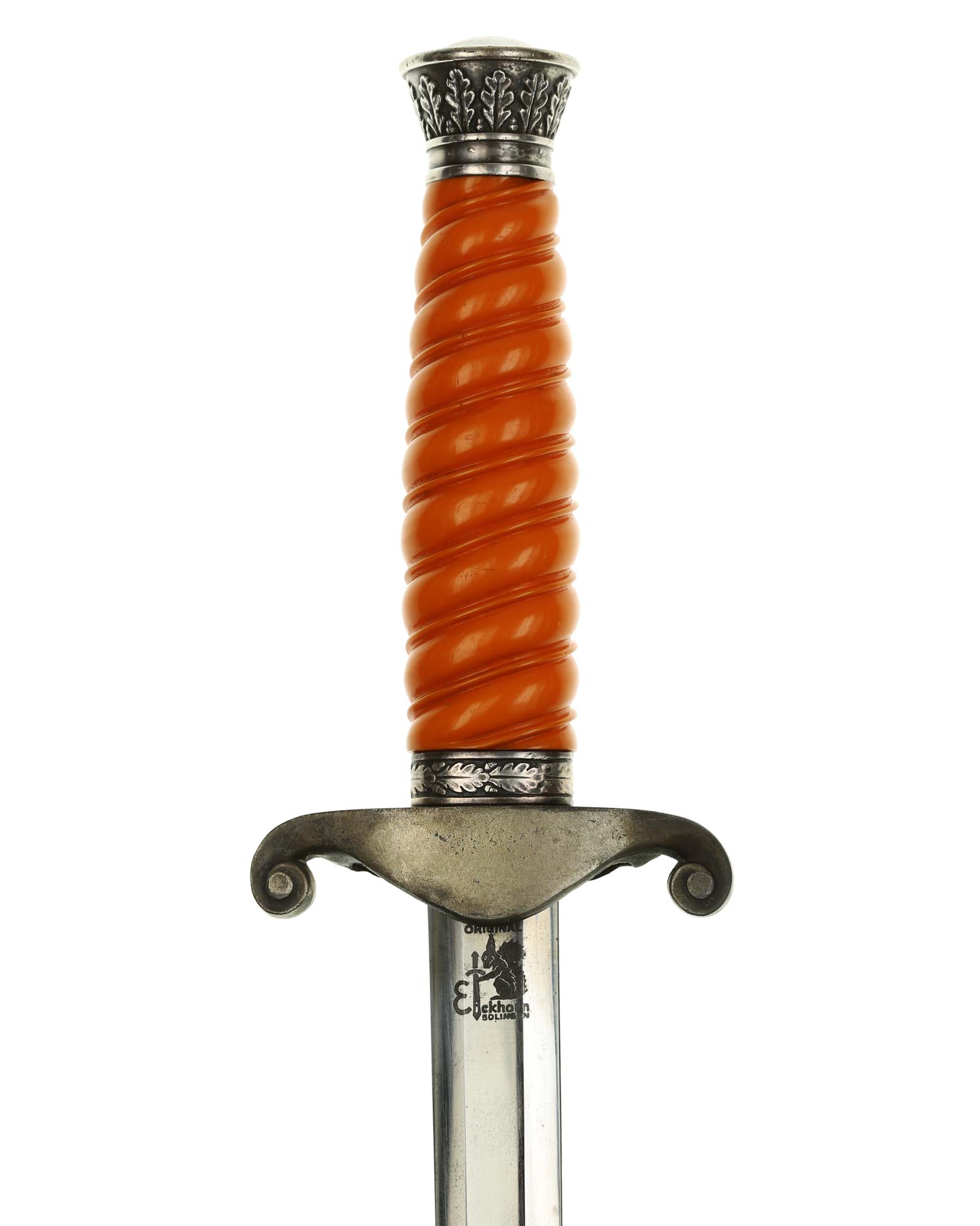 Grip: The grip of this dagger is a orange color and remains in nice condition. The pommel shows minor traces of carrying time on the upper end. The 12 standing oak leaves are in excellent condition, all having hand enhancement. The ferrule and crossguard eagle are the 1st Style. It shows virtually no wear and retains full, crisp detailing throughout.