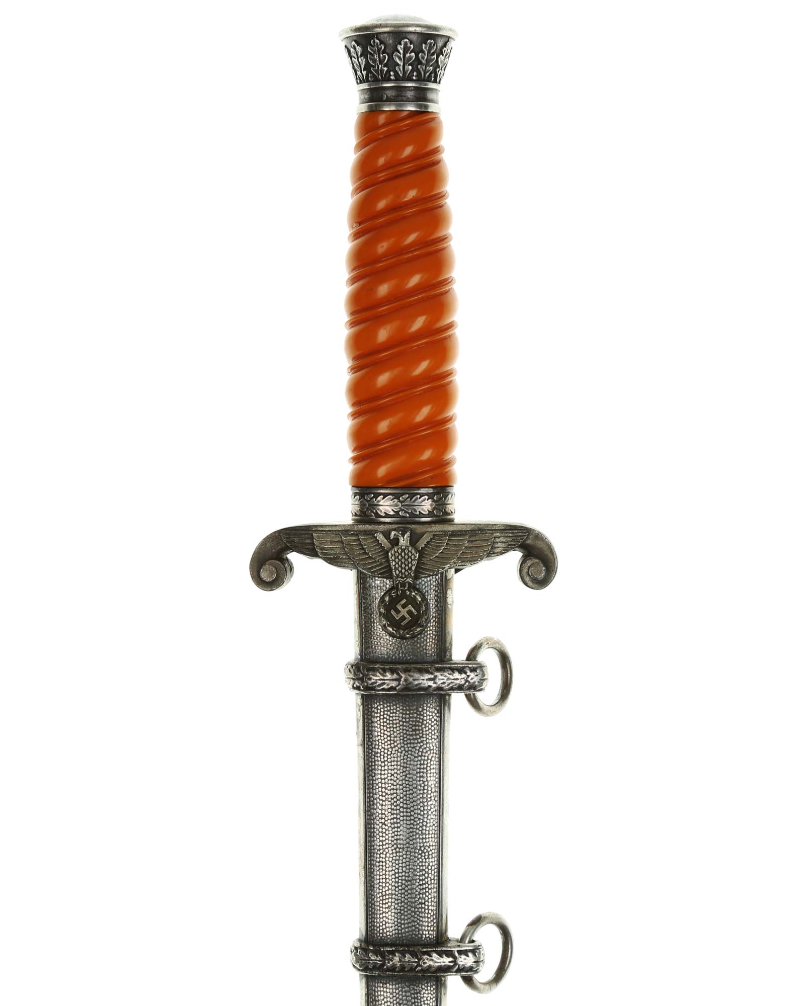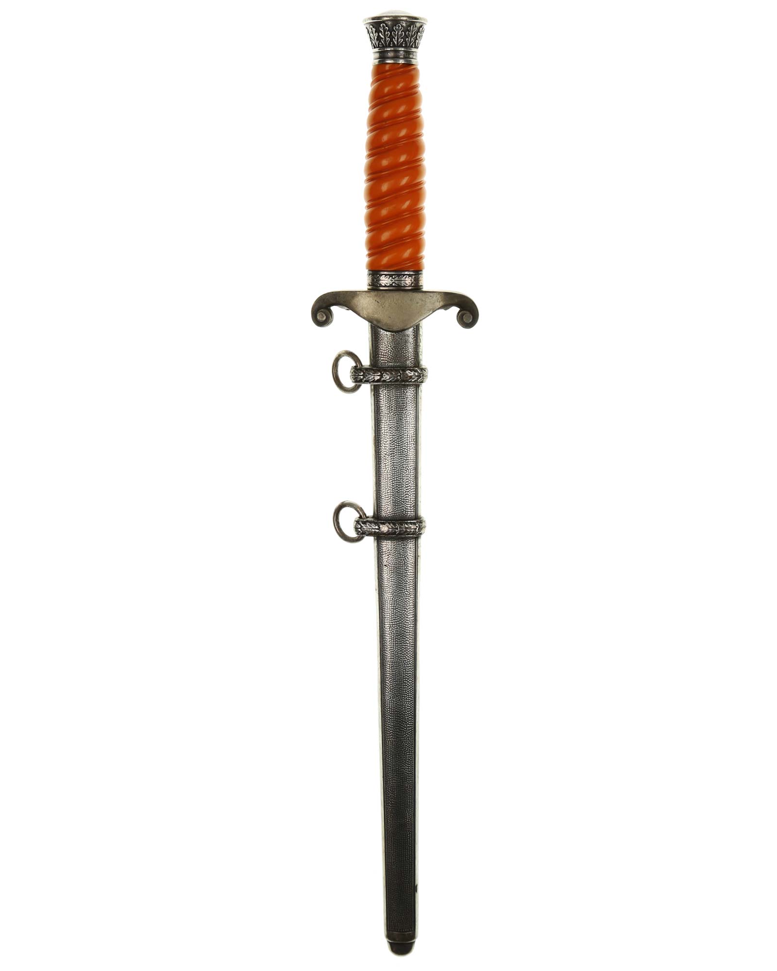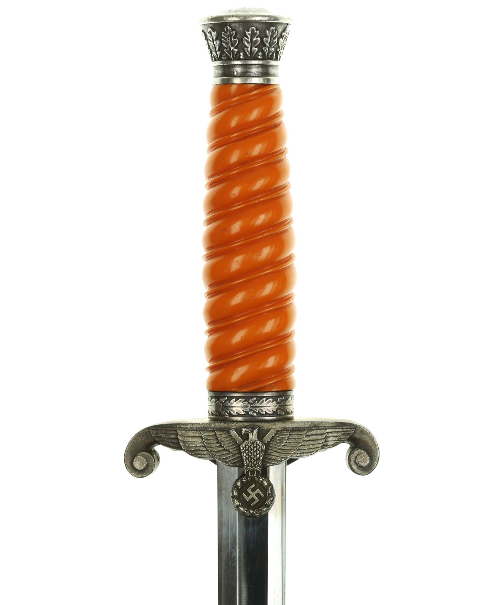 Grip: The grip of this dagger is a orange color and remains in nice condition. The pommel shows minor traces of carrying time on the upper end. The 12 standing oak leaves are in excellent condition, all having hand enhancement. The ferrule and crossguard eagle are the 1st Style. It shows virtually no wear and retains full, crisp detailing throughout.