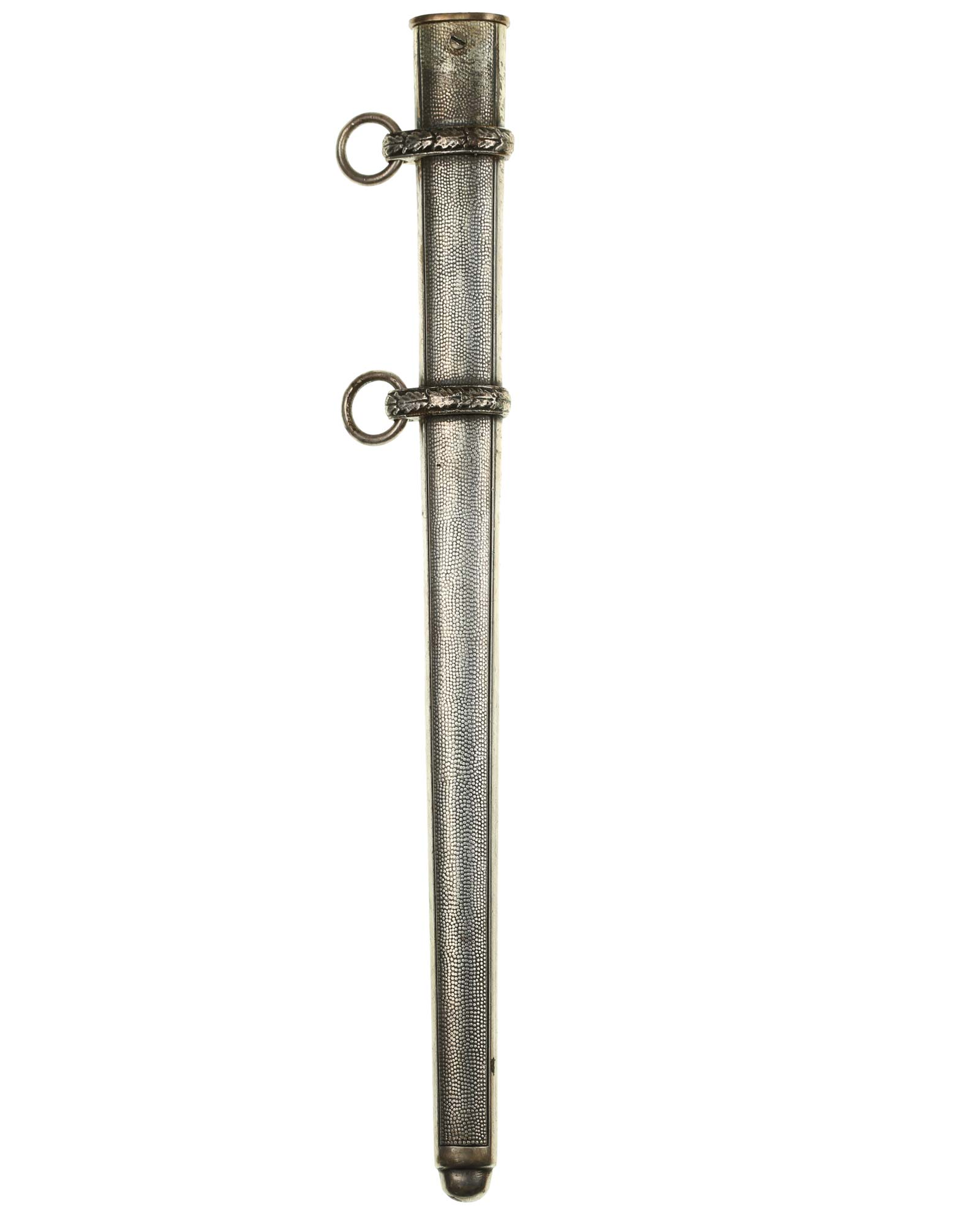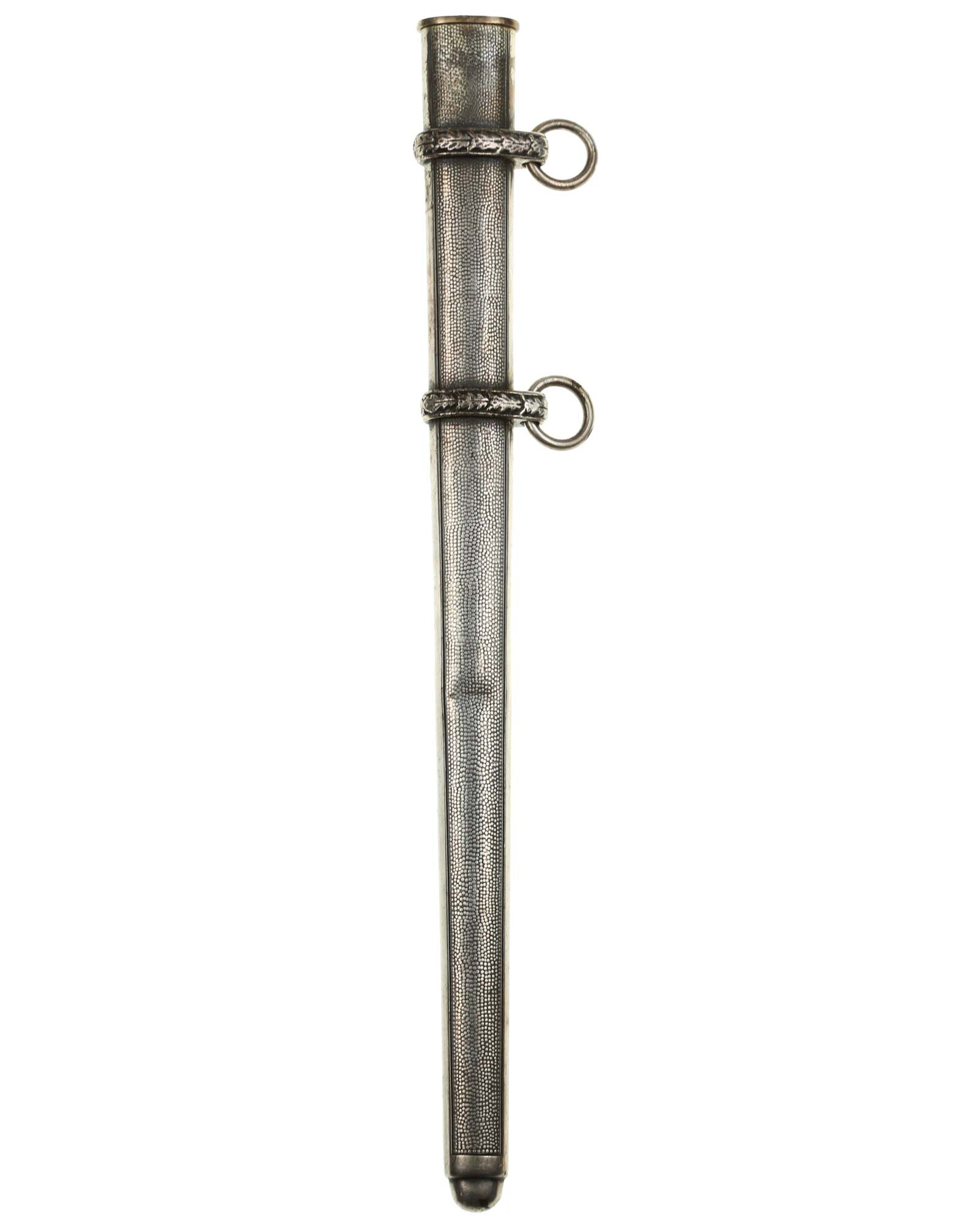 Scabbard: The scabbard is straight as an arrow. It retains its crisp pebbled panel design. There are frosted remains in the protected areas around the carrying bands. The bands are very fine with each overlapping oak leaf reflecting hand-enhancing. The thick-style throat is retained by a single screw in the reverse center.