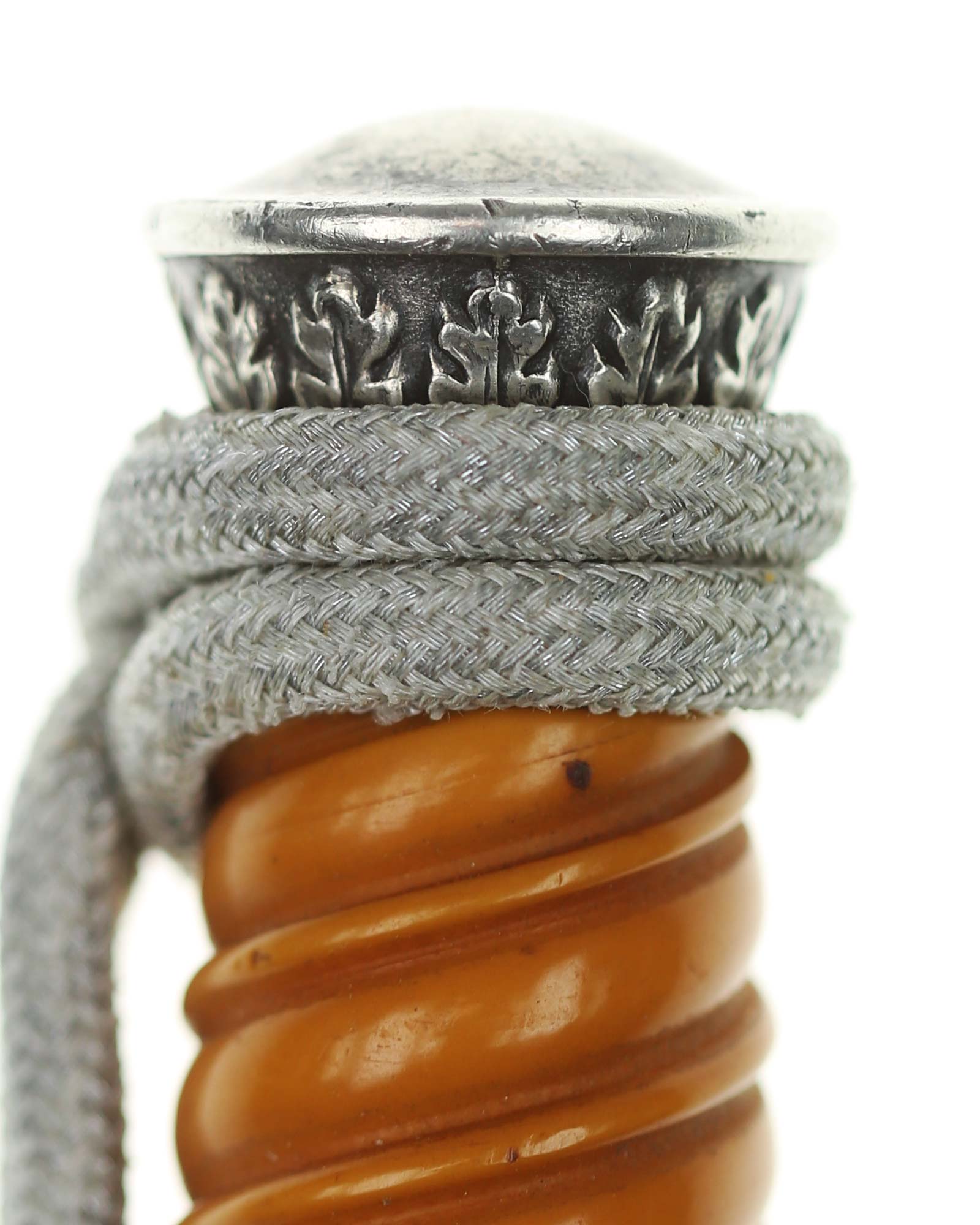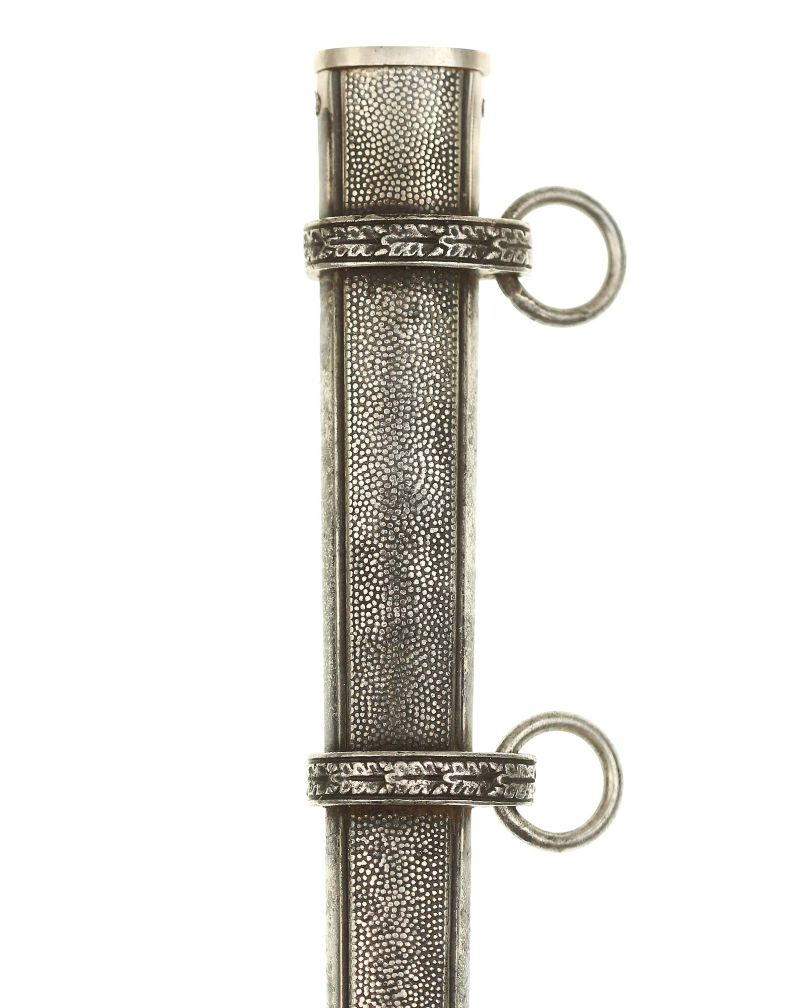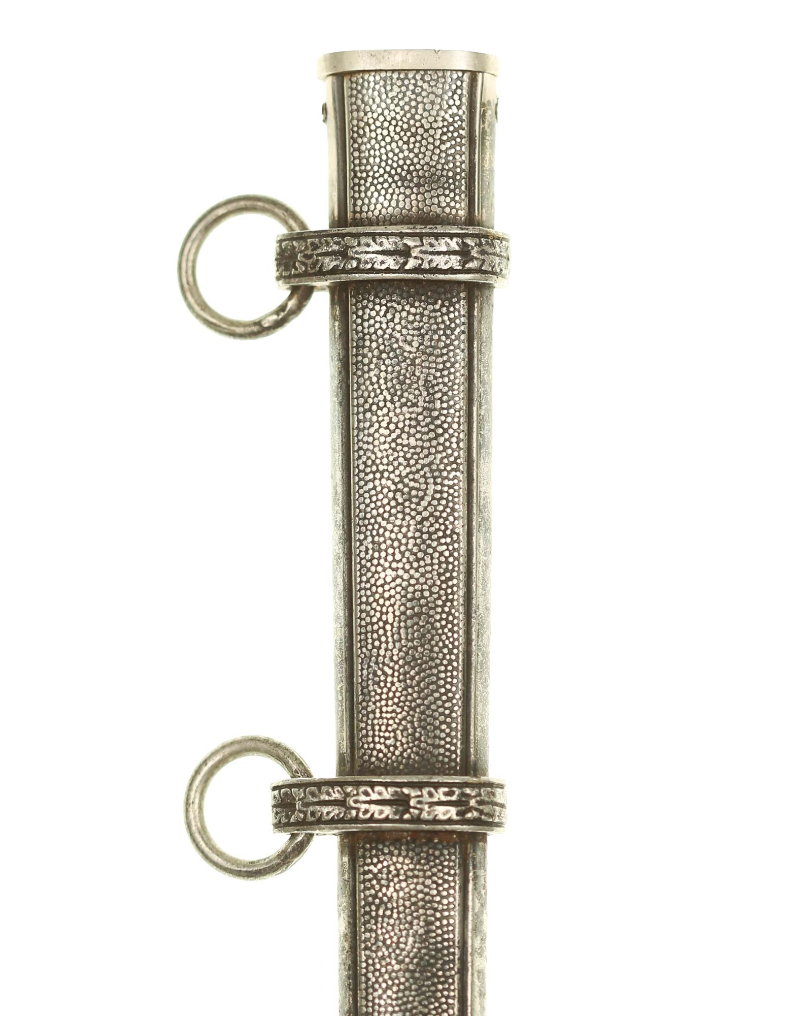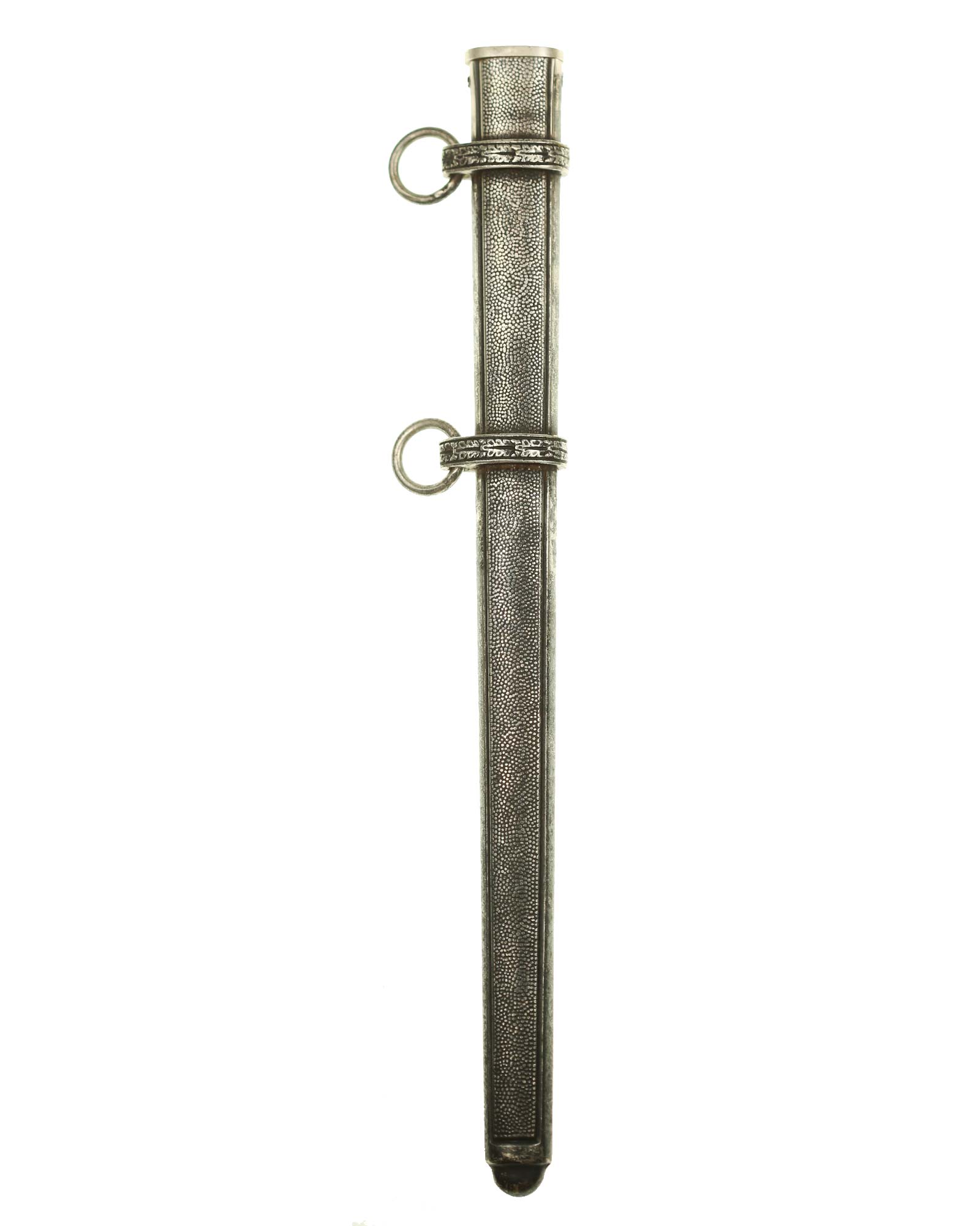 Scabbard: This scabbard is straight and has excellent silver plating. This plating is nicely patinated throughout. The bands are particularly interesting as they depict oak leaves which have been completely hand rendered. These oak leaves have pebbled backgrounds and are made in a series of lines to resemble veins. The throat is retained by two side screws.