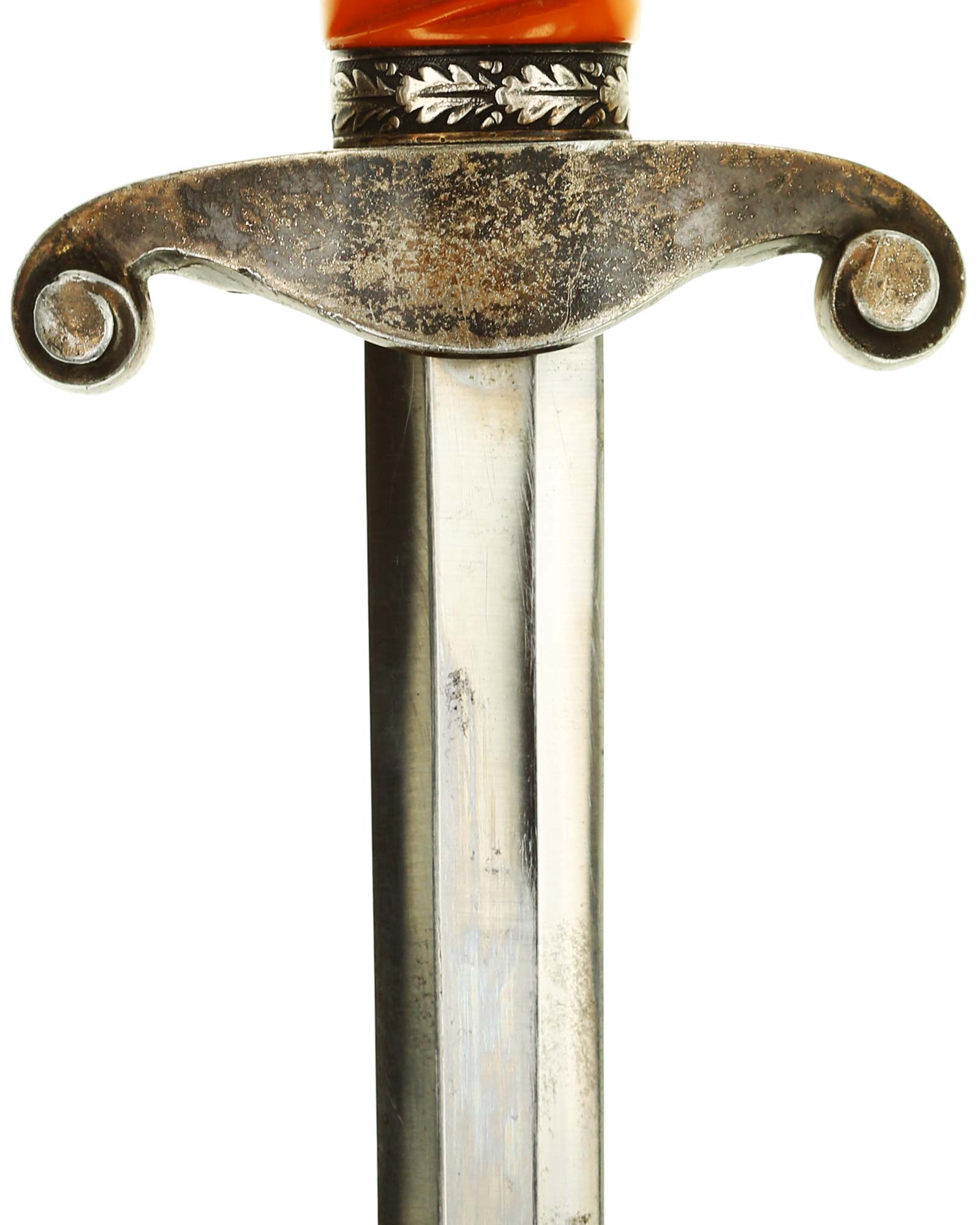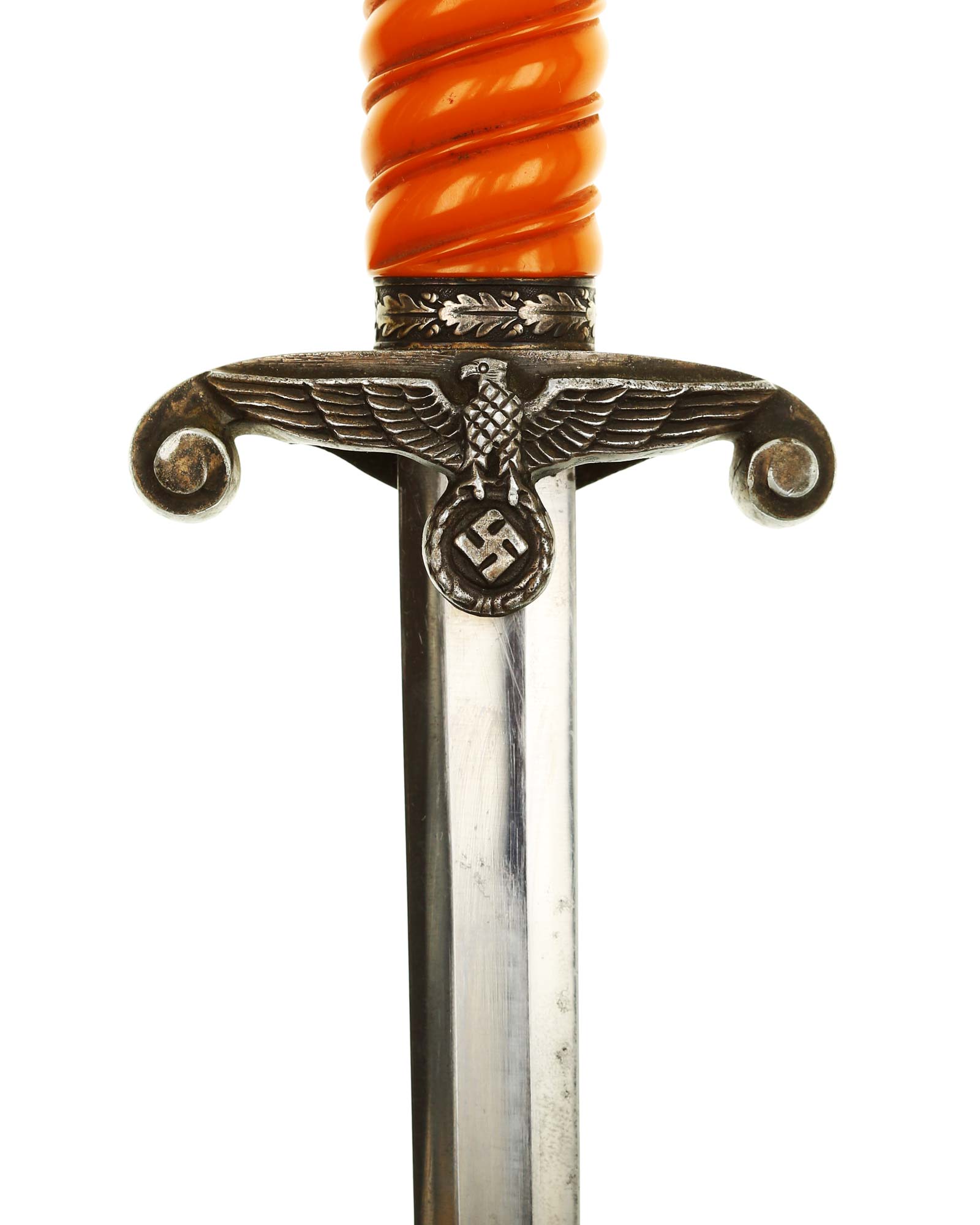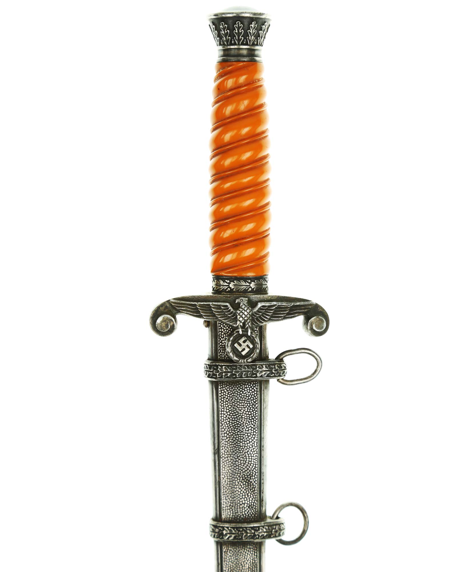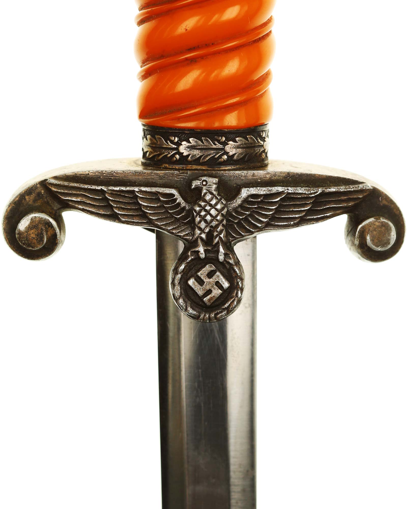 Grip: The grip is a beautiful, yellow/orange. The gorgeous pommel has twelve standing oak leaves are as crisp as the day they were stamped, together with the alternating acorns. The crossguard is completely crisp throughout the bird's eye, his fine checkered breast feathering, wing feathering and talons. The wreath has nice, pronounced oak leaves with a fine raised swastika in the center. The reverse of the guard as well as the top of the guard have lots of frosting evident under the black patination.