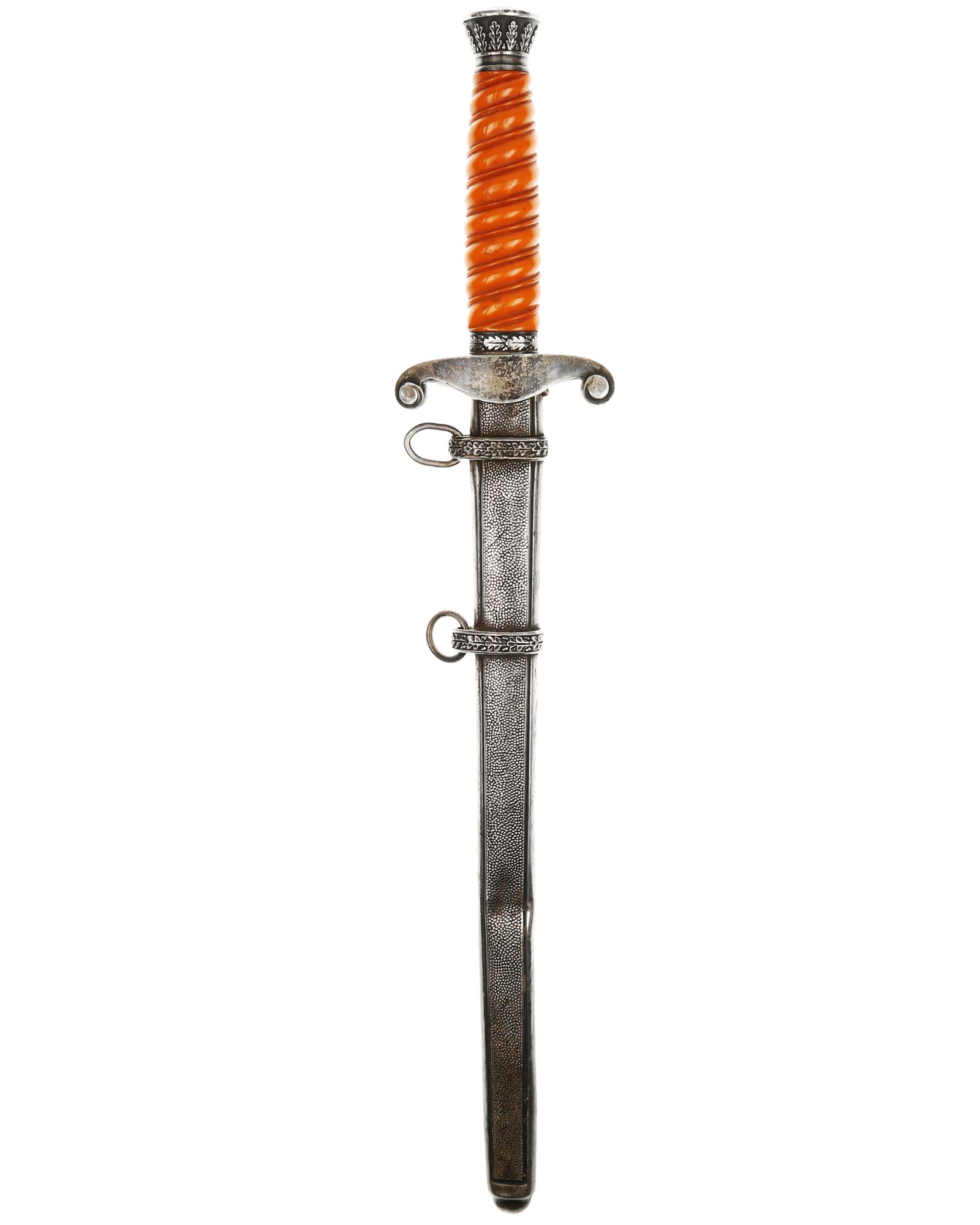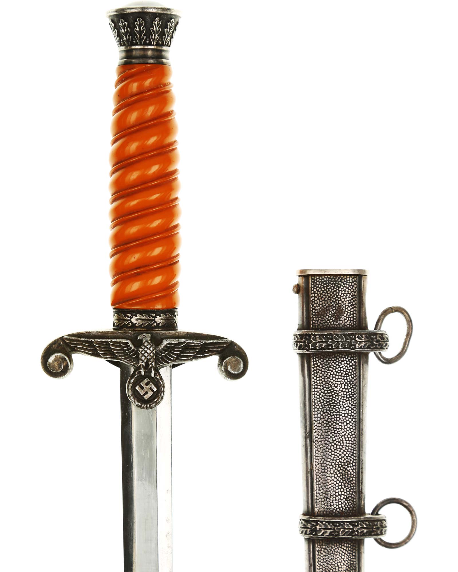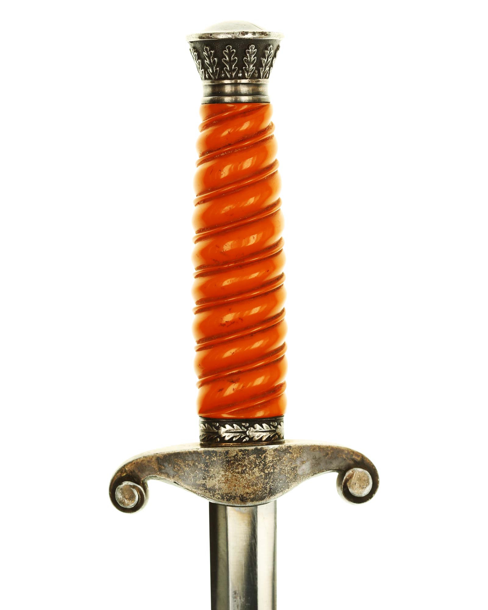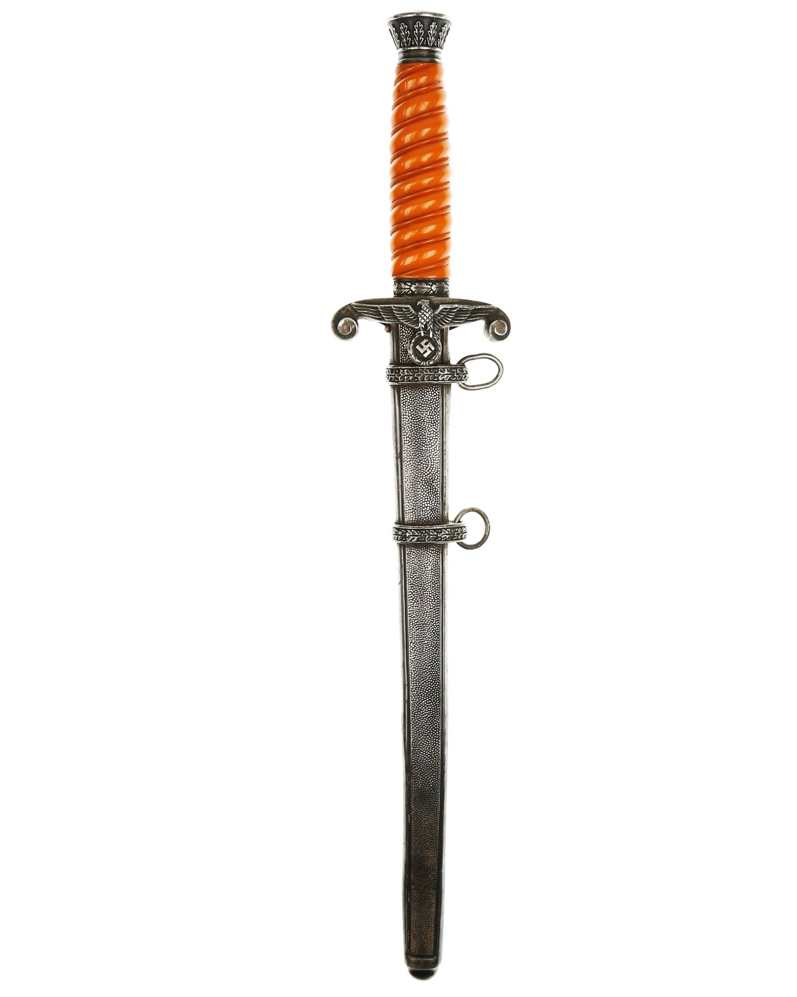 Grip: The grip is a beautiful, yellow/orange. The gorgeous pommel has twelve standing oak leaves are as crisp as the day they were stamped, together with the alternating acorns. The crossguard is completely crisp throughout the bird's eye, his fine checkered breast feathering, wing feathering and talons. The wreath has nice, pronounced oak leaves with a fine raised swastika in the center. The reverse of the guard as well as the top of the guard have lots of frosting evident under the black patination.