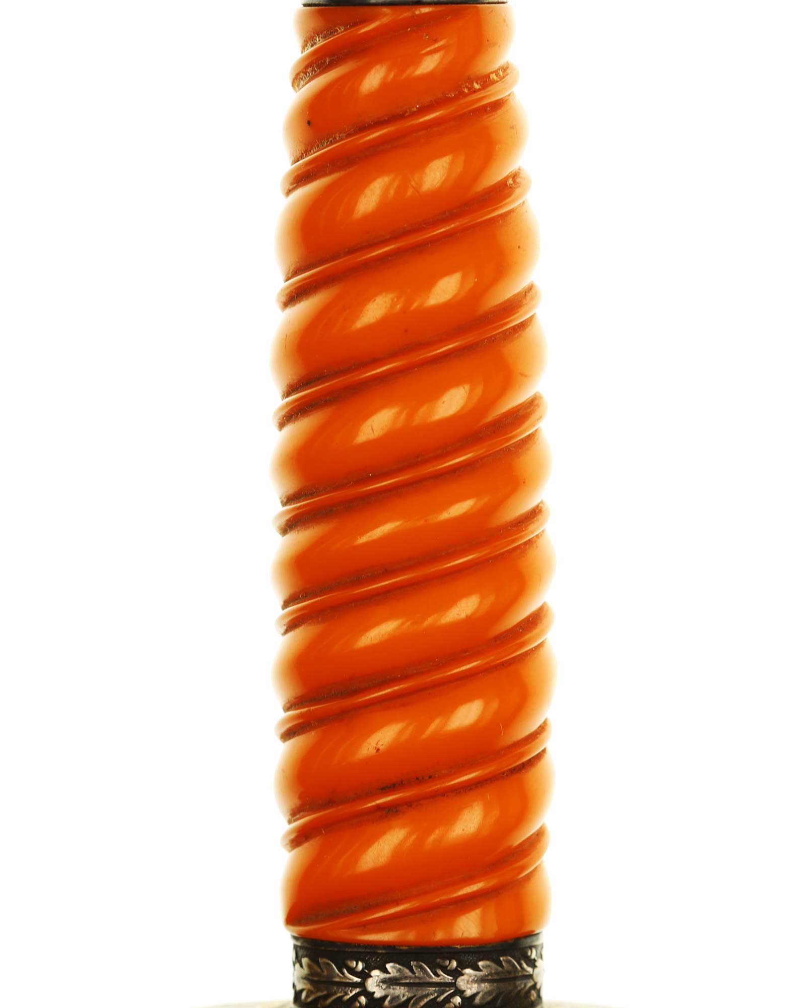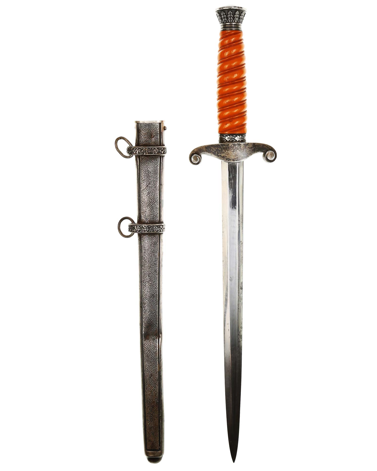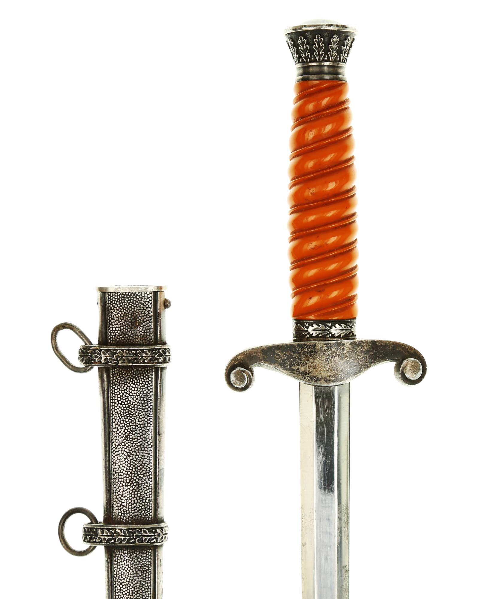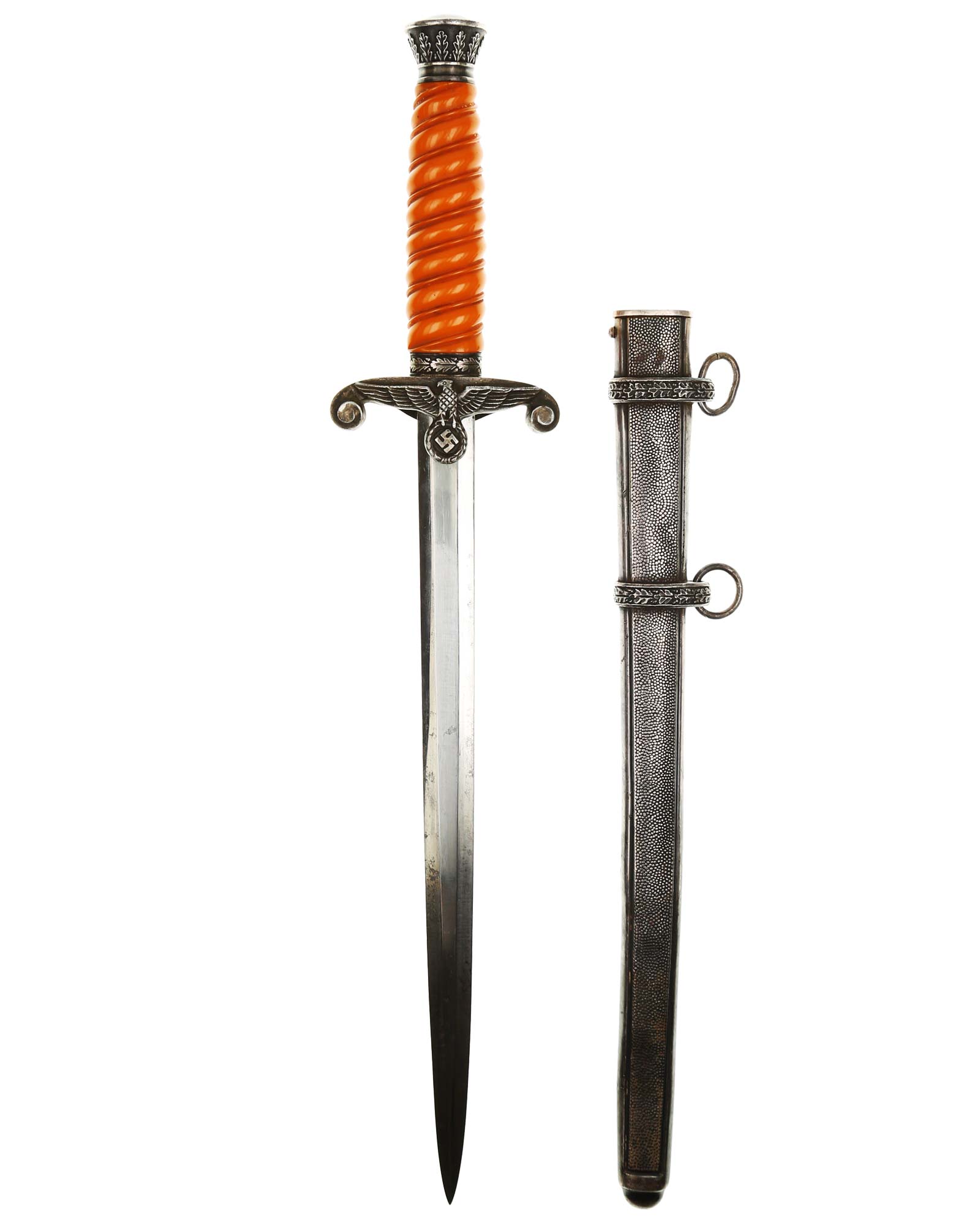Grip: The grip is a beautiful, yellow/orange. The gorgeous pommel has twelve standing oak leaves are as crisp as the day they were stamped, together with the alternating acorns. The crossguard is completely crisp throughout the bird's eye, his fine checkered breast feathering, wing feathering and talons. The wreath has nice, pronounced oak leaves with a fine raised swastika in the center. The reverse of the guard as well as the top of the guard have lots of frosting evident under the black patination.