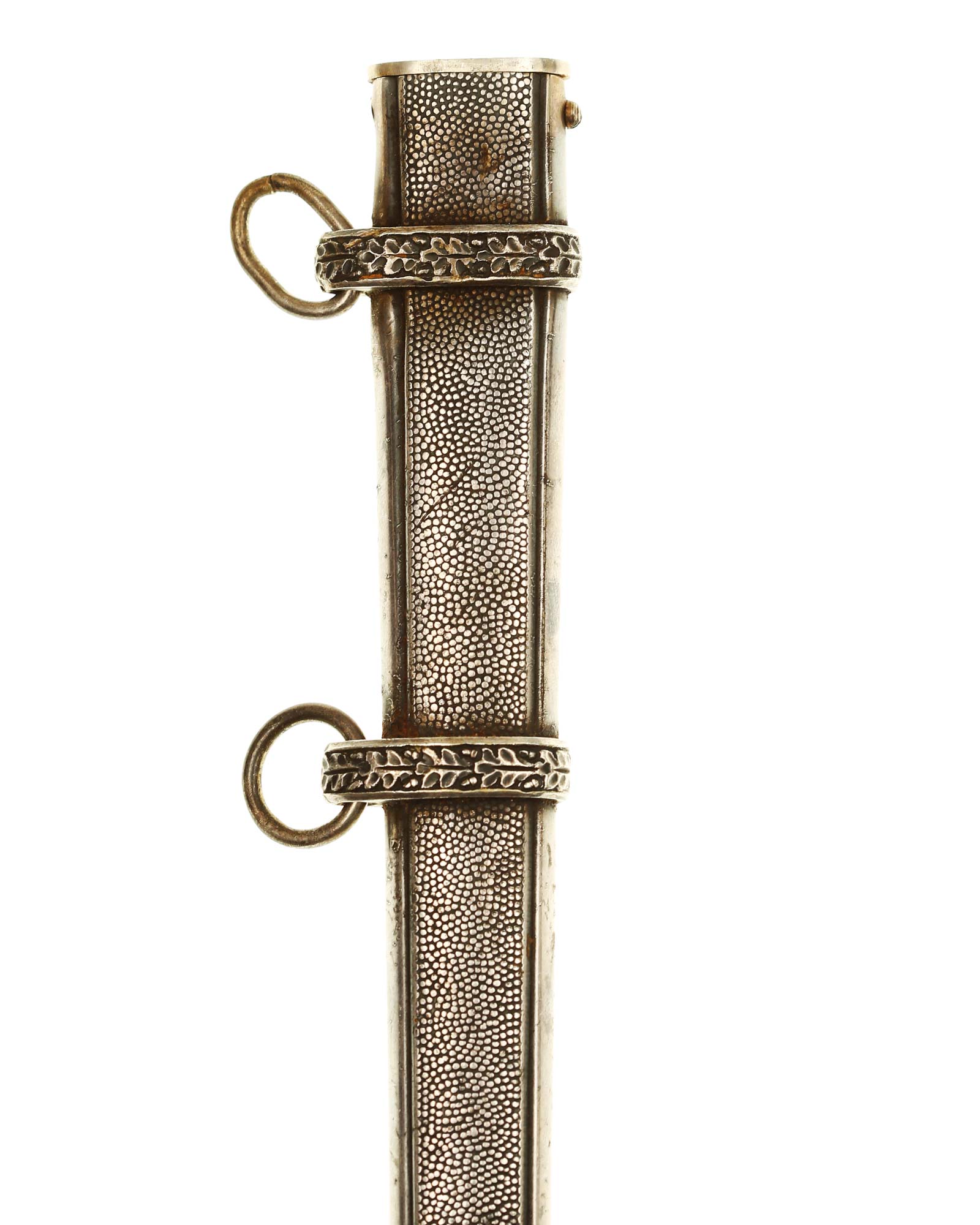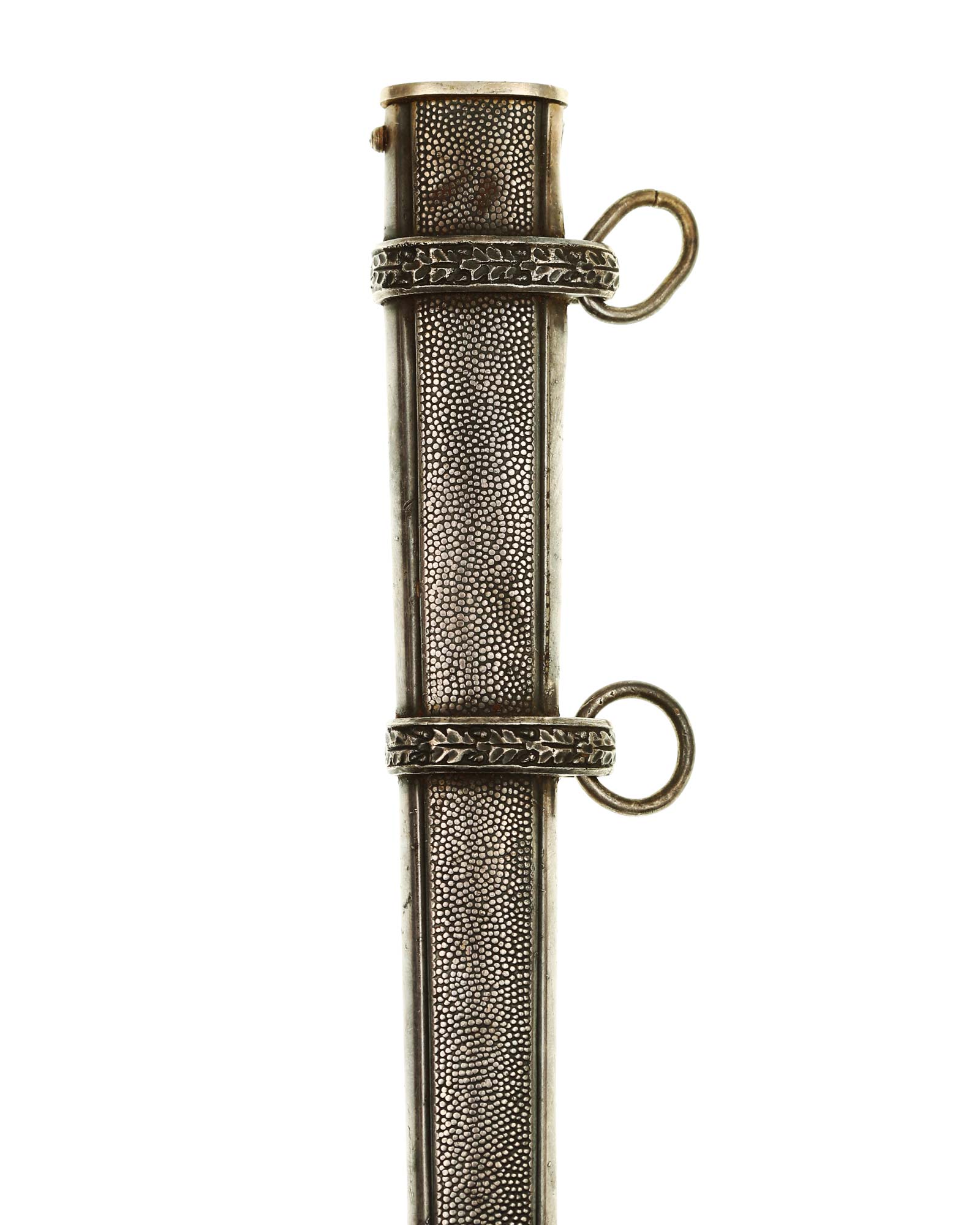 Scabbard: The bands feature overlapping oak leaves, with each leaf having hand enhancement to the veins. The throat is a thicker style and is retained by one side screw (one screw is missed).