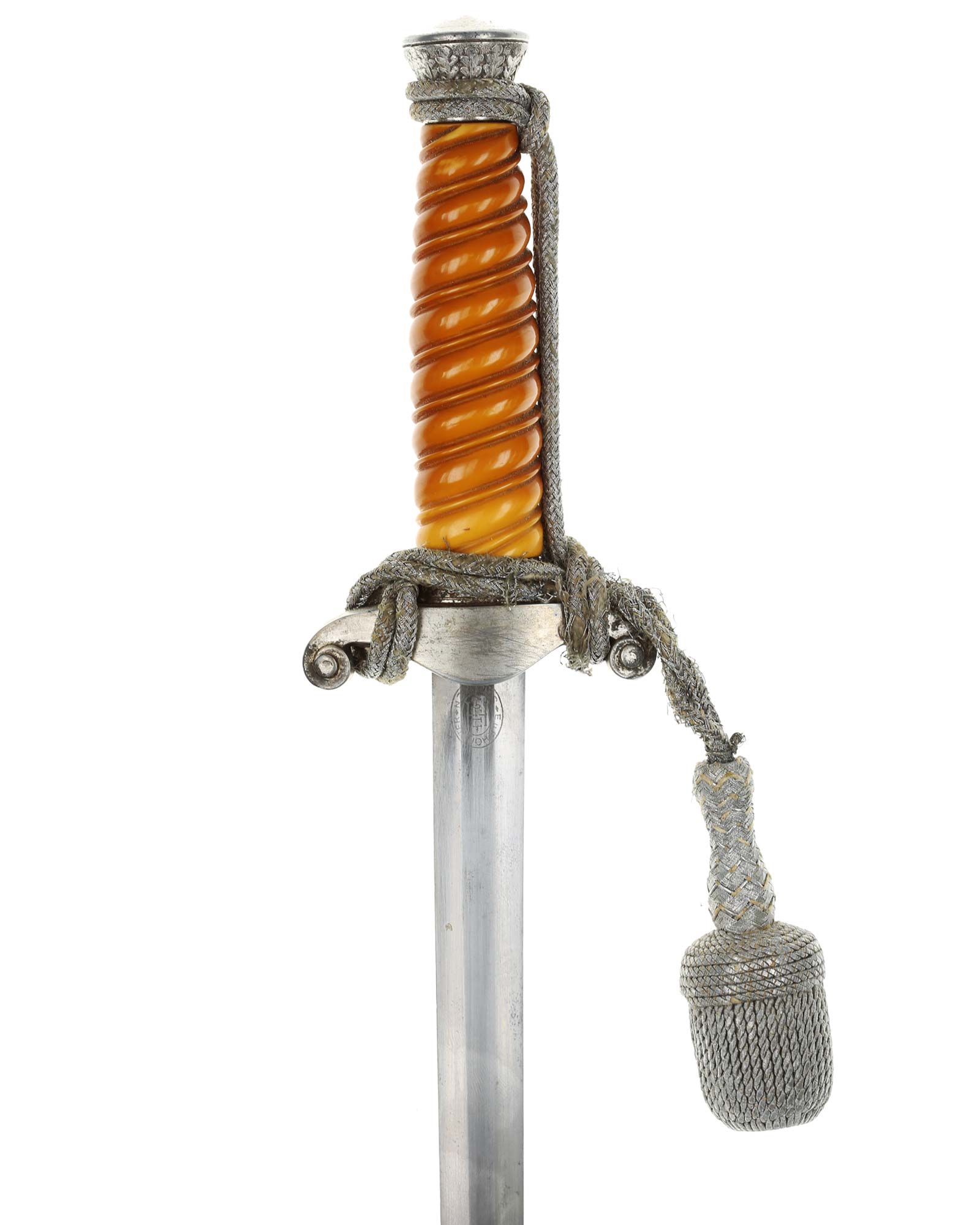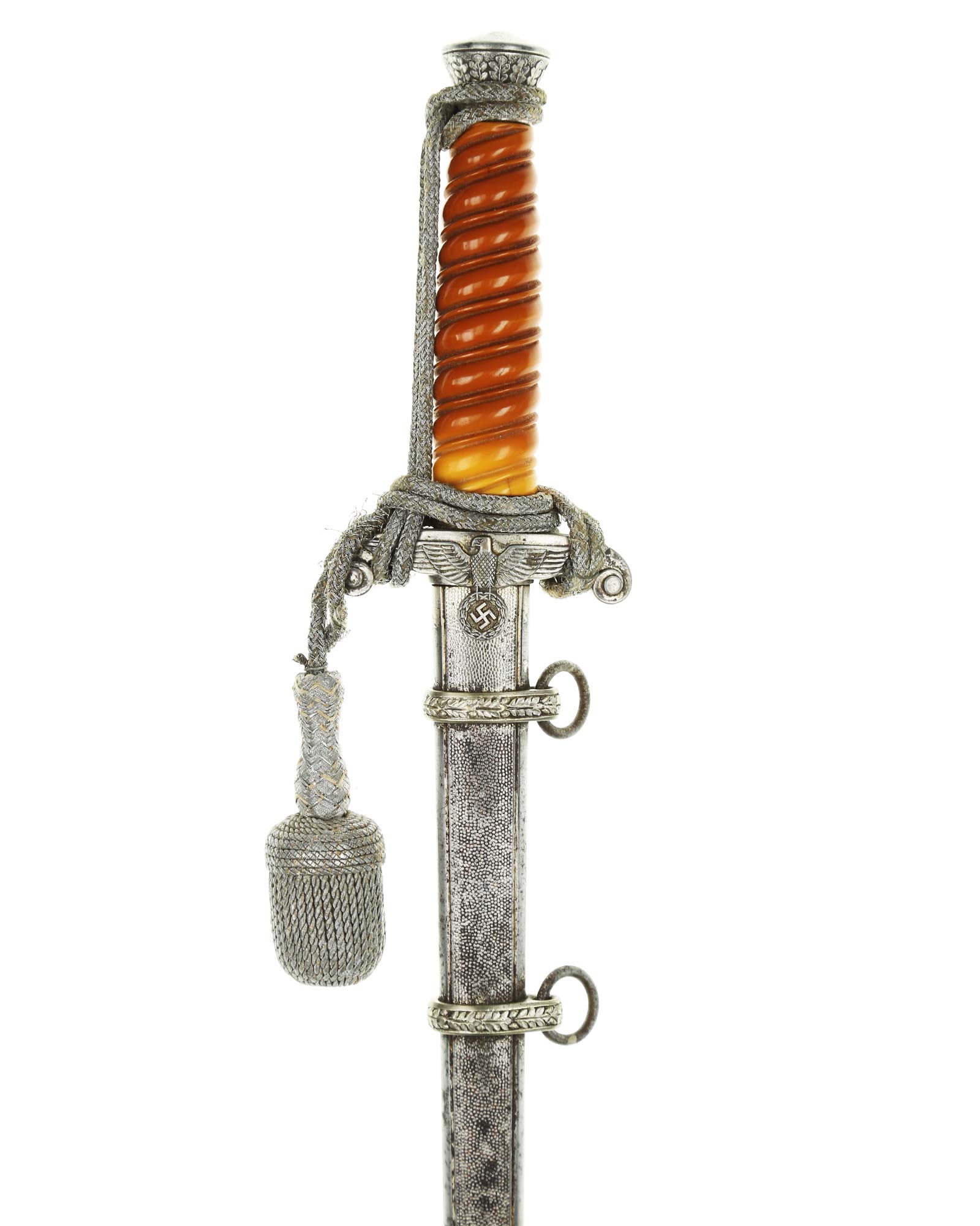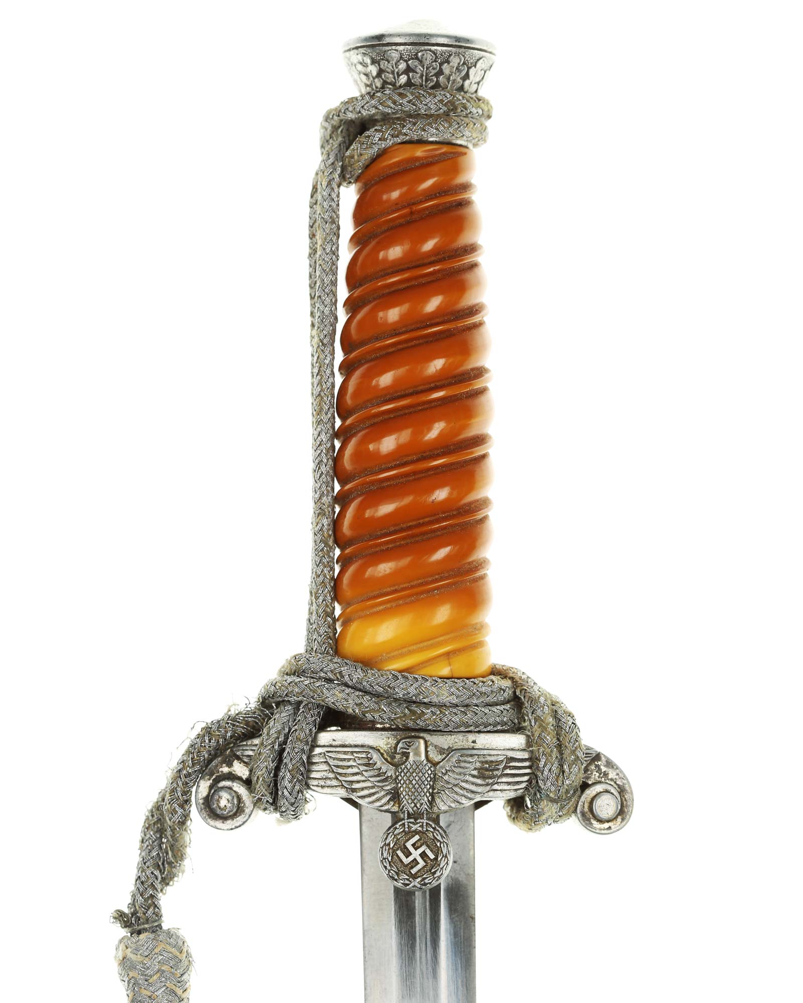 Grip: The grip is a beautiful, yellow. The gorgeous pommel has twelve standing oak leaves are as crisp as the day they were stamped, together with the alternating acorns. It is completely crisp throughout the bird's eye, his fine checkered breast feathering, wing feathering and talons. The wreath has nice, pronounced oak leaves with a fine raised swastika in the center.