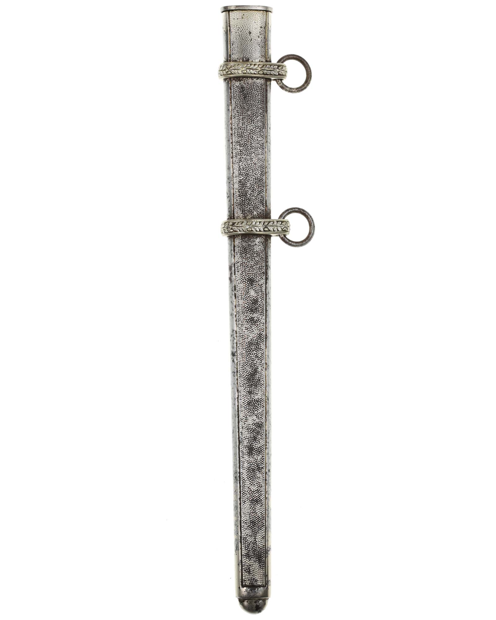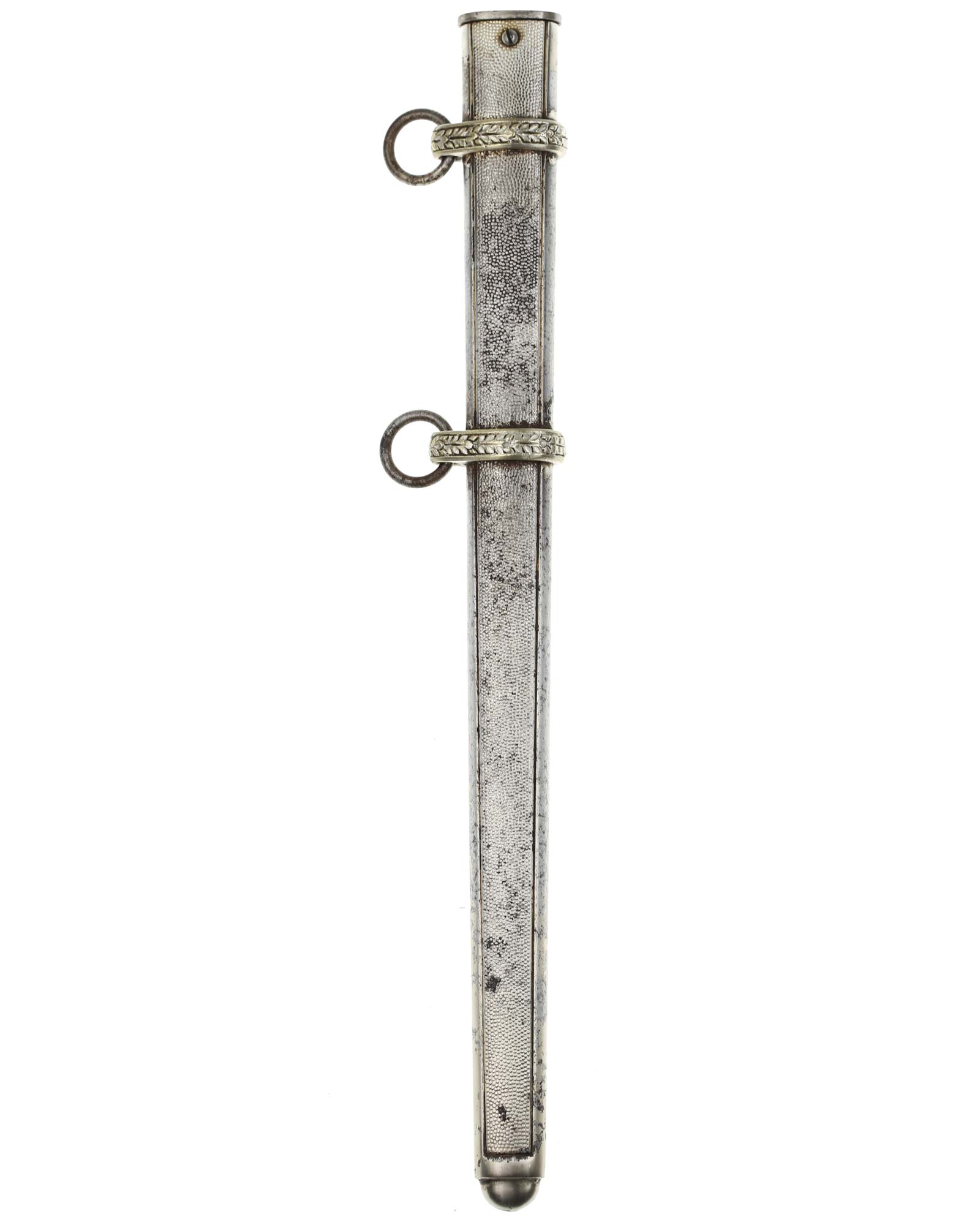 Scabbard: The bands feature overlapping oak leaves, with each leaf having hand enhancement to the veins. The throat is retained by one screw on the reverse.