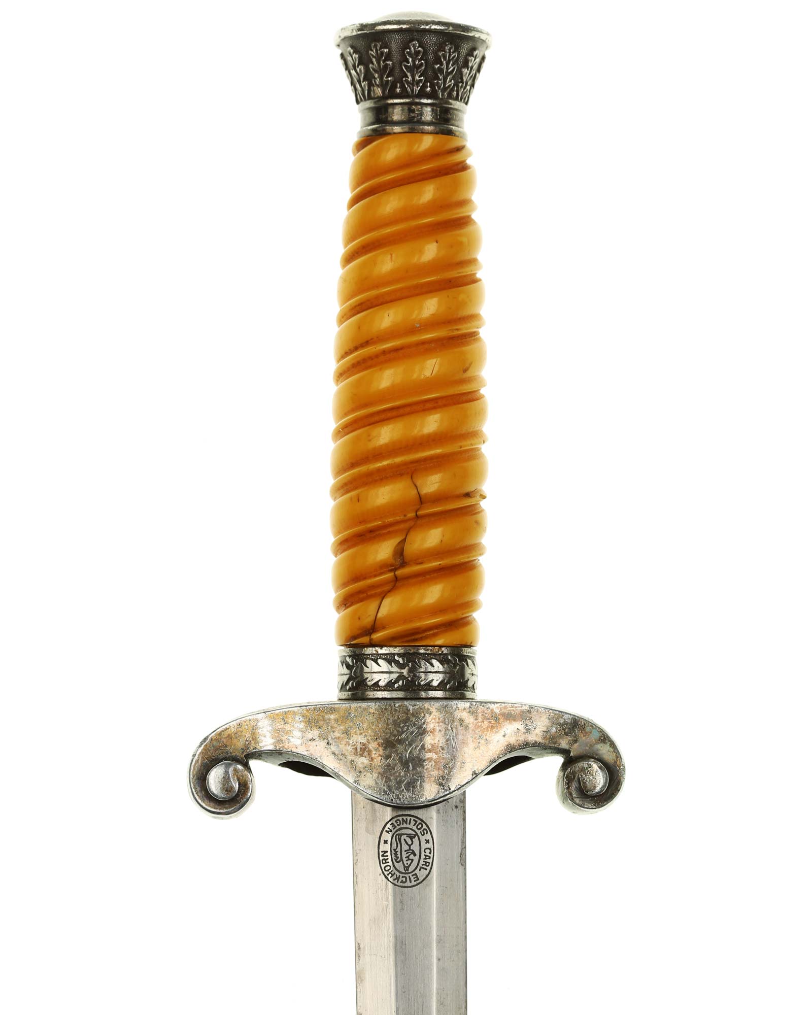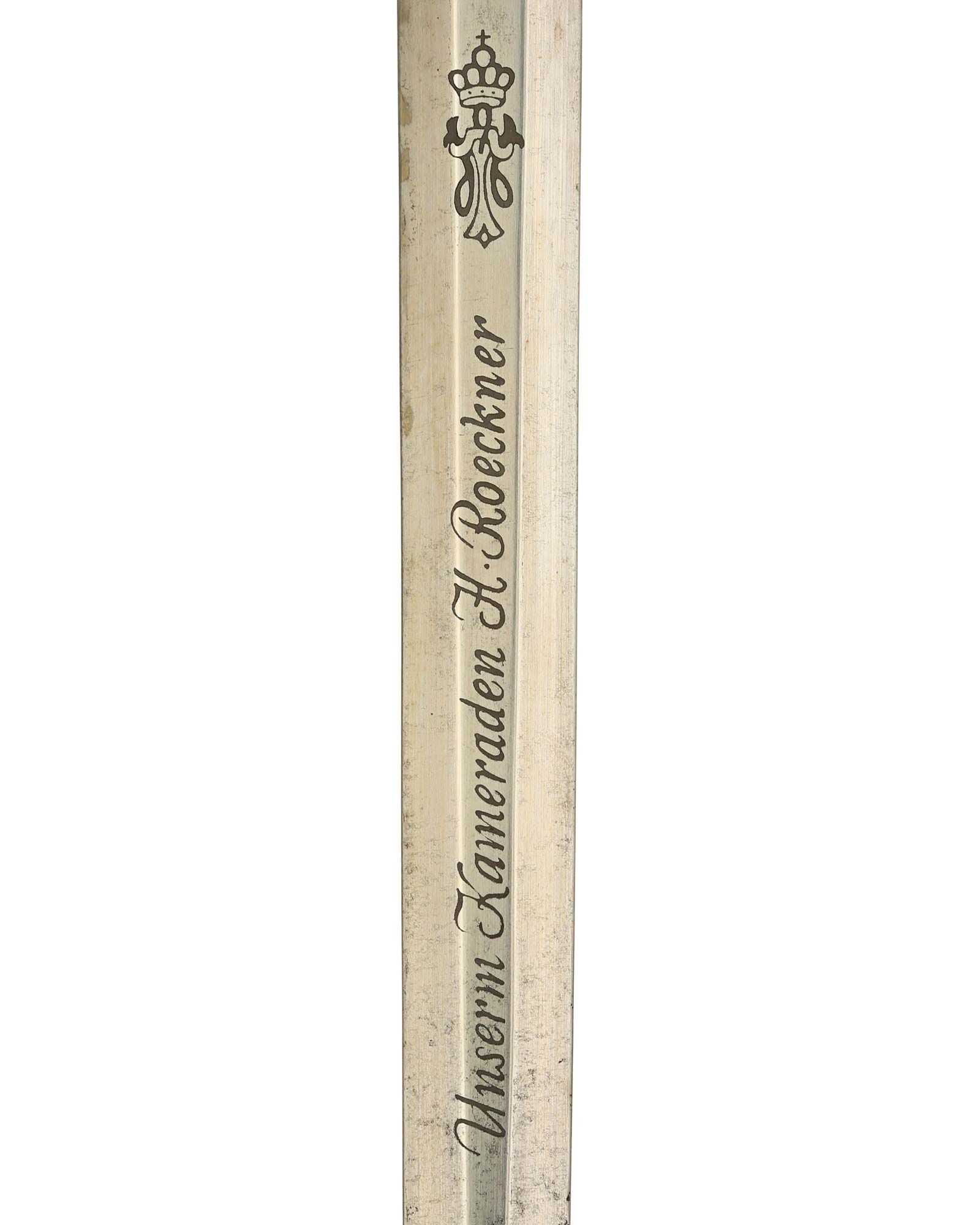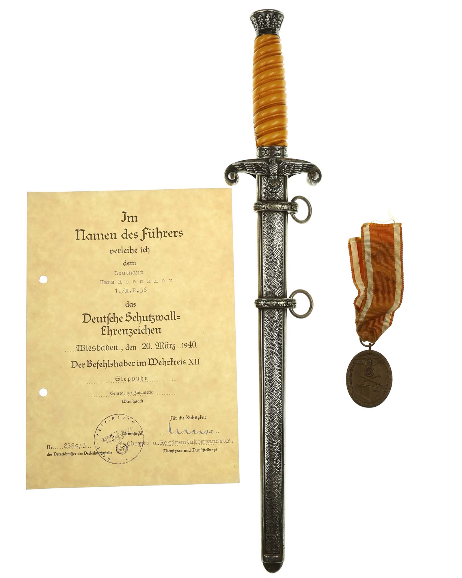 Blade: The blade is also a fine example. It is with dedication Unserm Kameraden H. Roeckner (Our comrade H. Roeckner). This remarkable exc++ blade is etched on the reverse with the trademark having the firm's initials and location, “Carl Eickhorn Solingen”. The original small leather blade washer is in place.