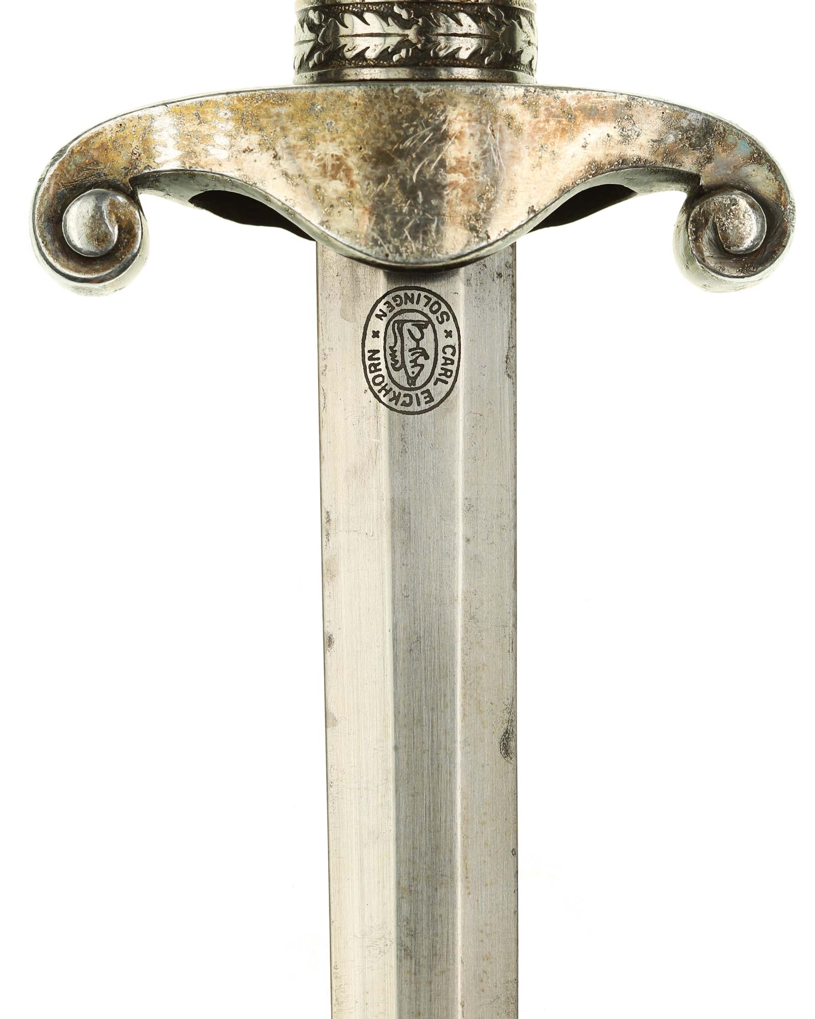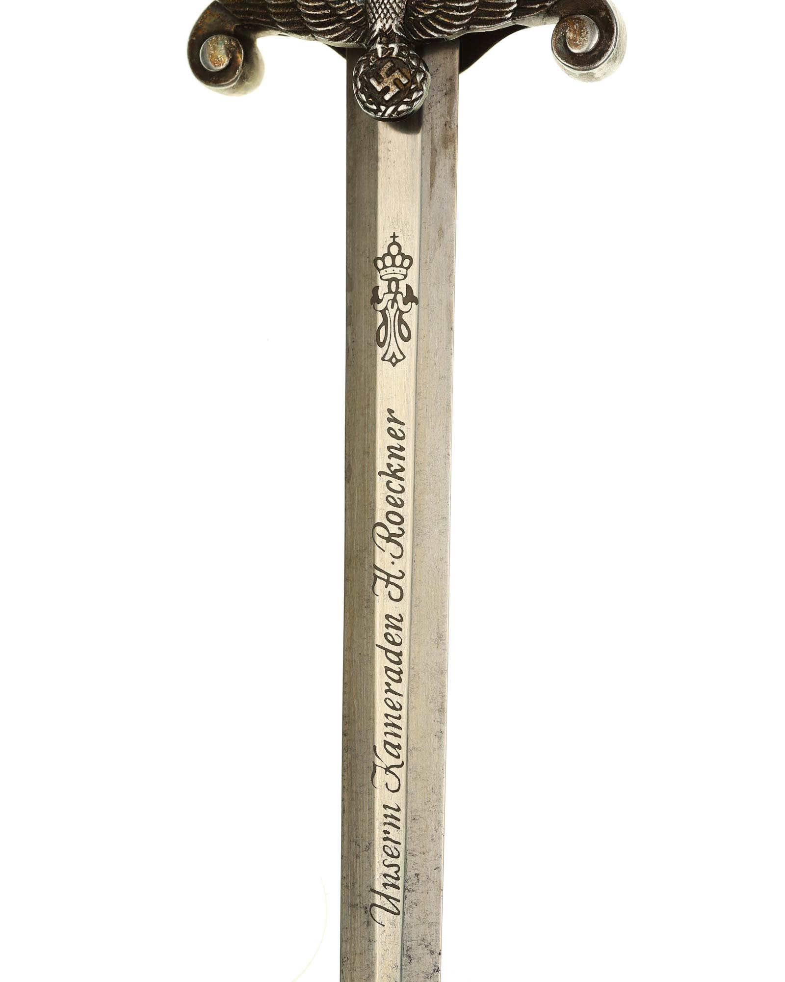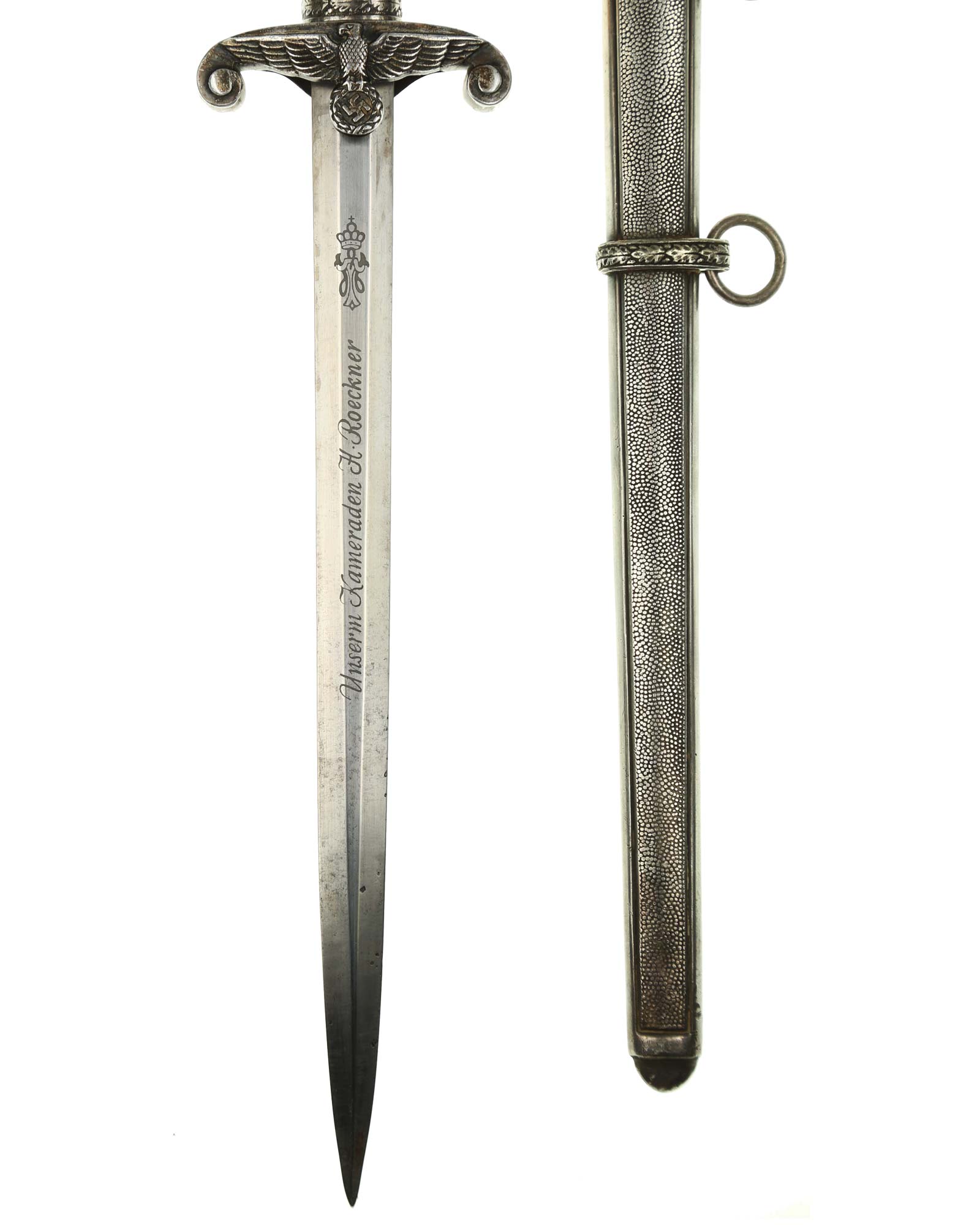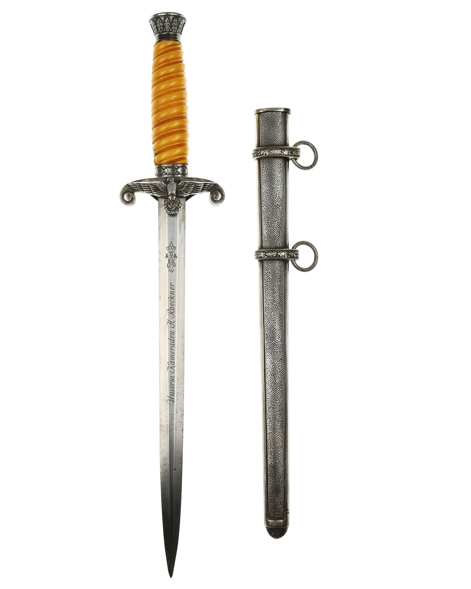 Blade: The blade is also a fine example. It is with dedication Unserm Kameraden H. Roeckner (Our comrade H. Roeckner). This remarkable exc++ blade is etched on the reverse with the trademark having the firm's initials and location, “Carl Eickhorn Solingen”. The original small leather blade washer is in place.