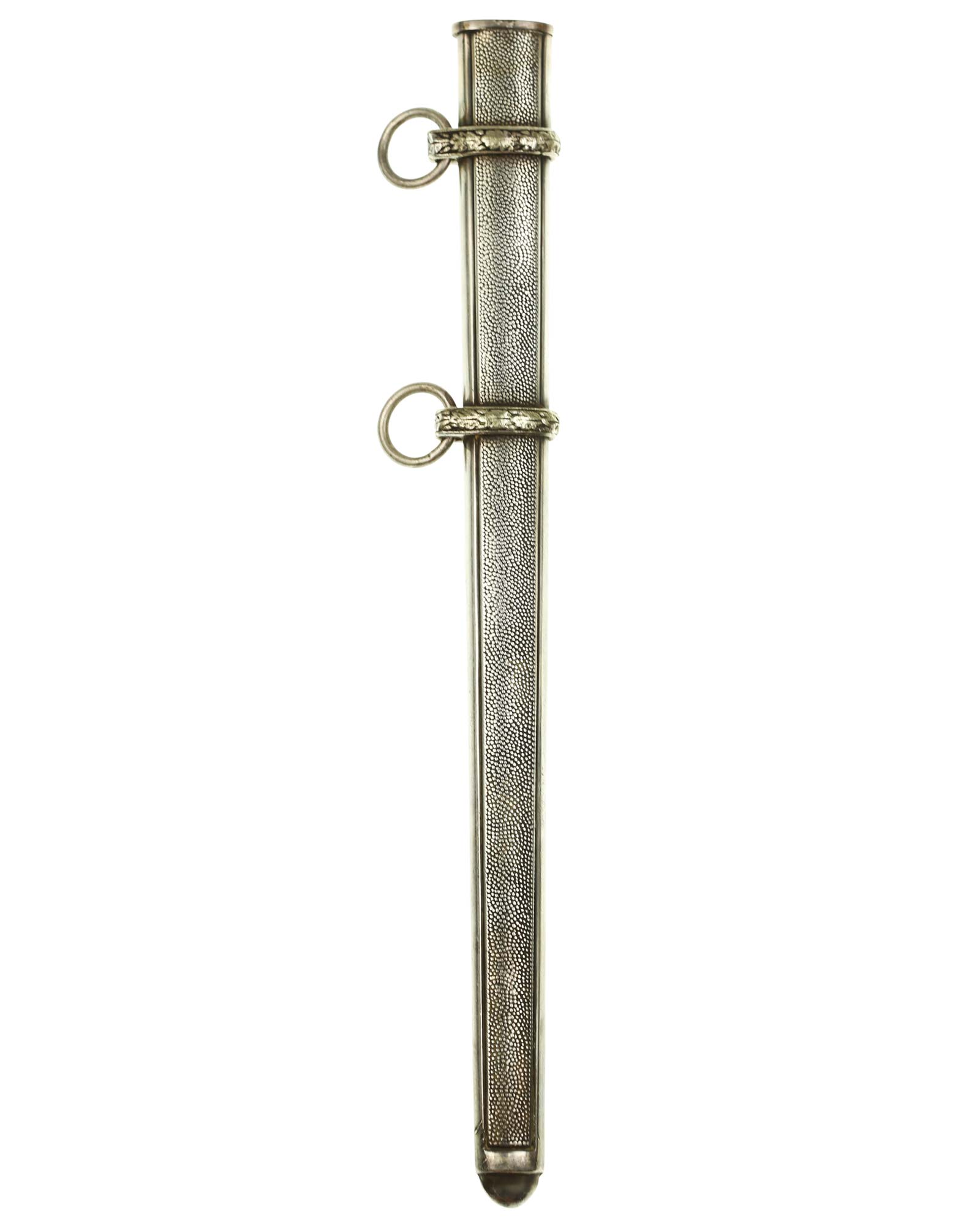 Scabbard: The scabbard is straight as an arrow. It retains its crisp pebbled panel design. There are frosted remains in the protected areas around the carrying bands. The bands are very fine with each overlapping oak leaf reflecting hand-enhancing.