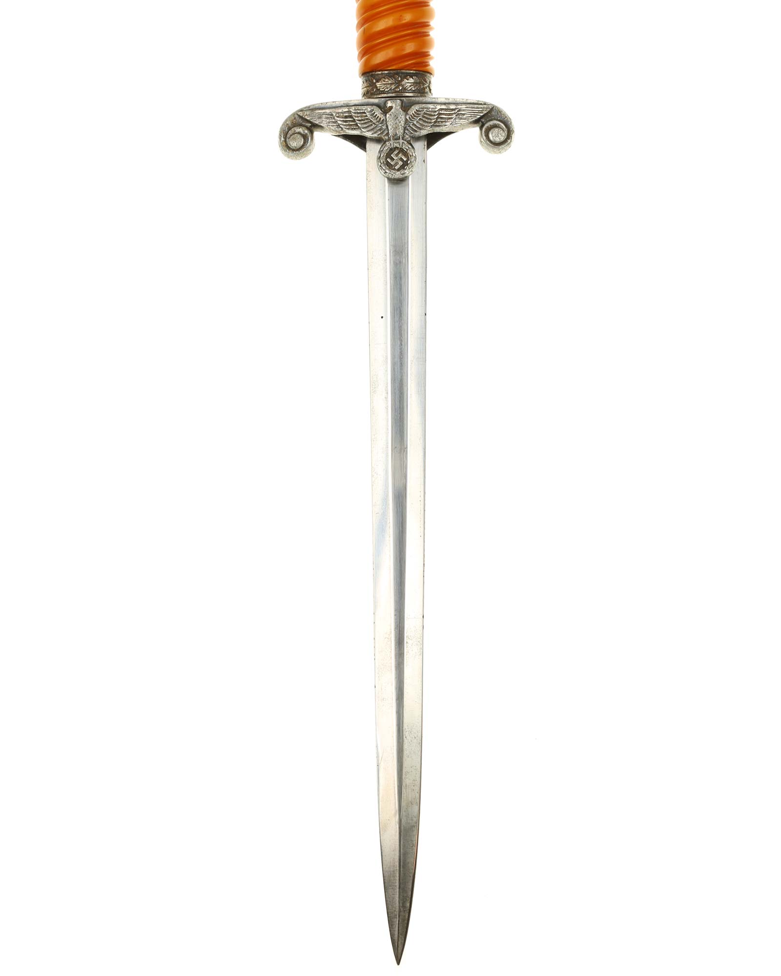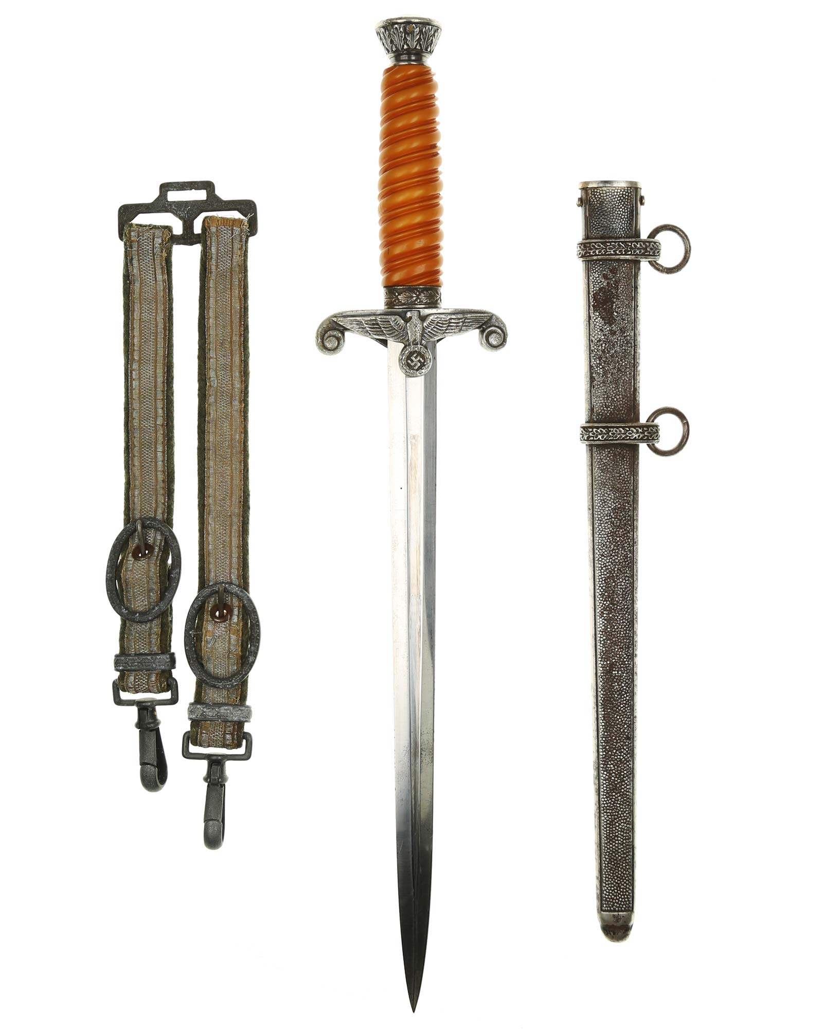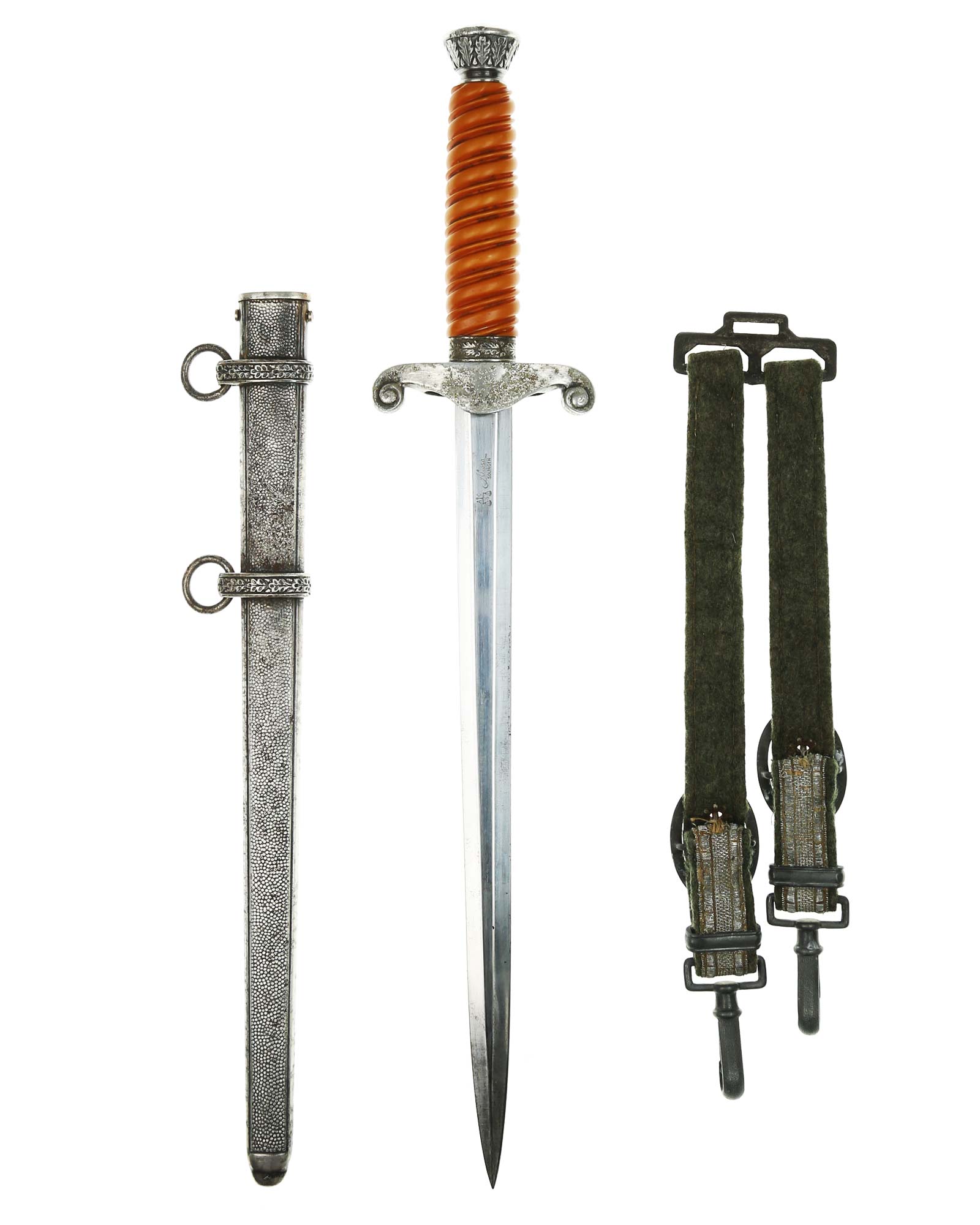 This Army Officer's Dagger is in EXC+ condition. Model 1935. The total length is 40.0 cm. The Dagger has the maker mark on the blade: Alcoso Solingen. Dagger with Hangers.