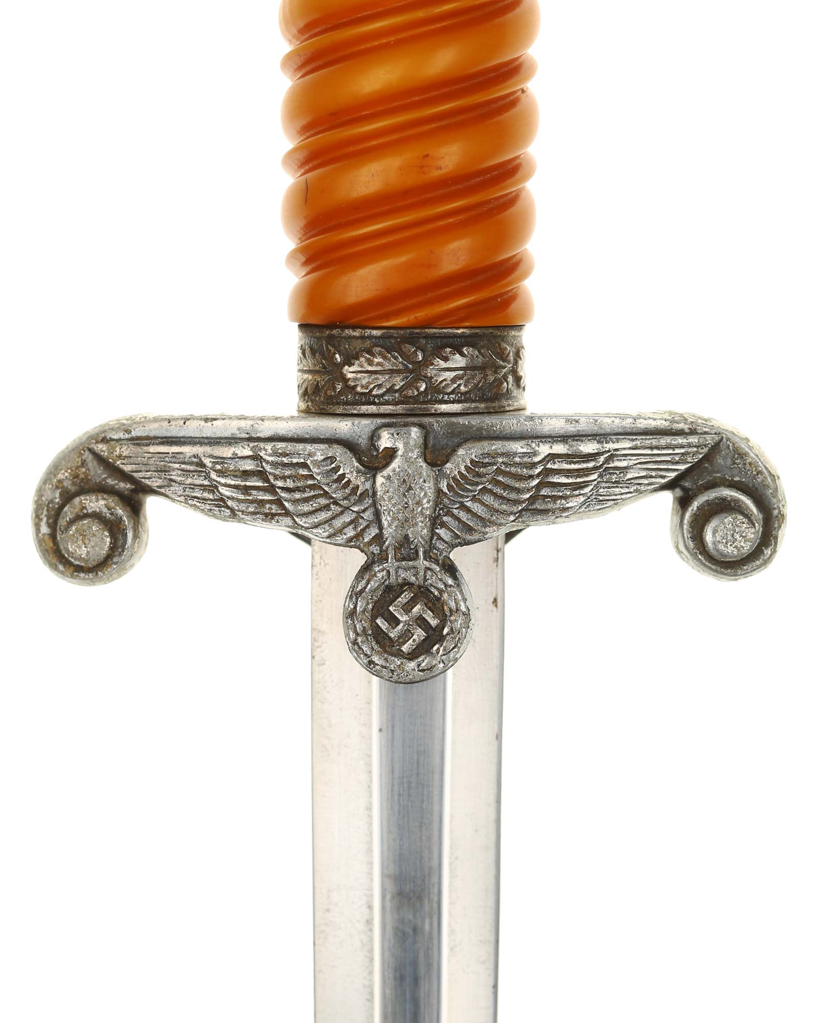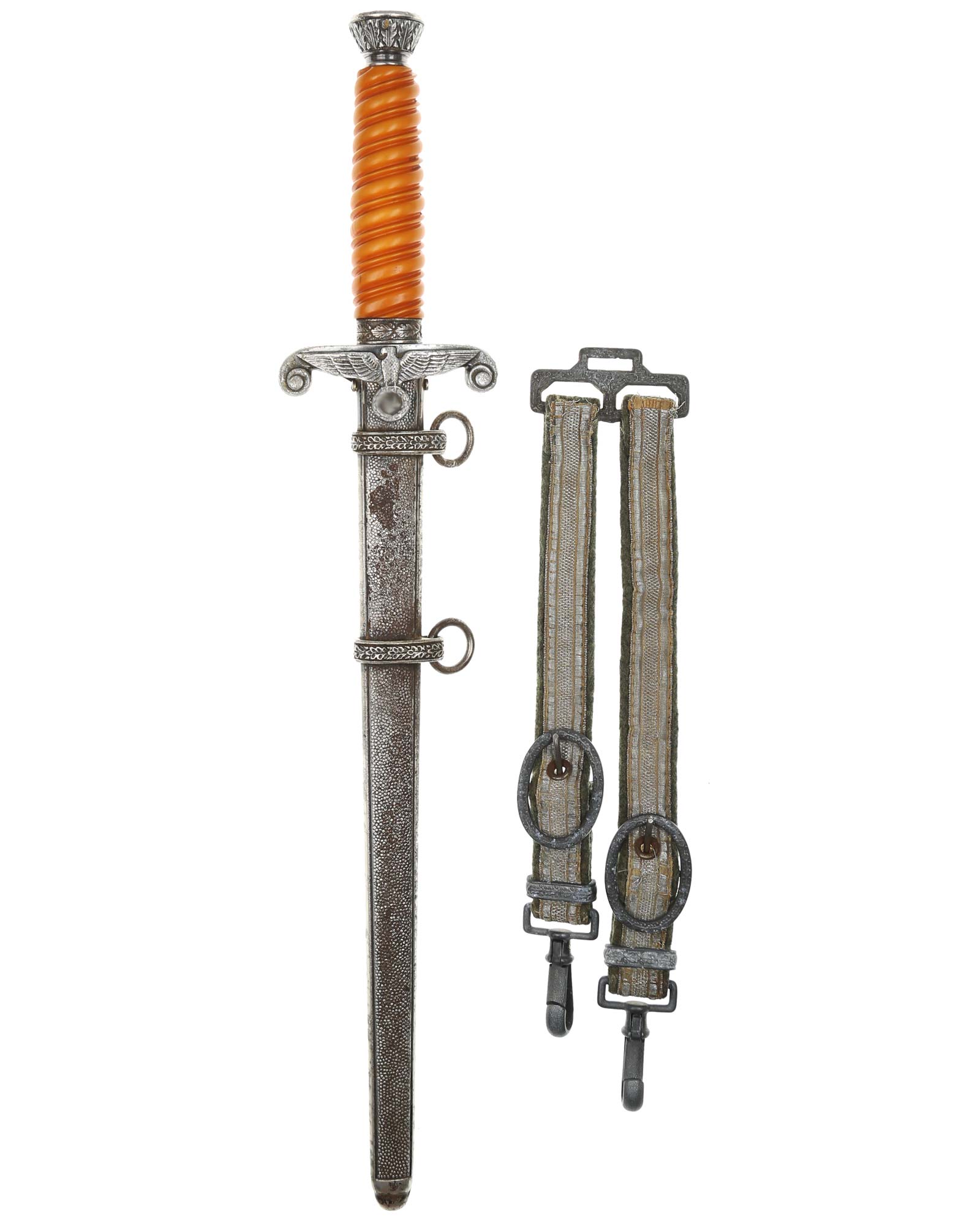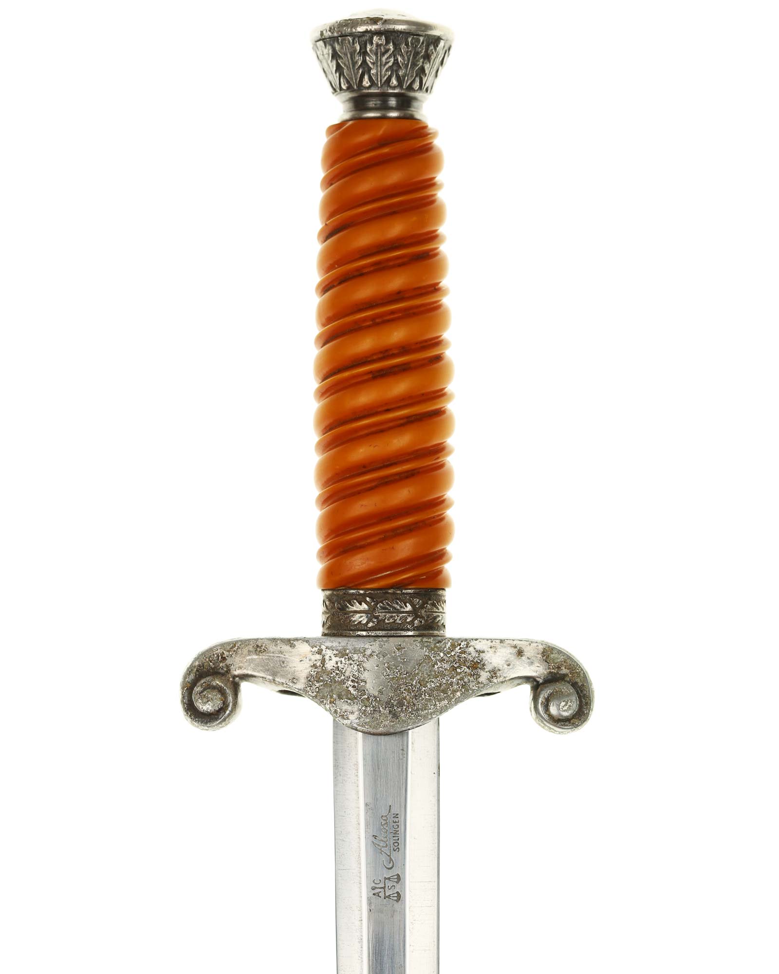 This Army Officer's Dagger is in EXC+ condition. Model 1935. The total length is 40.0 cm. The Dagger has the maker mark on the blade: Alcoso Solingen. Dagger with Hangers.