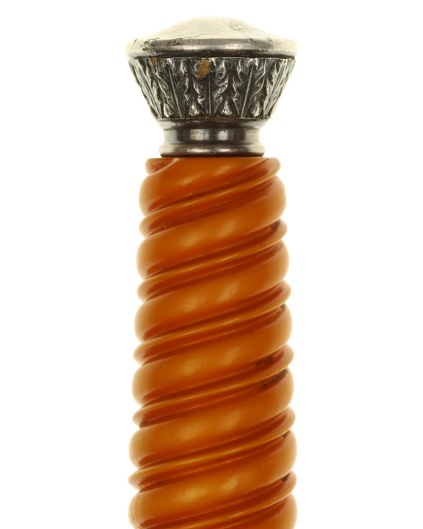 Blade: The blade is nice and bright throughout having good needlelike tip. This blade remains in exc+ condition. The reverse ricasso is etched with the trademark used from 1937-1939. This trademark consists of a set of scales which have the firm’s initials interspersed, “ACS”. Above the scales the firm’s name is written in block letters in an arch shape, “Alcoso”. Beneath is the location city of “Solingen”. The blade is buffered by a fine brown leather washer.