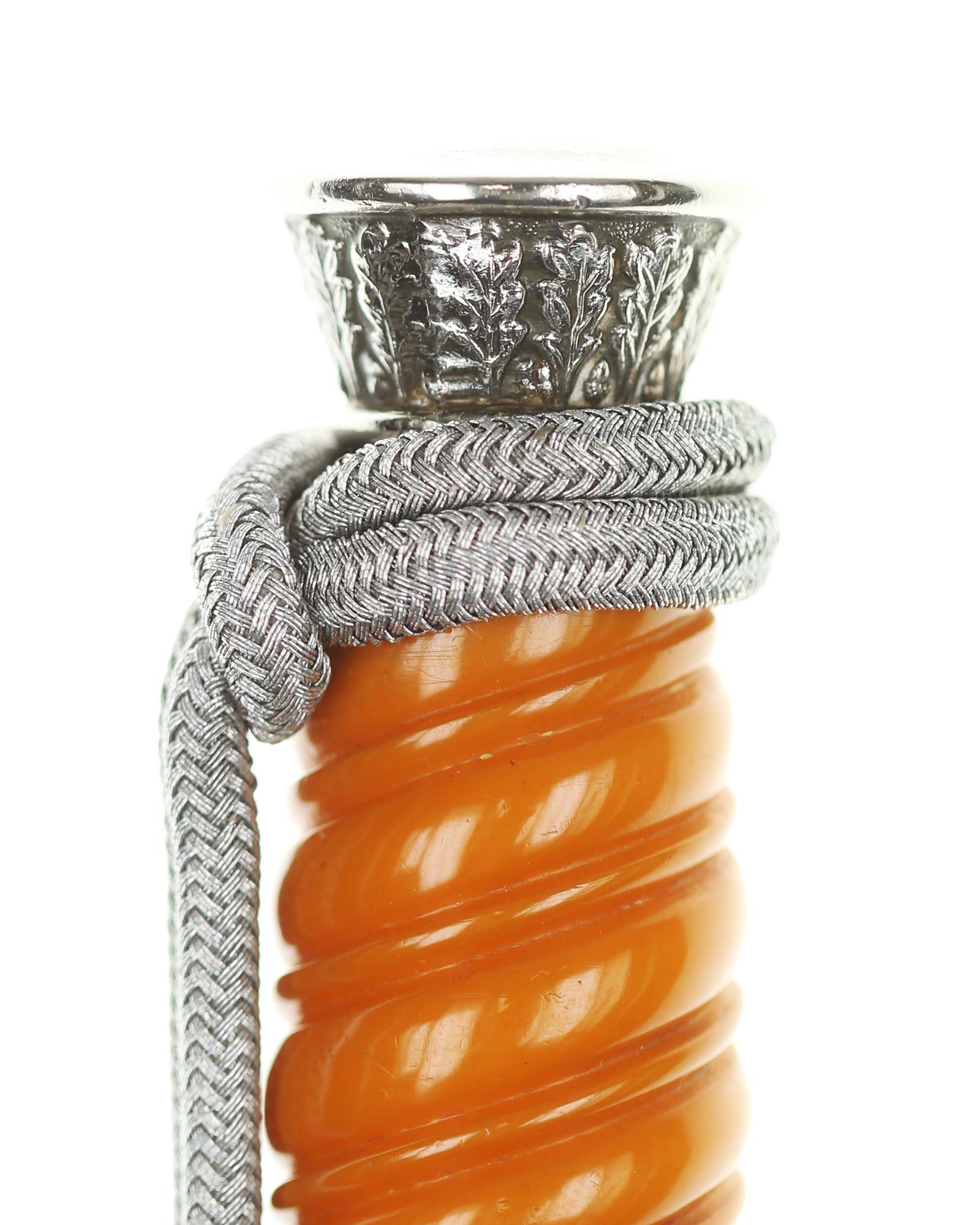 Grip: The grip of this dagger is a orange color. The pommel shows minor traces of carrying time on the upper end, but still has frosting around the edges. The 12 standing oak leaves are in excellent condition, all having hand enhancement. The eagle has quite a bit of frosting clinging to the recessed areas as well as the upper arms of the guards. It shows virtually no wear and retains full, crisp detailing throughout.