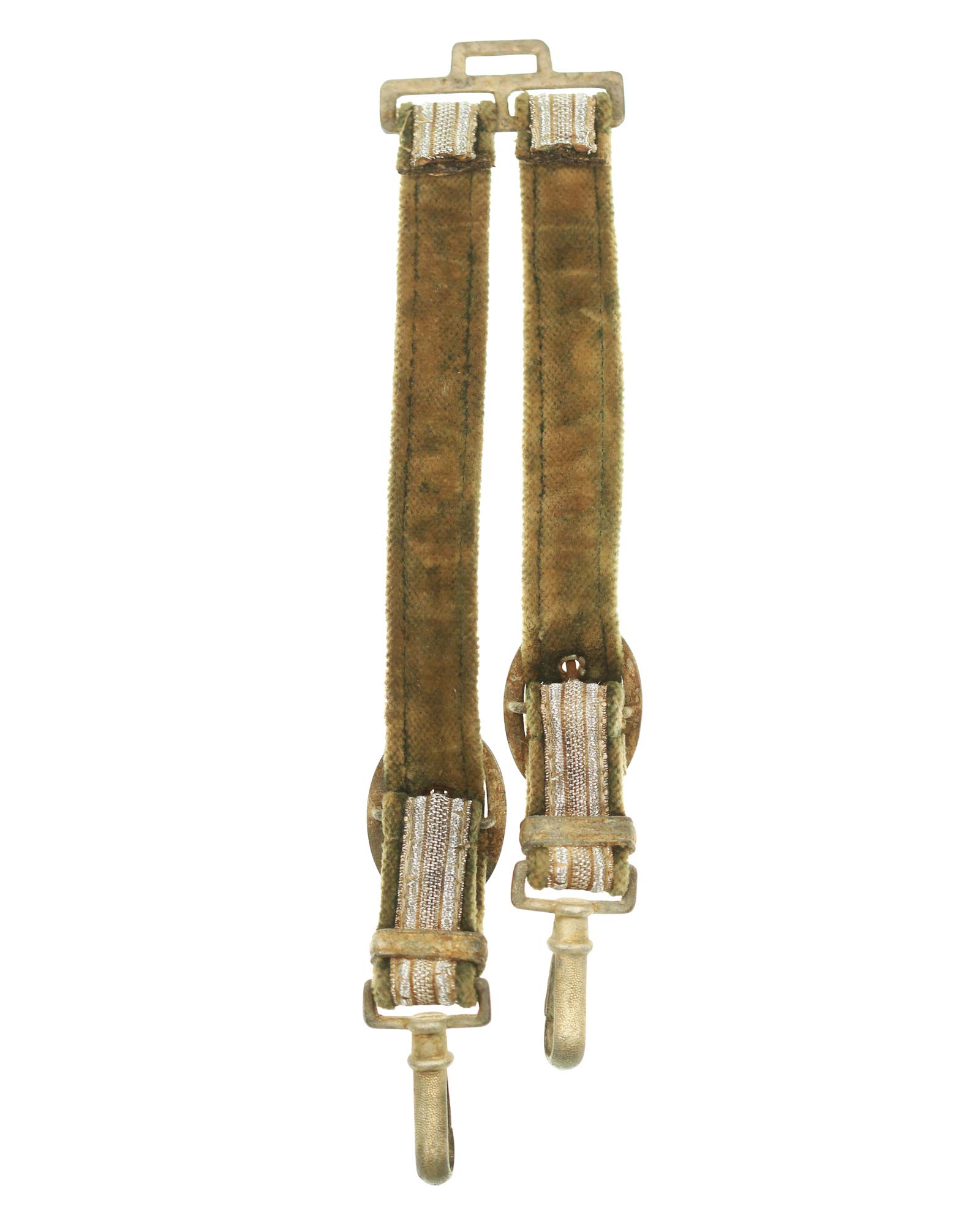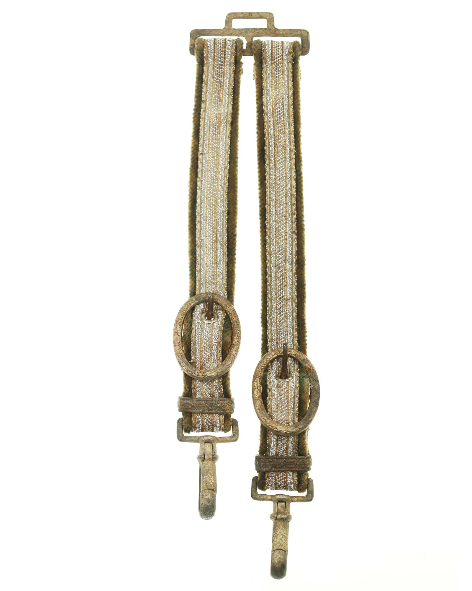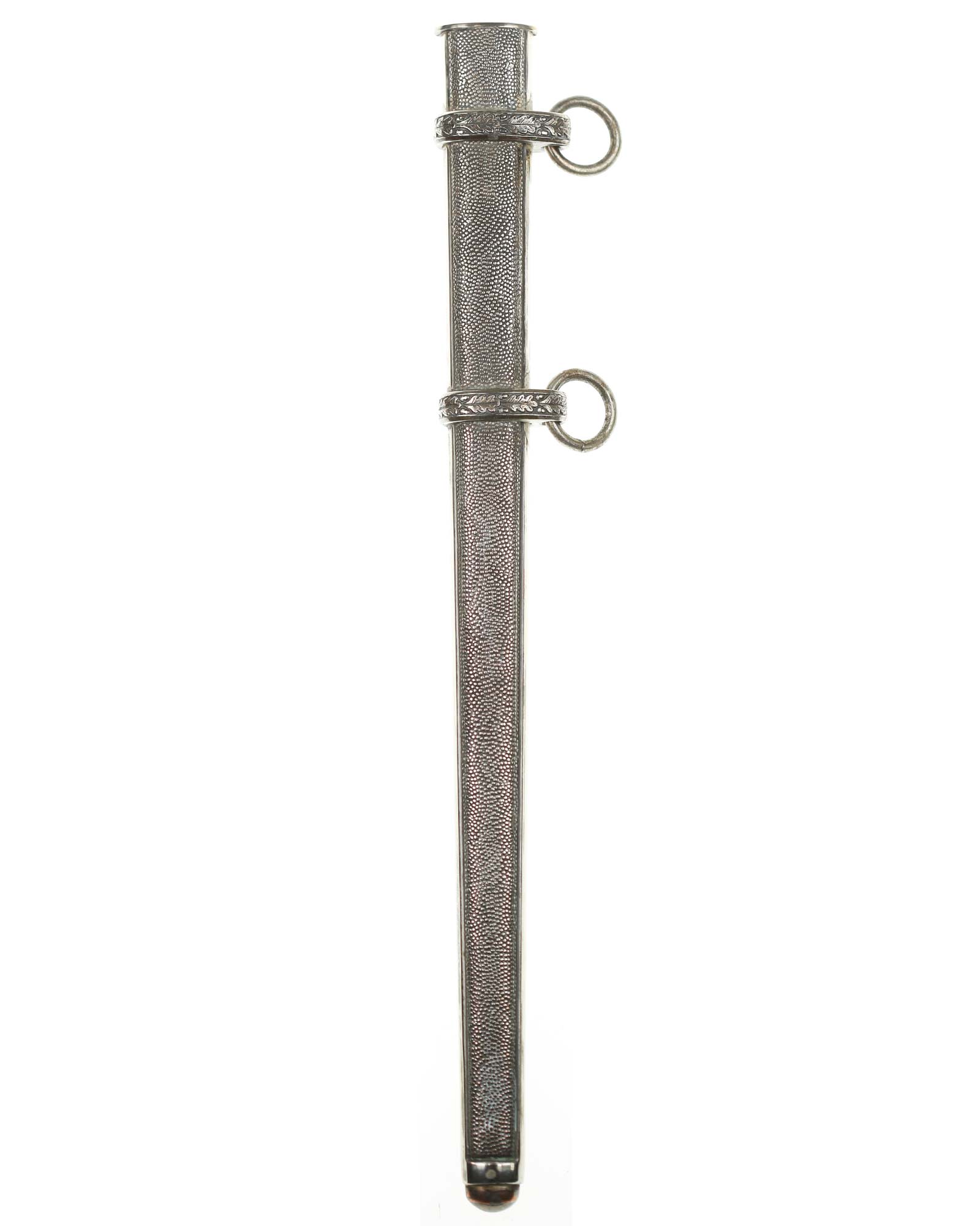 Scabbard: The scabbard is straight as an arrow, being the 2nd Style. It retains its crisp pebbled panel design. There are frosted remains in the protected areas around the carrying bands. The bands are very fine with each overlapping oak leaf reflecting hand-enhancing. The thick-style throat is retained by a single screw in the reverse center.