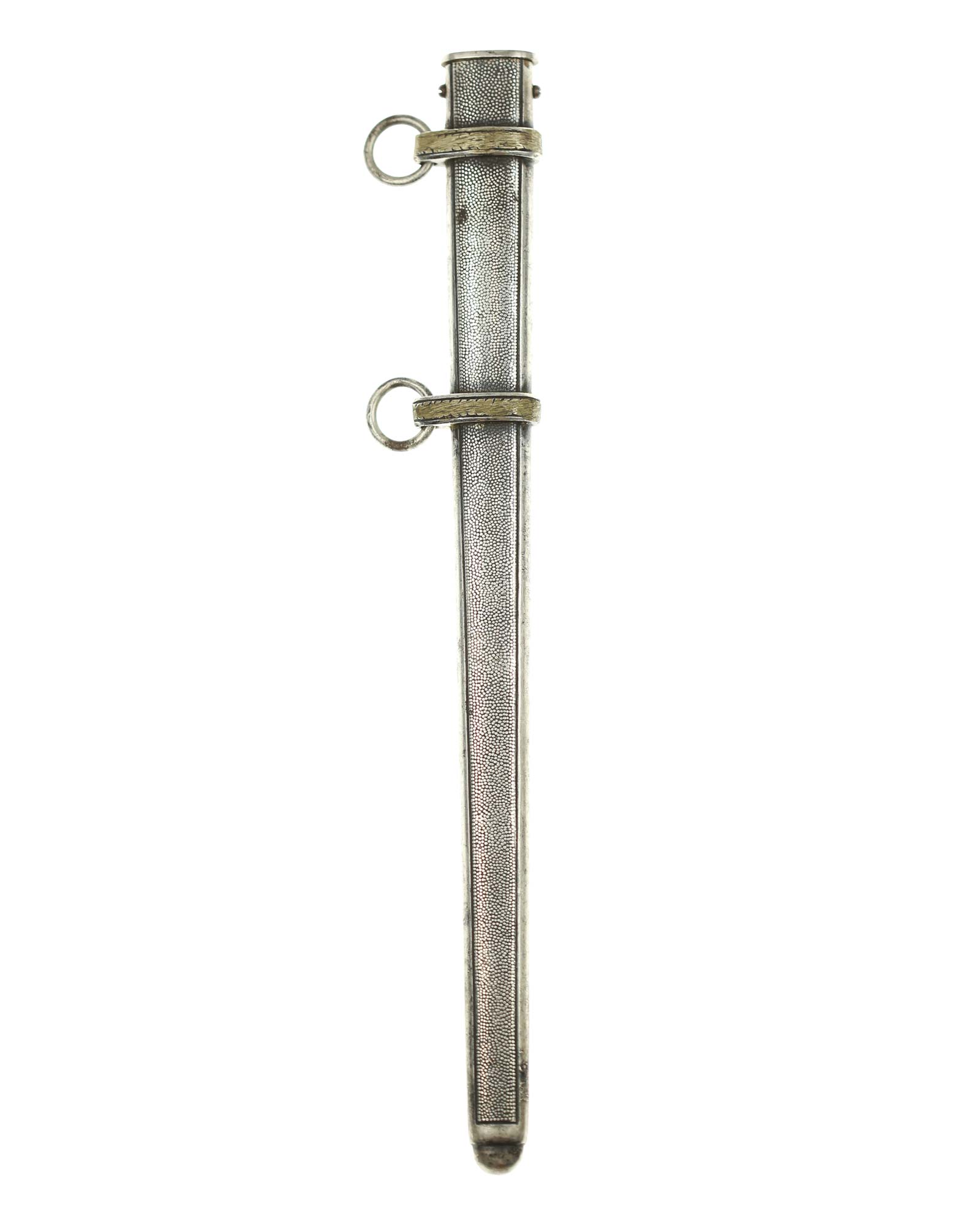 Scabbard: This scabbard is straight and has excellent silver plating. This plating is nicely patinated throughout. The bands are particularly interesting as they depict oak leaves which have been completely hand rendered. These oak leaves have pebbled backgrounds and are made in a series of lines to resemble veins. The throat is retained by two side screws.