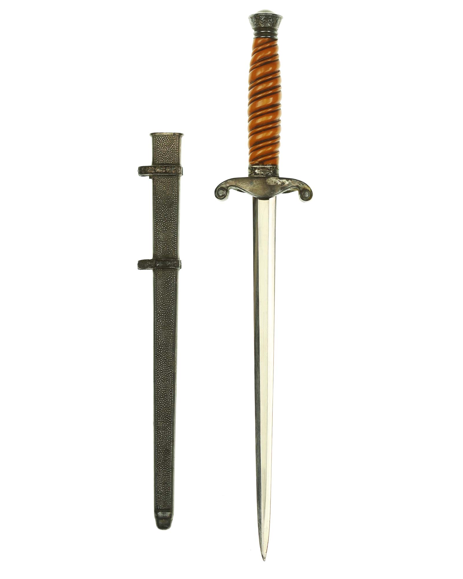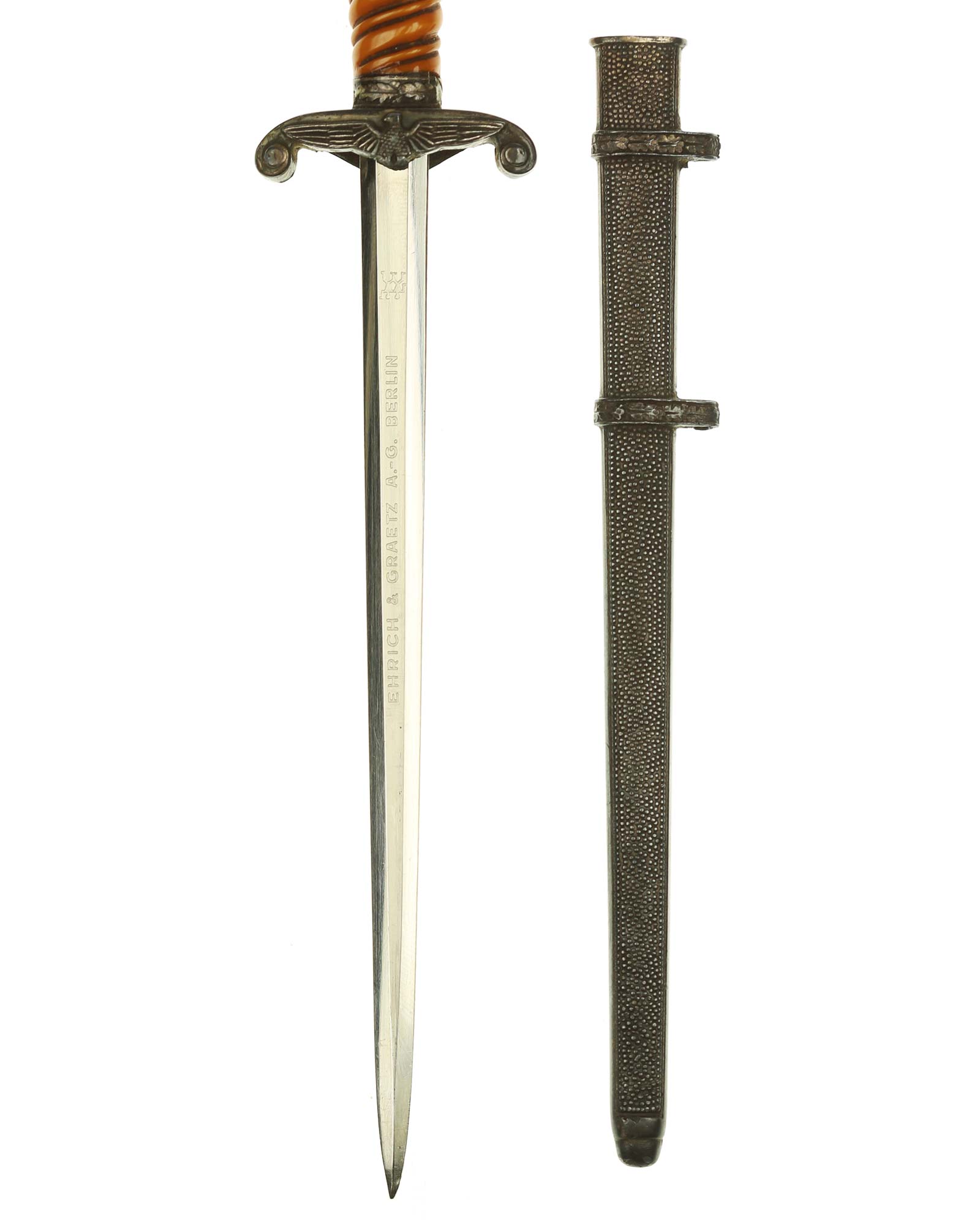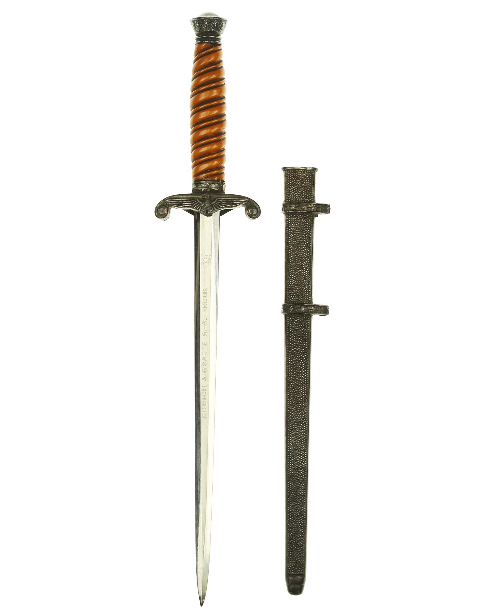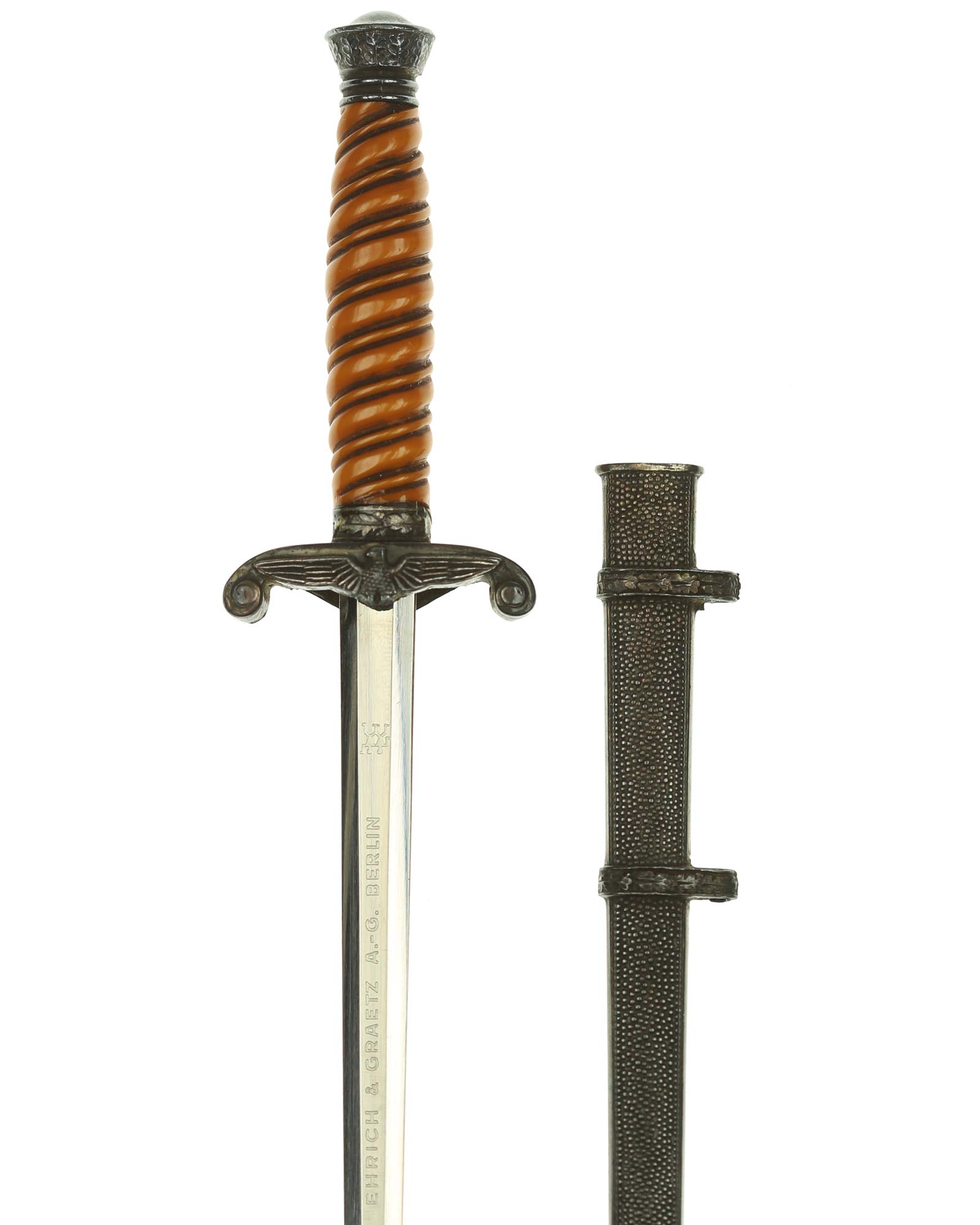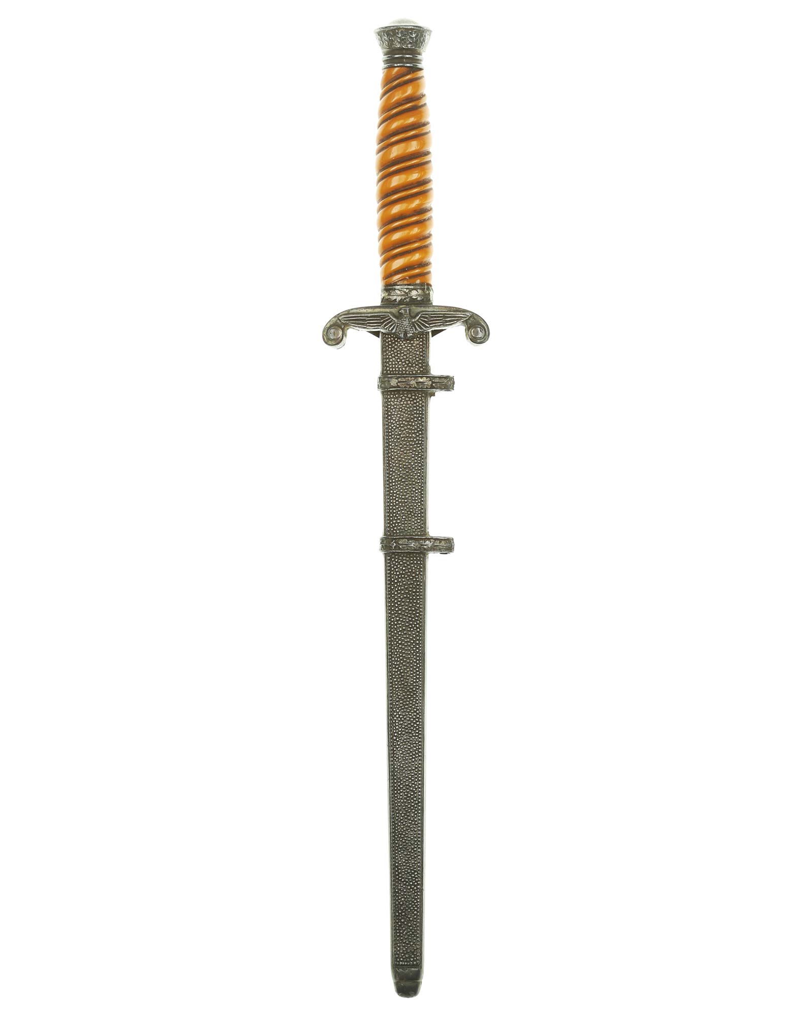 Grip: The grip of this dagger is a orange color and remains in fine condition. The pommel shows minor traces of carrying time on the upper end, but still has frosting around the edges. The eagle has quite a bit of frosting clinging to the recessed areas as well as the upper arms of the guards. It shows virtually no wear and retains full, crisp detailing throughout.