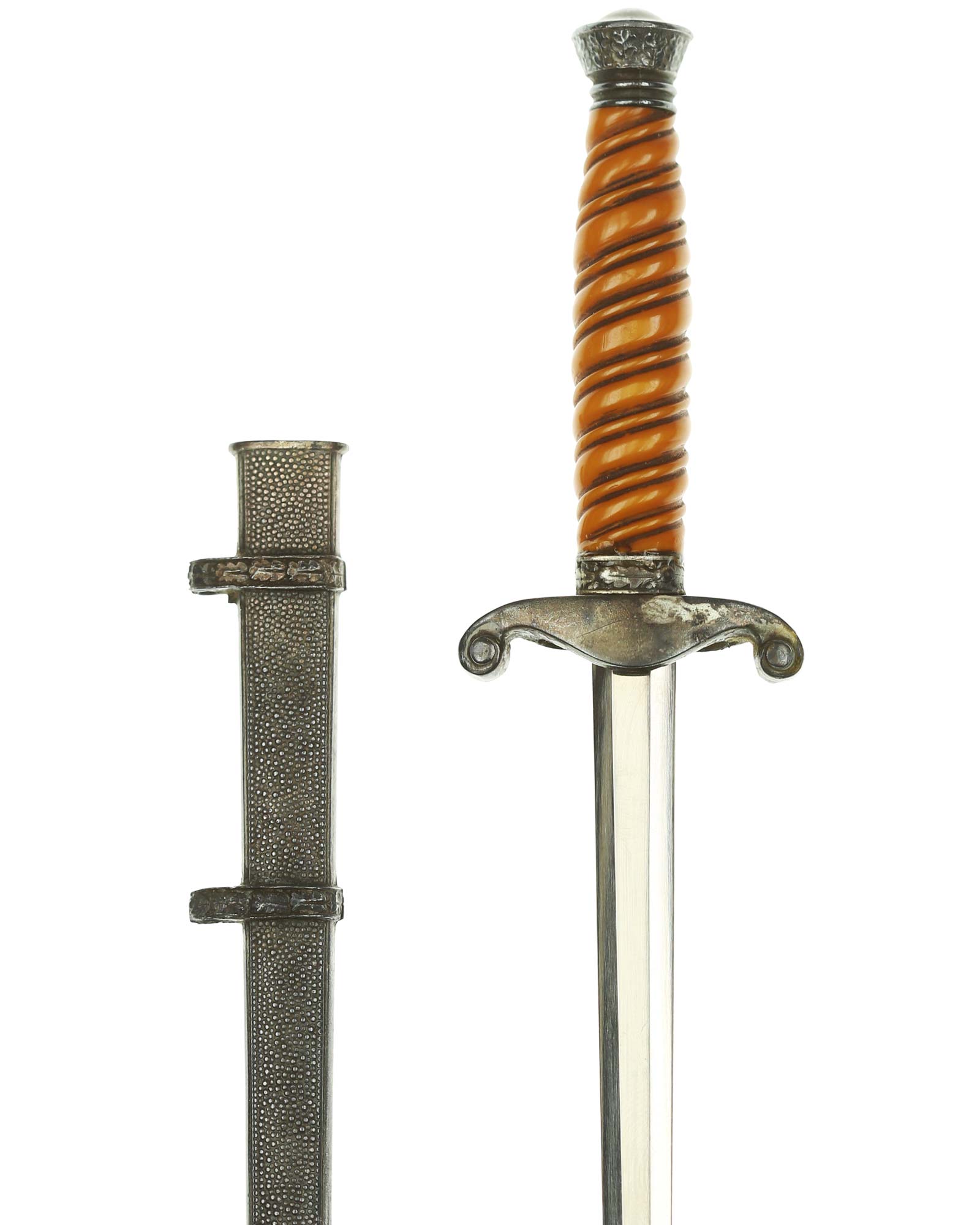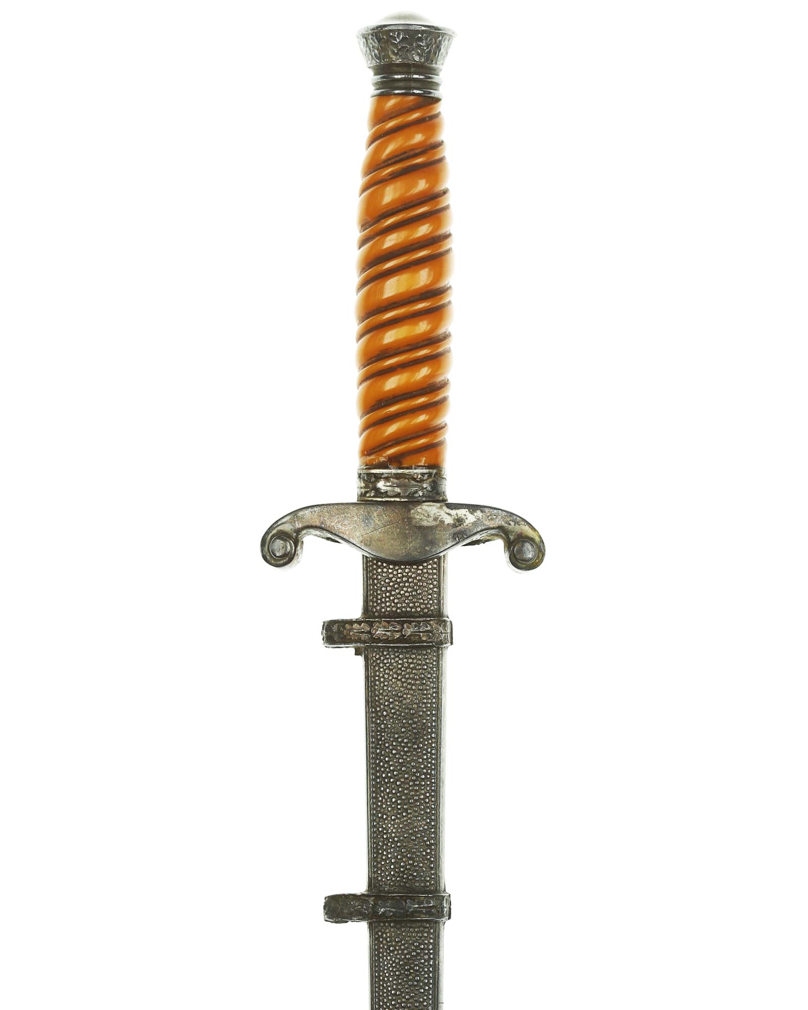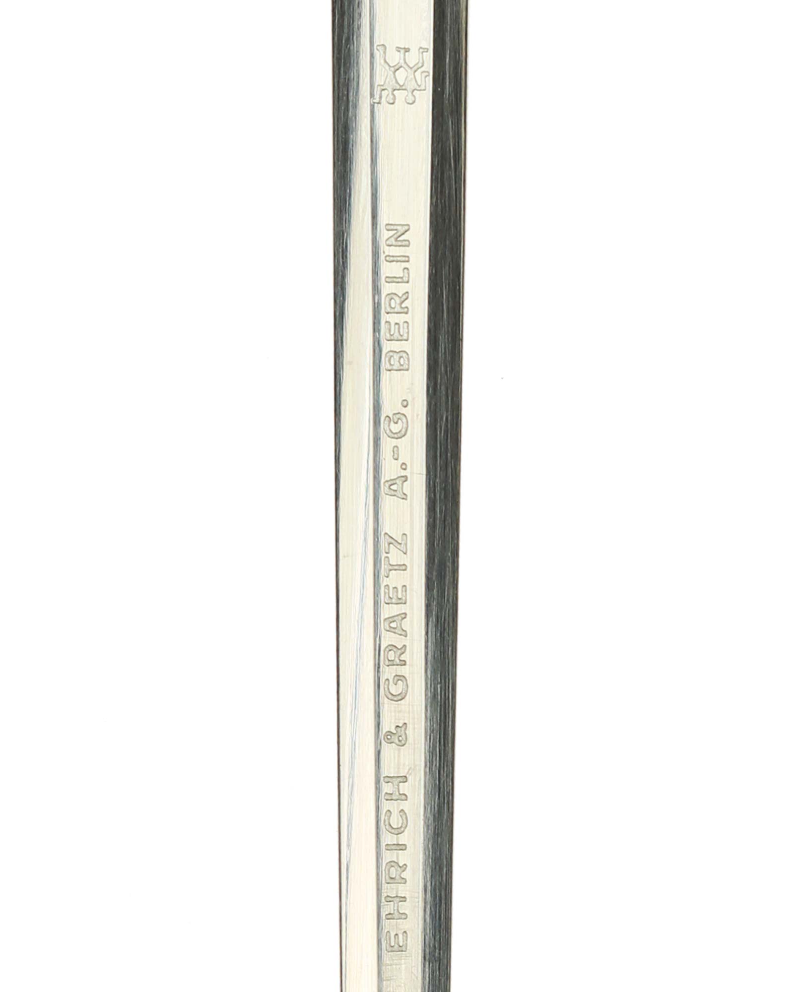 Scabbard: The scabbard is straight as an arrow. It retains its crisp pebbled panel design. There are frosted remains in the protected areas around the carrying bands. The bands are very fine with each overlapping oak leaf reflecting hand-enhancing.