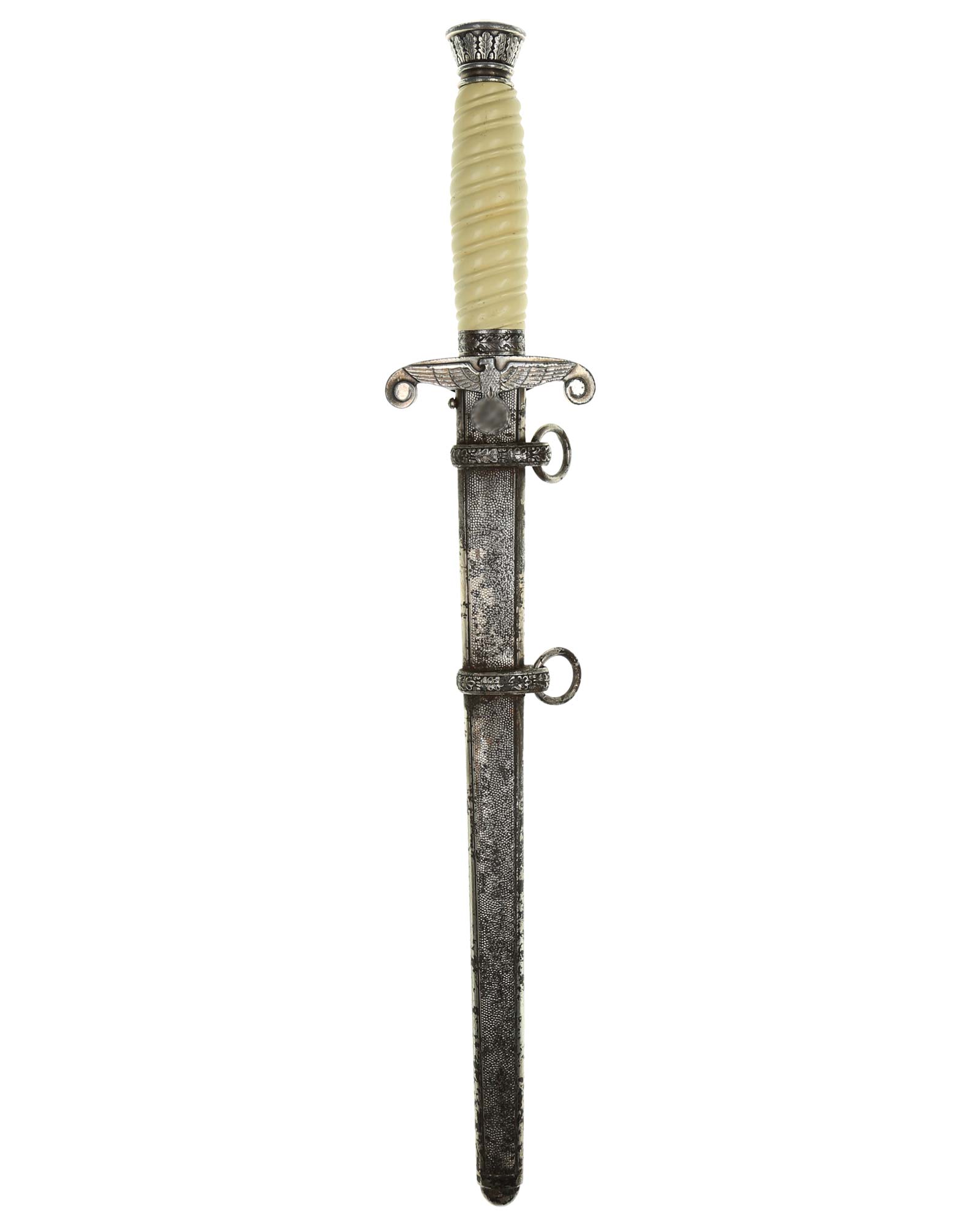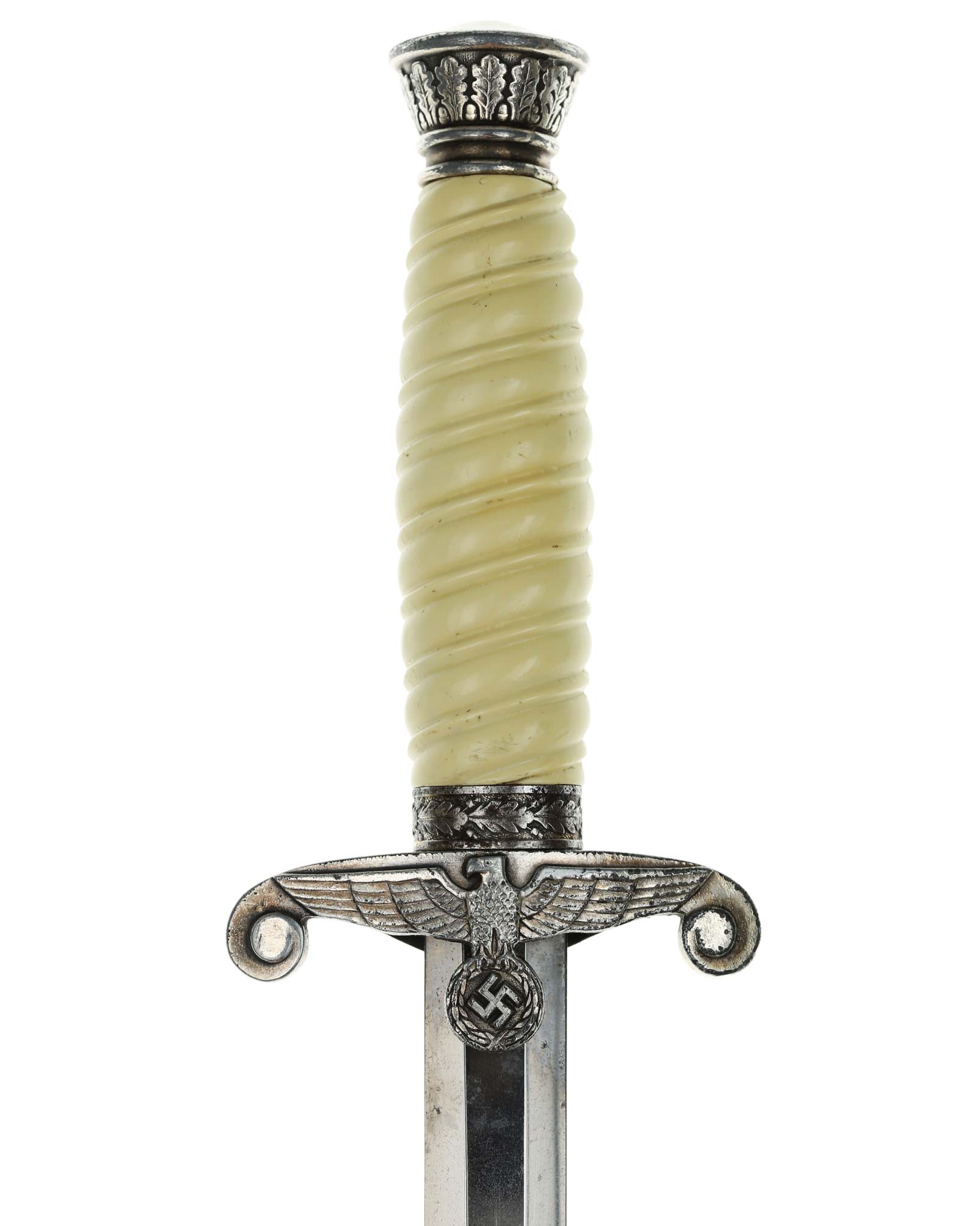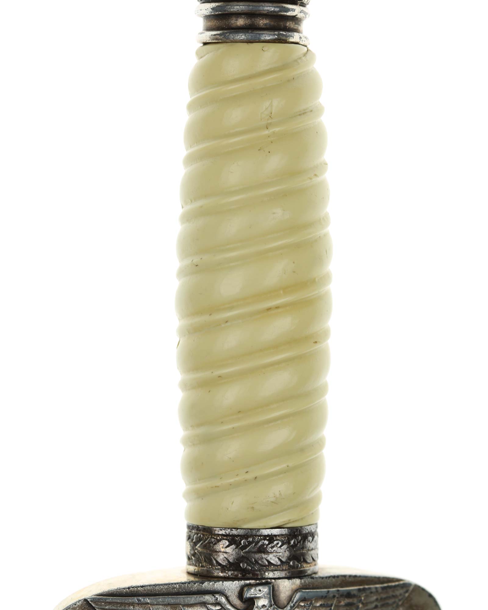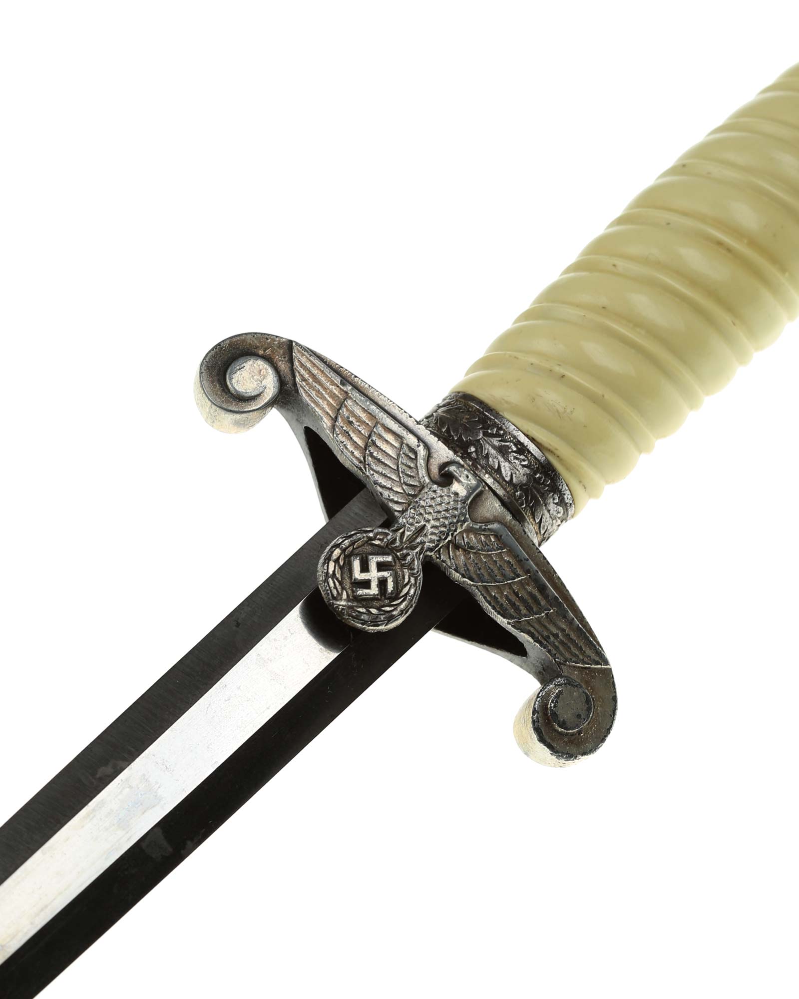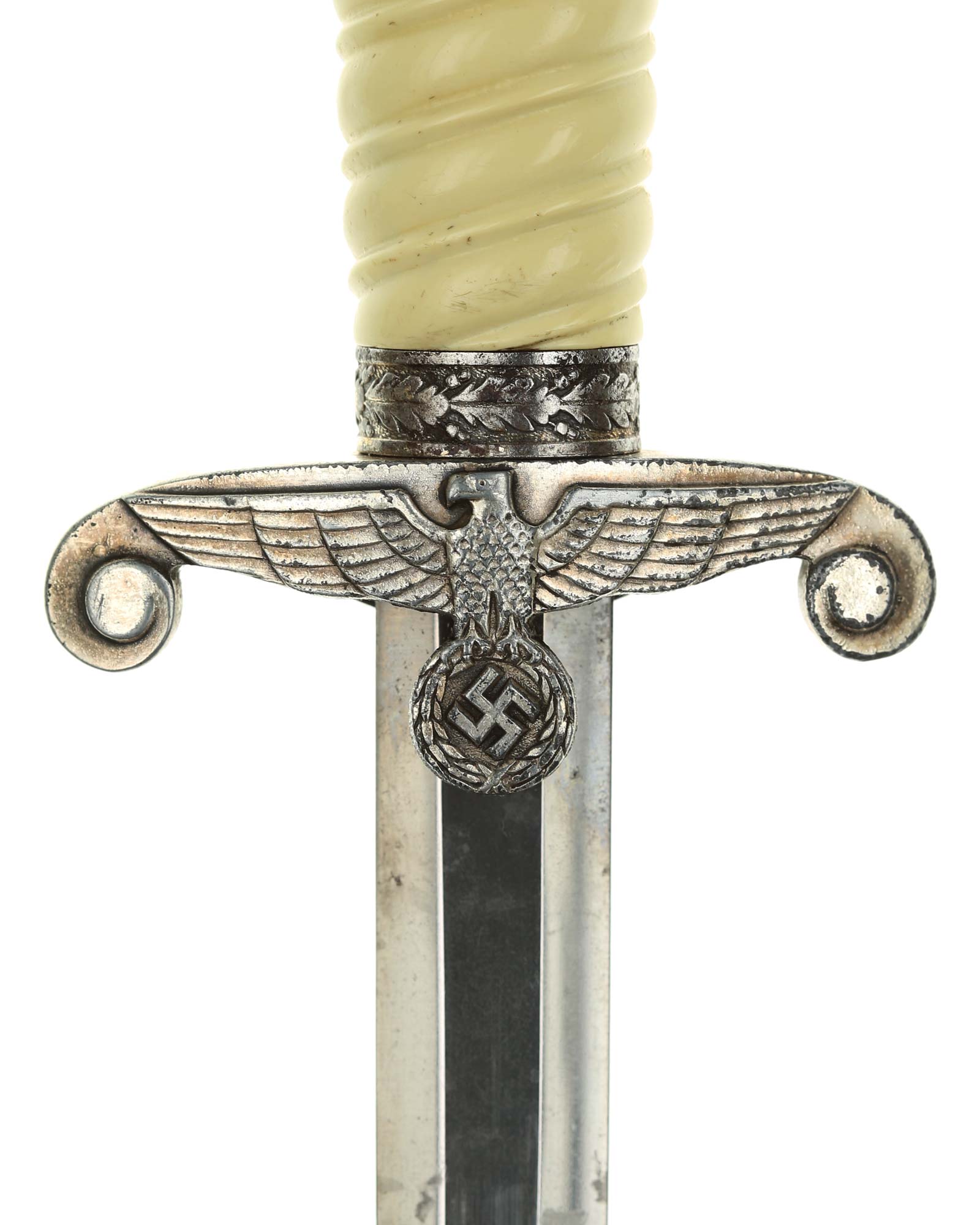 Grip: The grip of this dagger is an off-white style, which is probably plaster filled. The grip remains in good concealed and has good character to it. The pommel is a good example. The crossguard shows some minor wear to the edges of the breast feathering, but is otherwise nice and crisp throughout the bird.