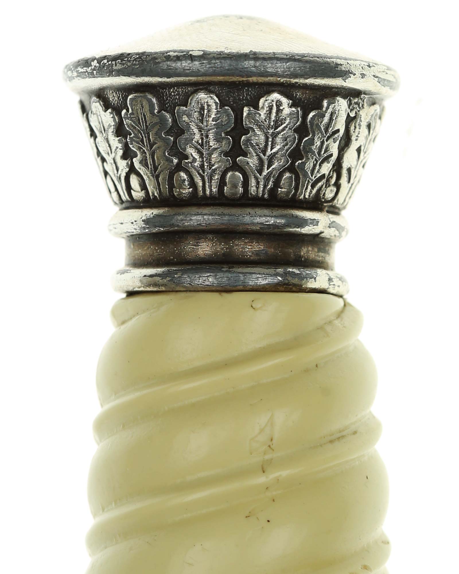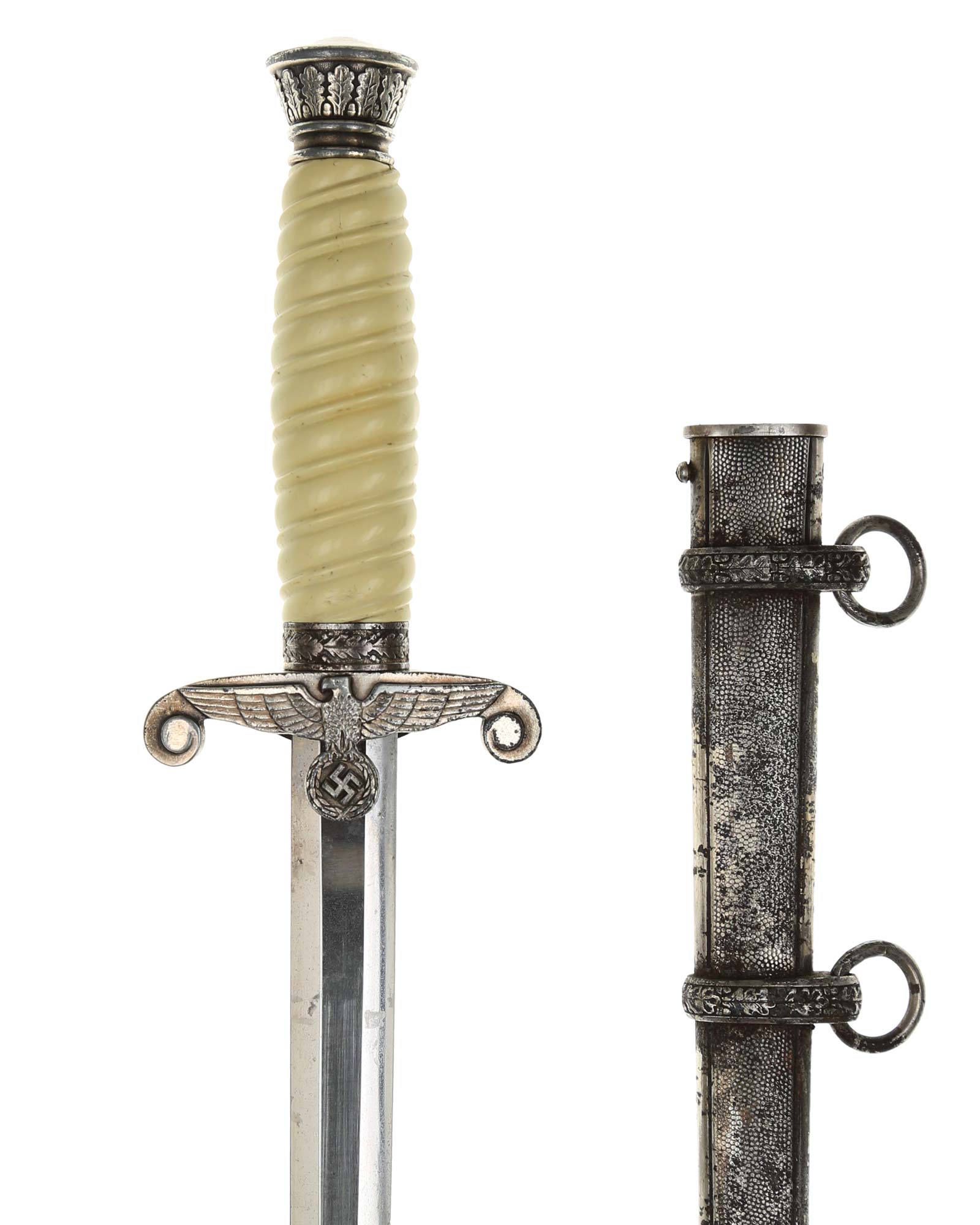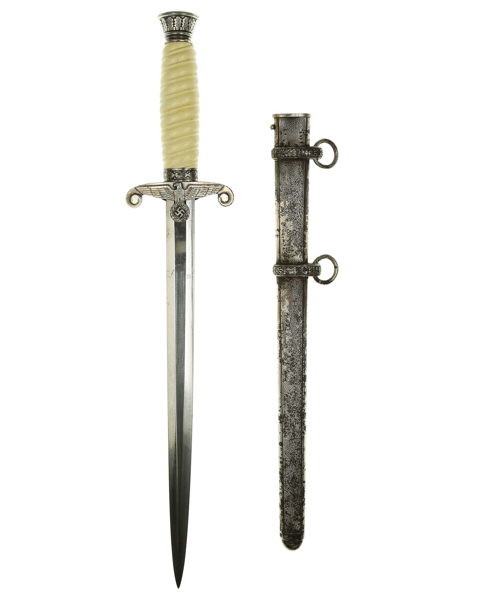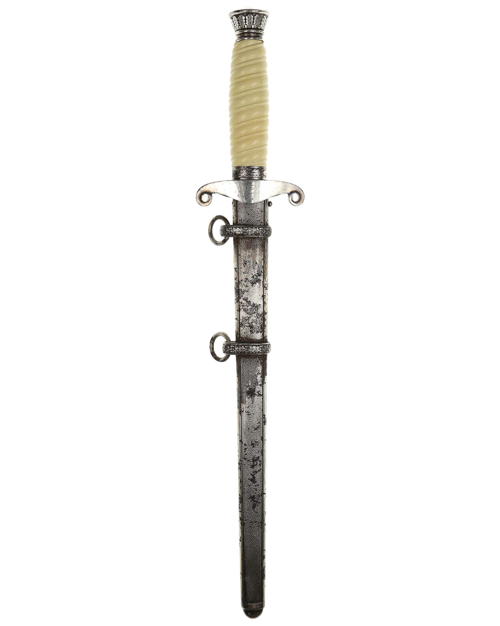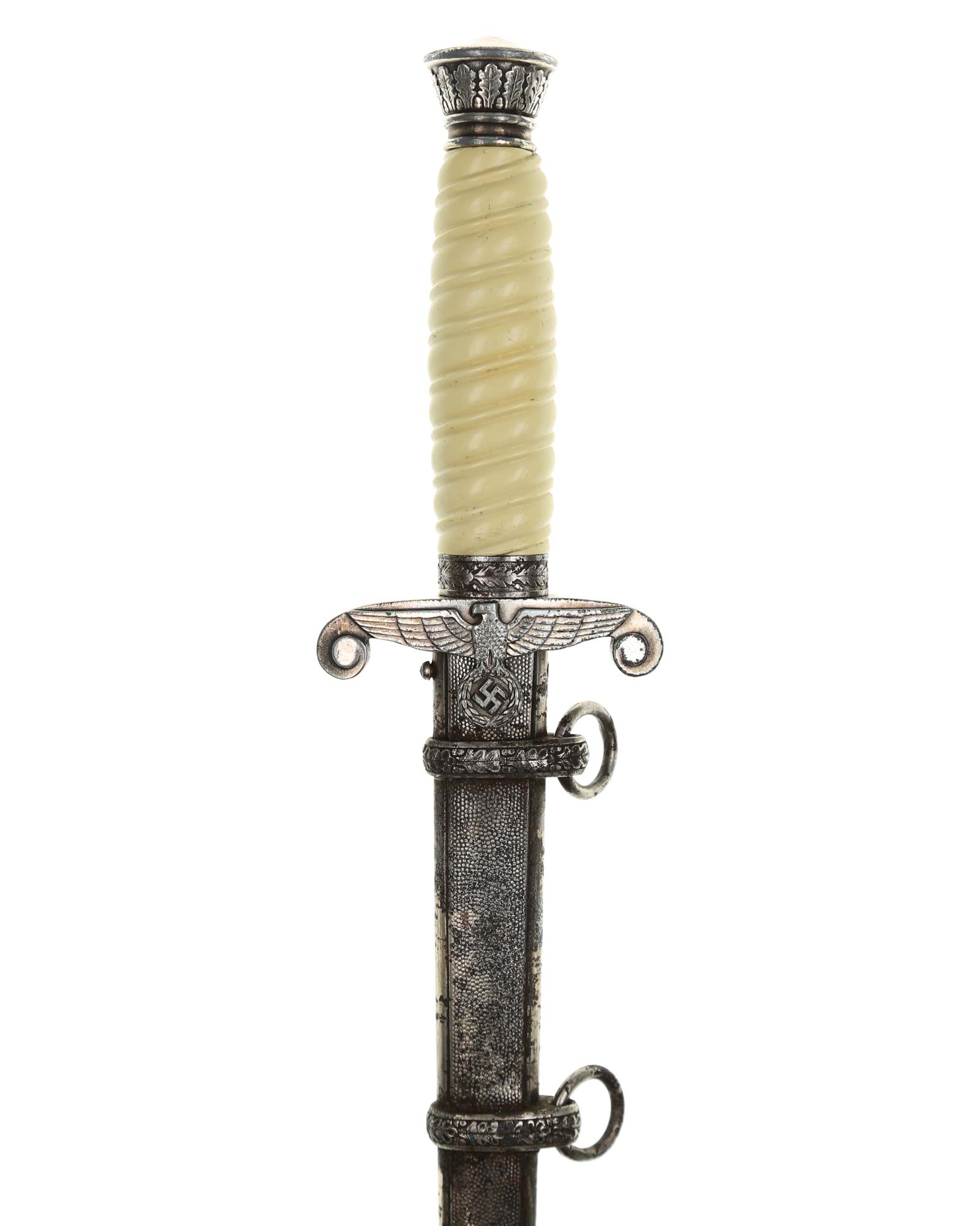 Grip: The grip of this dagger is an off-white style, which is probably plaster filled. The grip remains in good concealed and has good character to it. The pommel is a good example. The crossguard shows some minor wear to the edges of the breast feathering, but is otherwise nice and crisp throughout the bird.