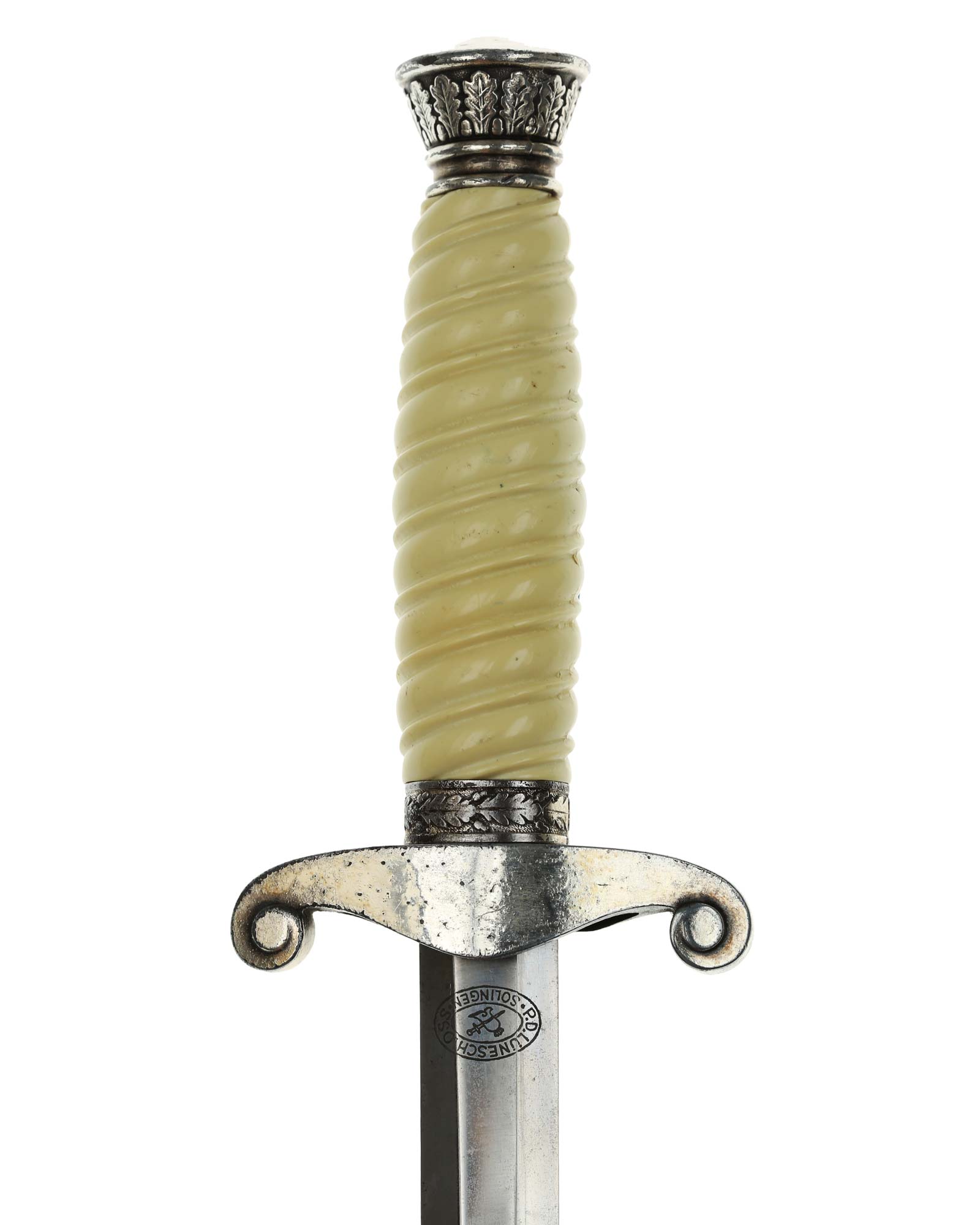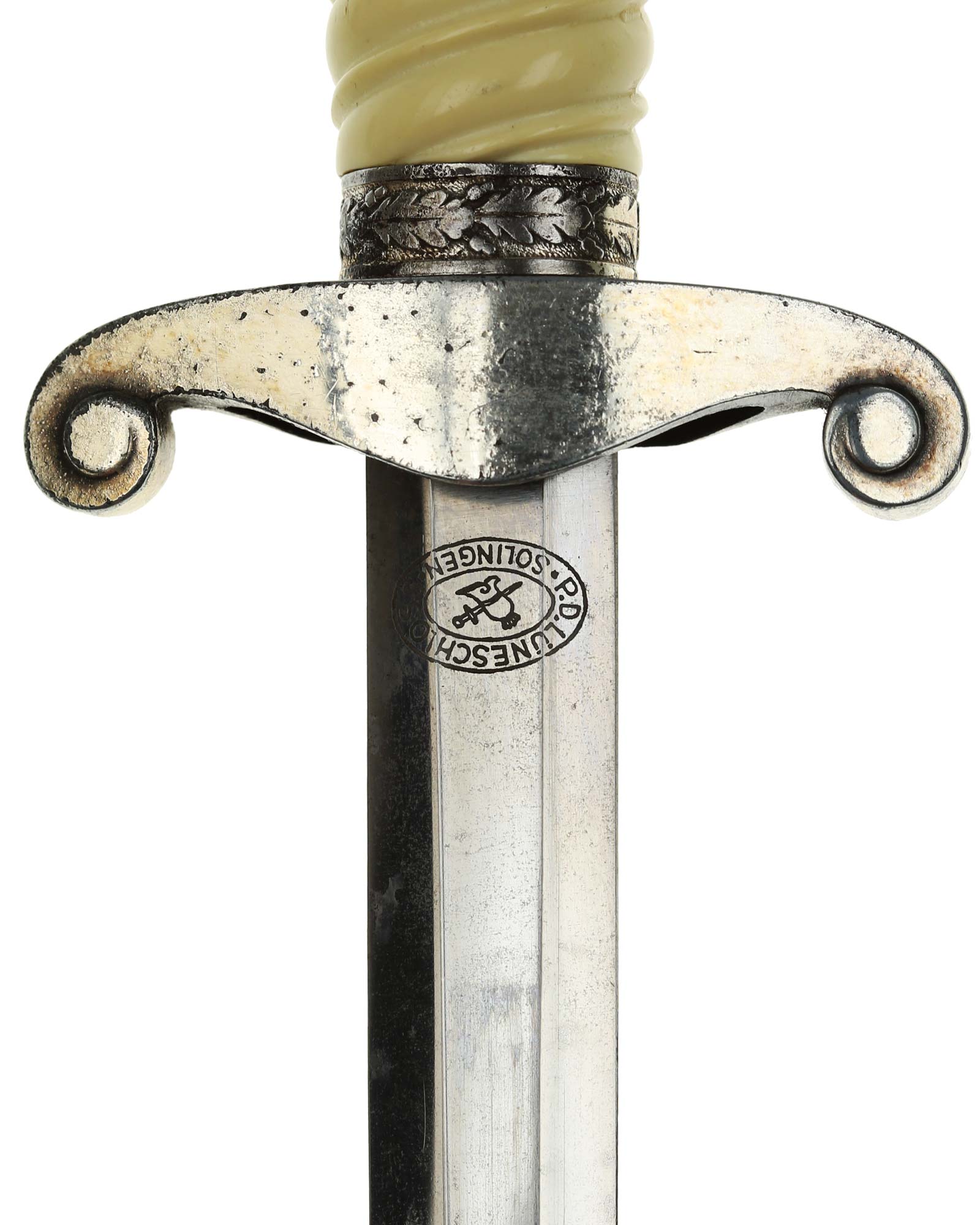 Blade: The blade is also in EXC++ condition, with all of the crossgrain, a mirror finish and a needle-like tip. This remarkable near mint blade is etched on the reverse with the trademark having the firm's initials and location, “P. D. Lüneschloss Solingen”.
