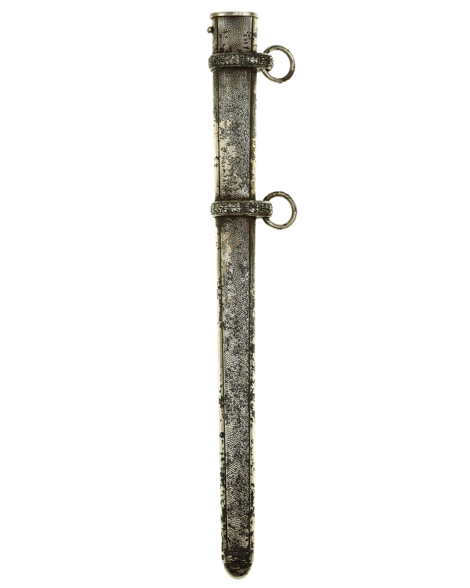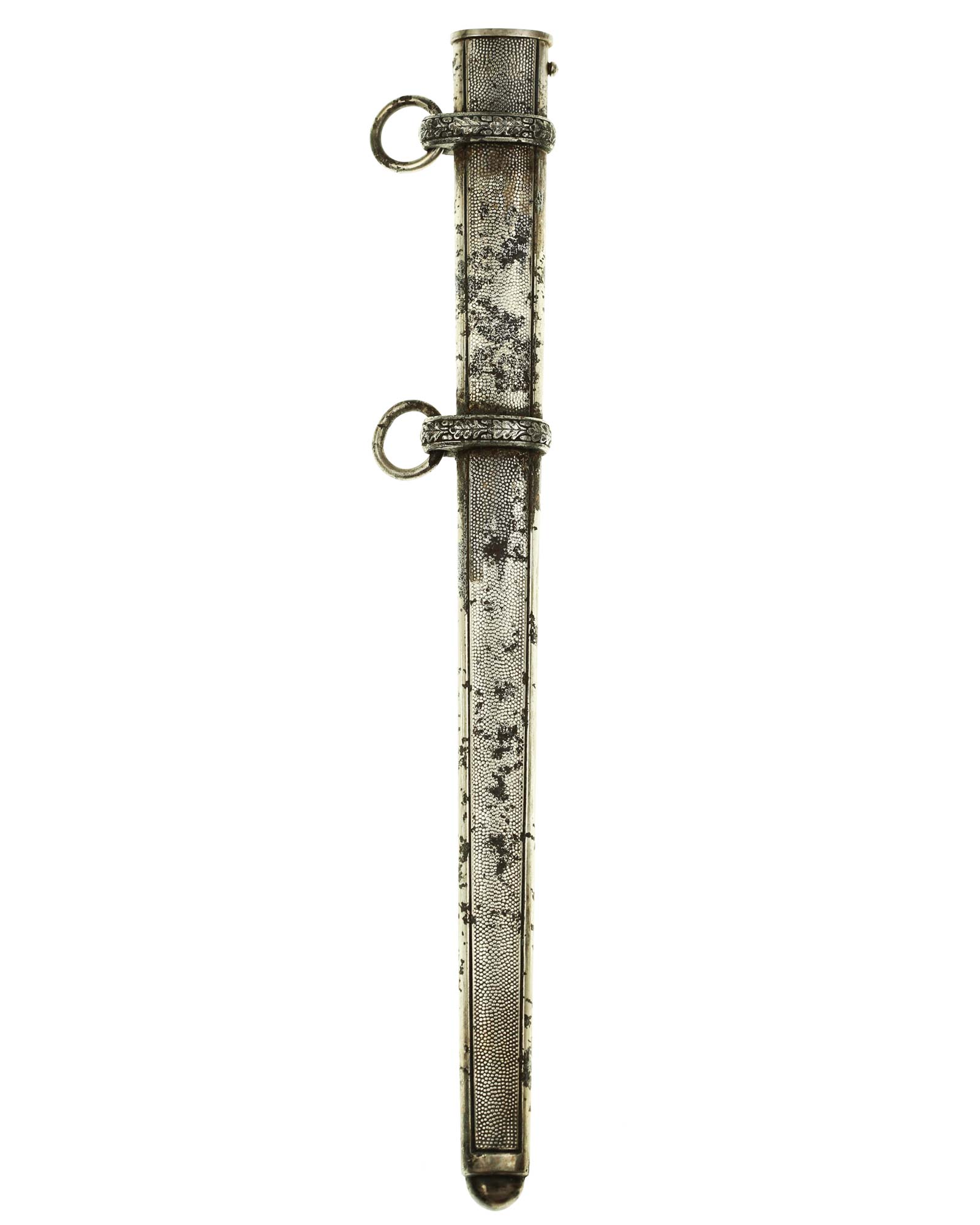 Scabbard: The bands feature overlapping oak leaves, with each leaf having hand enhancement to the veins. The throat is a thicker style and is retained by side screw.