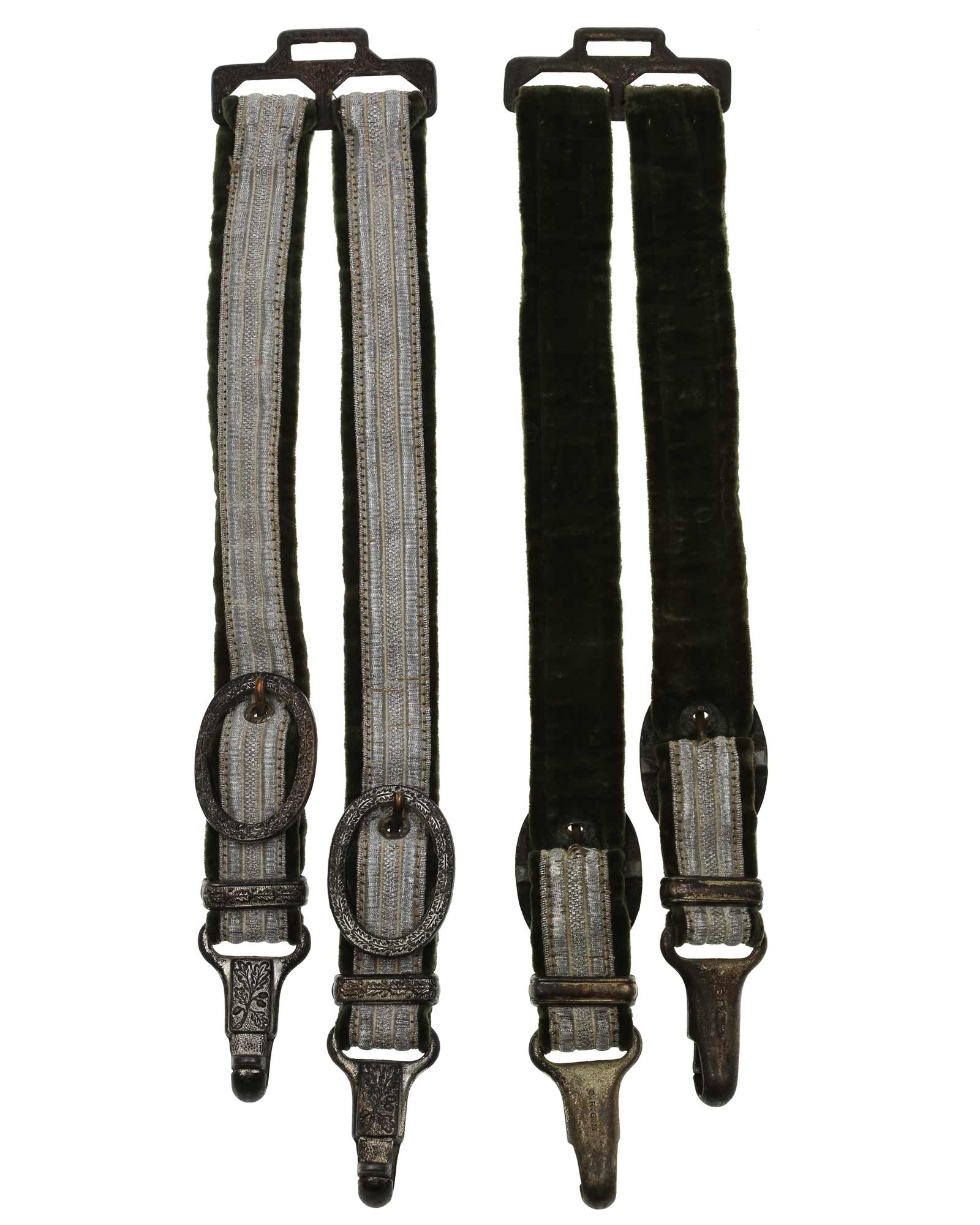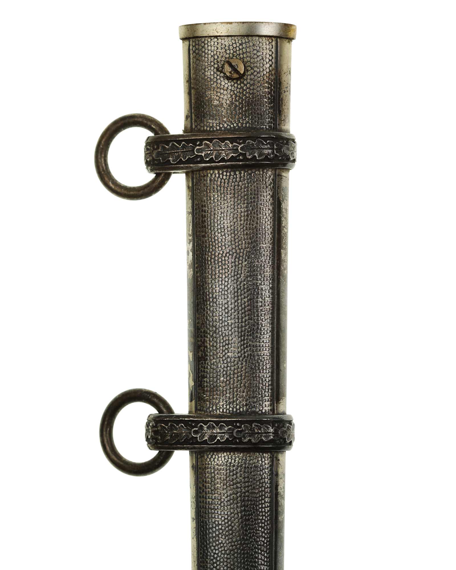 Scabbard: The scabbard is straight as an arrow, being the 2nd Style. It retains its crisp pebbled panel design. There are frosted remains in the protected areas around the carrying bands. The bands are very fine with each overlapping oak leaf reflecting hand-enhancing. The thick-style throat is retained by a single screw in the reverse center.