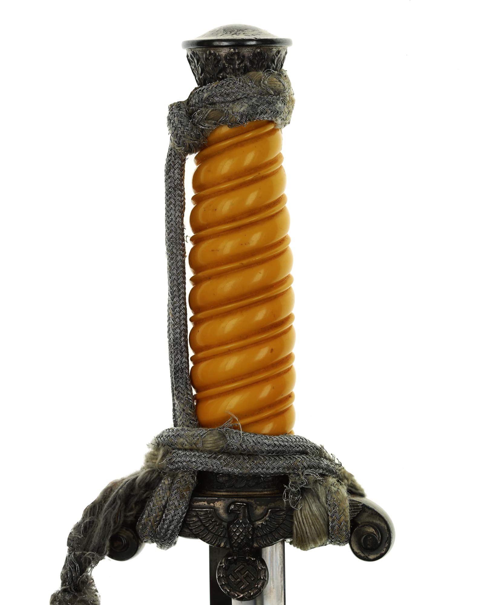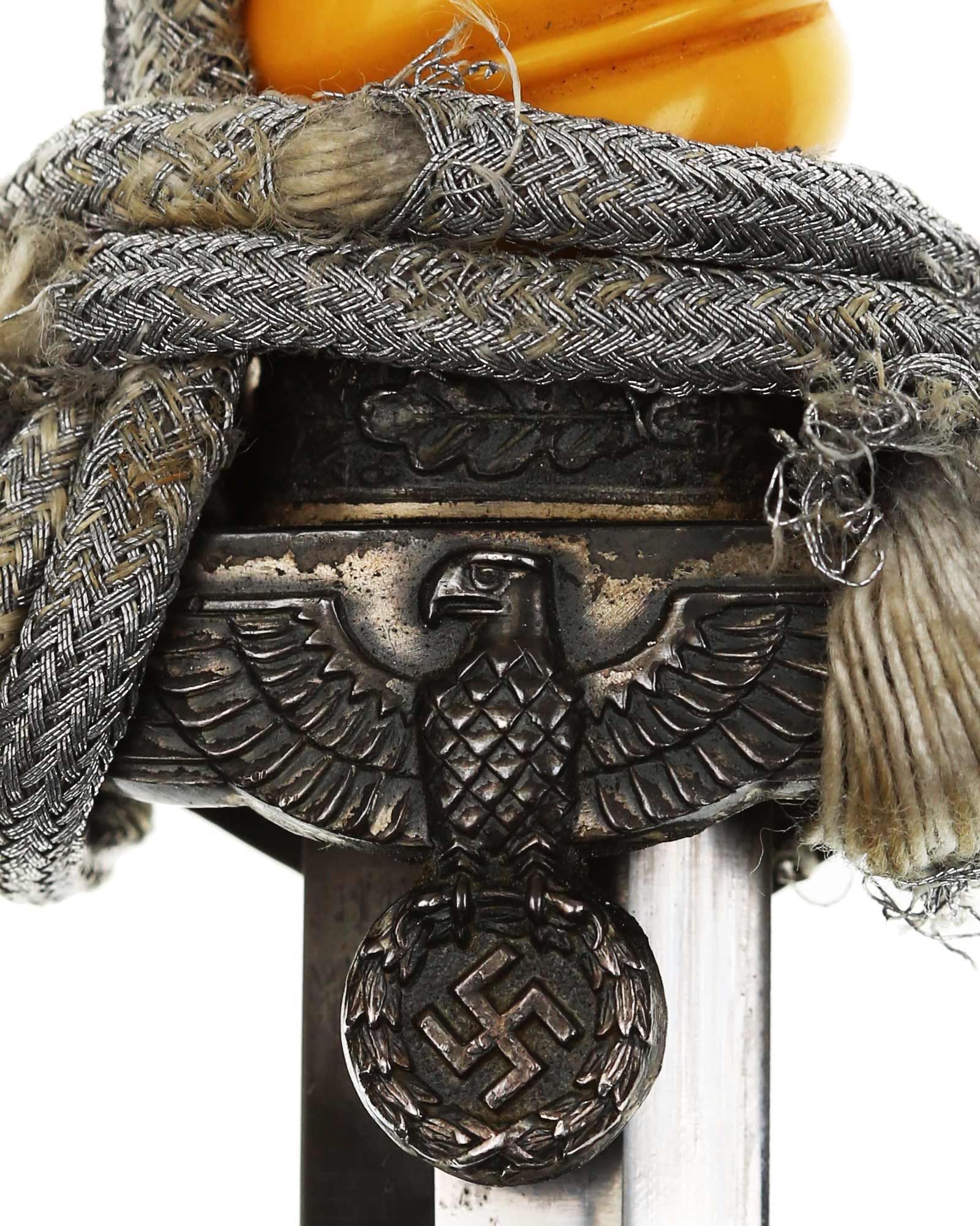Grip: The grip of this dagger is a orange color and remains in perfect condition. The pommel shows minor traces of carrying time on the upper end, but still has frosting around the edges. The 12 standing oak leaves are in excellent condition, all having hand enhancement. The eagle has quite a bit of frosting clinging to the recessed areas as well as the upper arms of the guards.