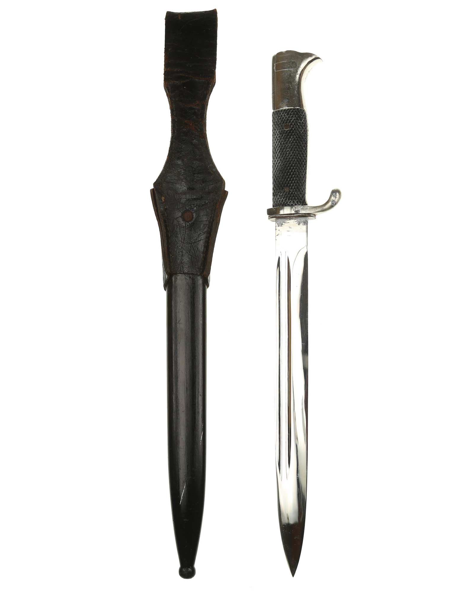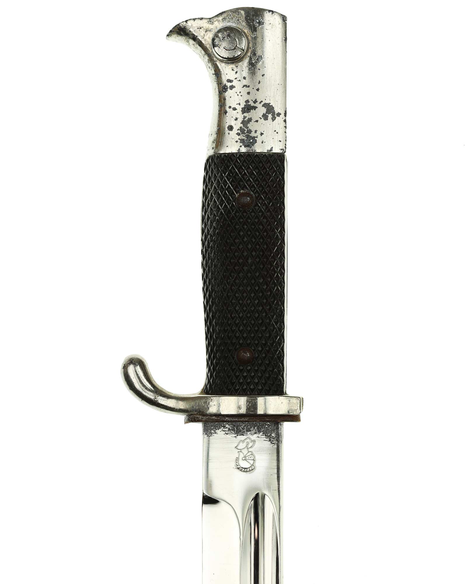 German WW2 period Long Army Dress Bayonet in EXC condition, the nickle silver plated blade is 251 mm, makers mark WKC Solingen, nickle silver plated hilt, it is complete with steel scabbard.