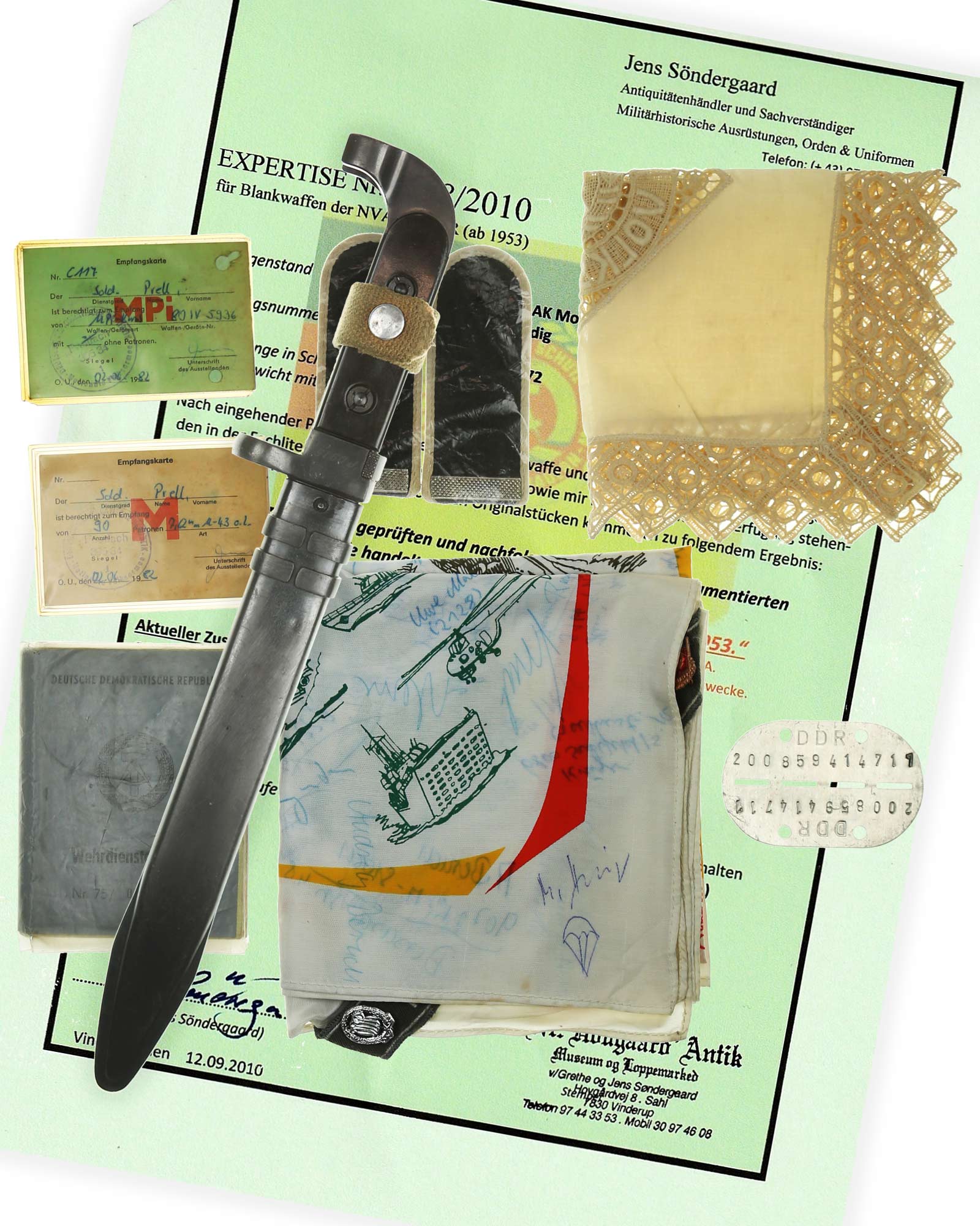 AK bayonet M1947 (type 6Ch2) with iron scabbard. Plastic handle. Overall length 32.8 cm. Single-edged blade. The crossguard is marked (P0915). Total weight 390 g. Overall length: 328 mm. Condition Near Mint.