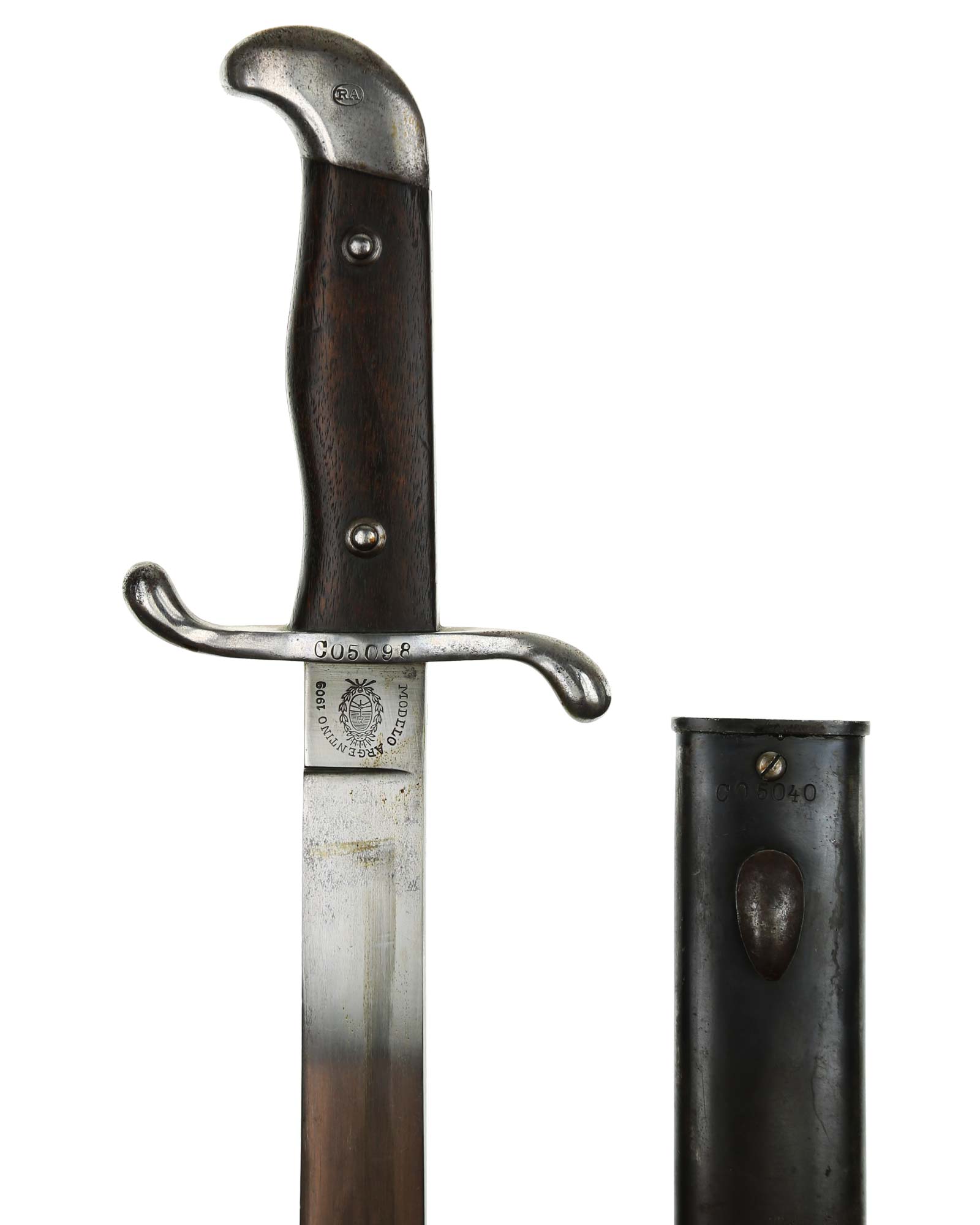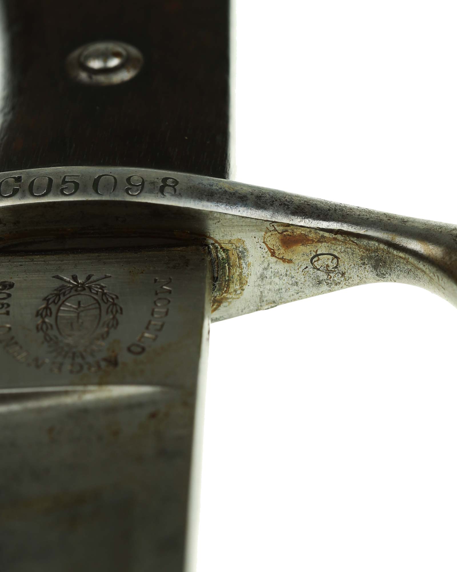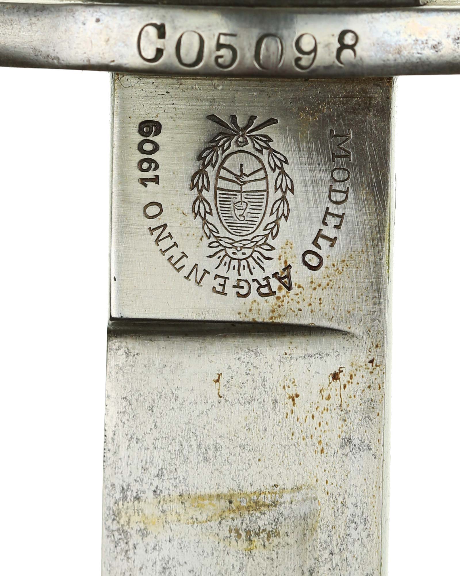 Argentine Machete / Bolo made in Germany by WKC in 1909, Modelo Argentino 1909 Sword or Machete, manufactured by Weyersberg Kirschbaum and Company of Solingen, Germany. Massive military issue jungle machete with numbered scabbard (05040) and a full Argentine crest on the blade. Used by the Argentine Elite Commando Force or Argentine Artillery. Wood grips, affixed with two rivets, have no cracks. Pommel is marked with an RA in a circle. Crossguard with number C05098.
