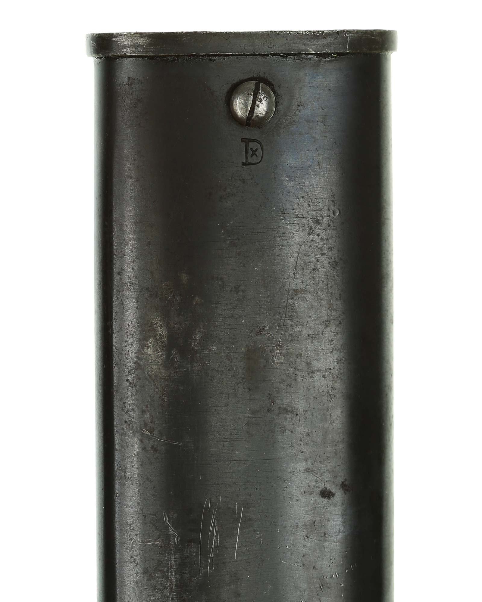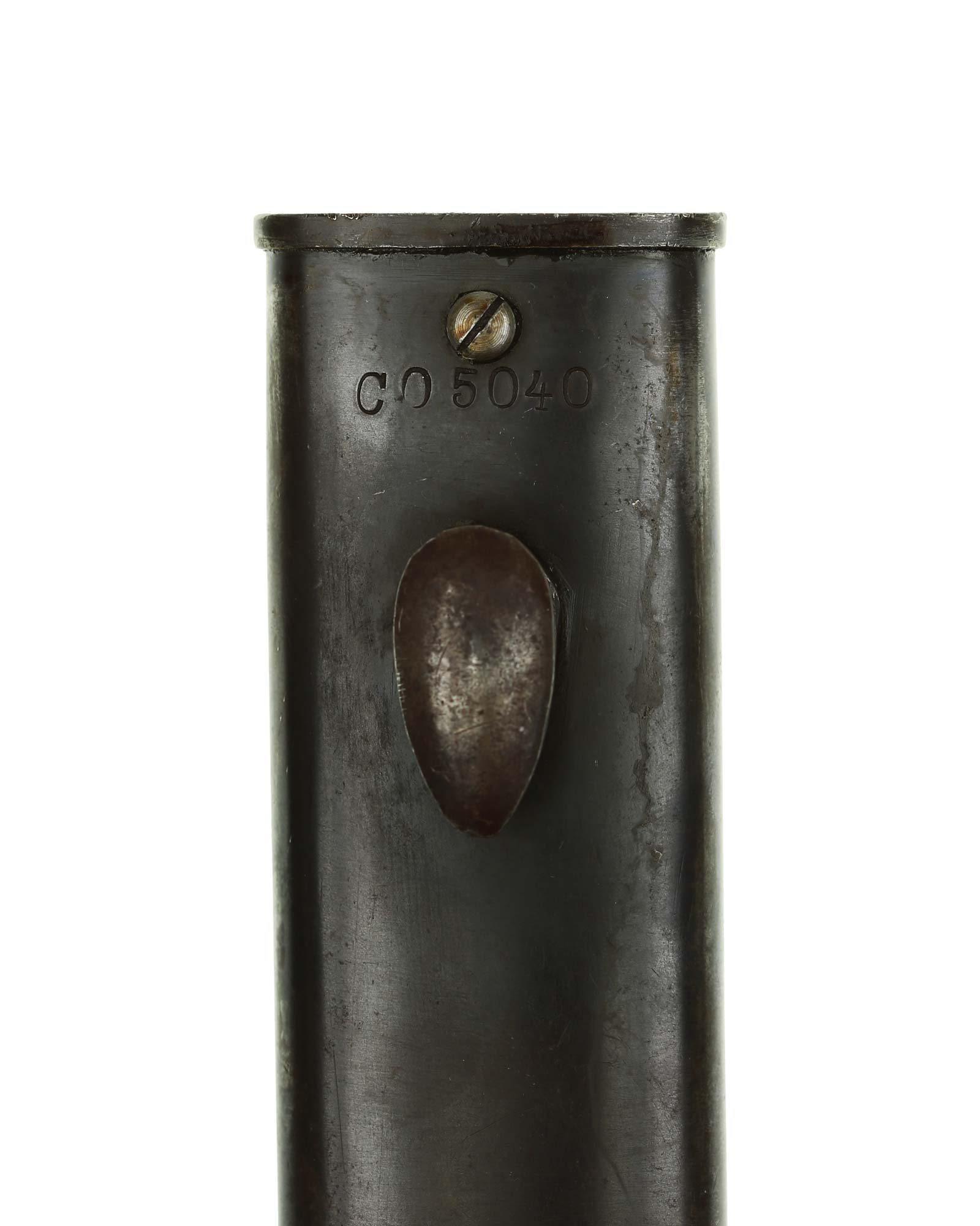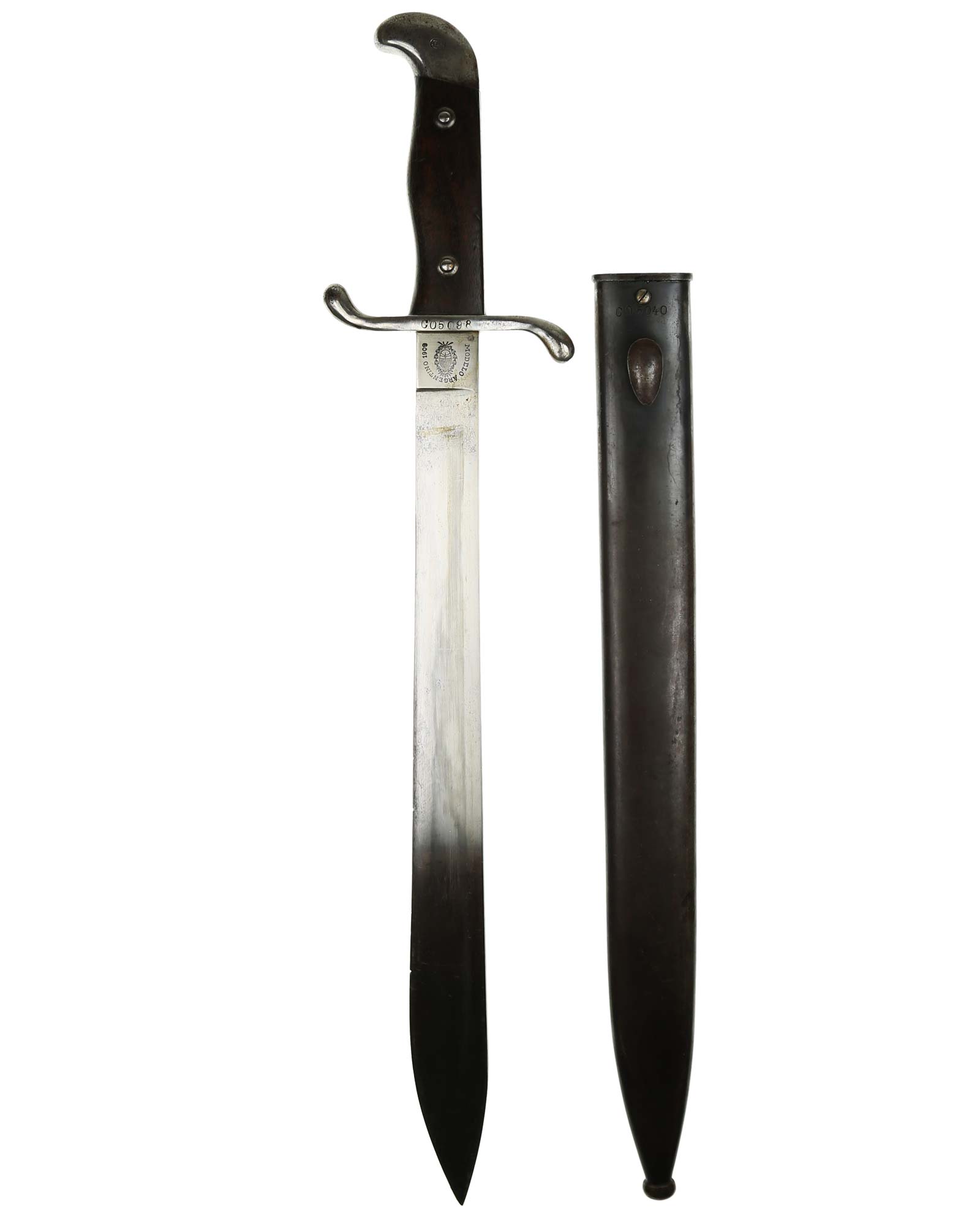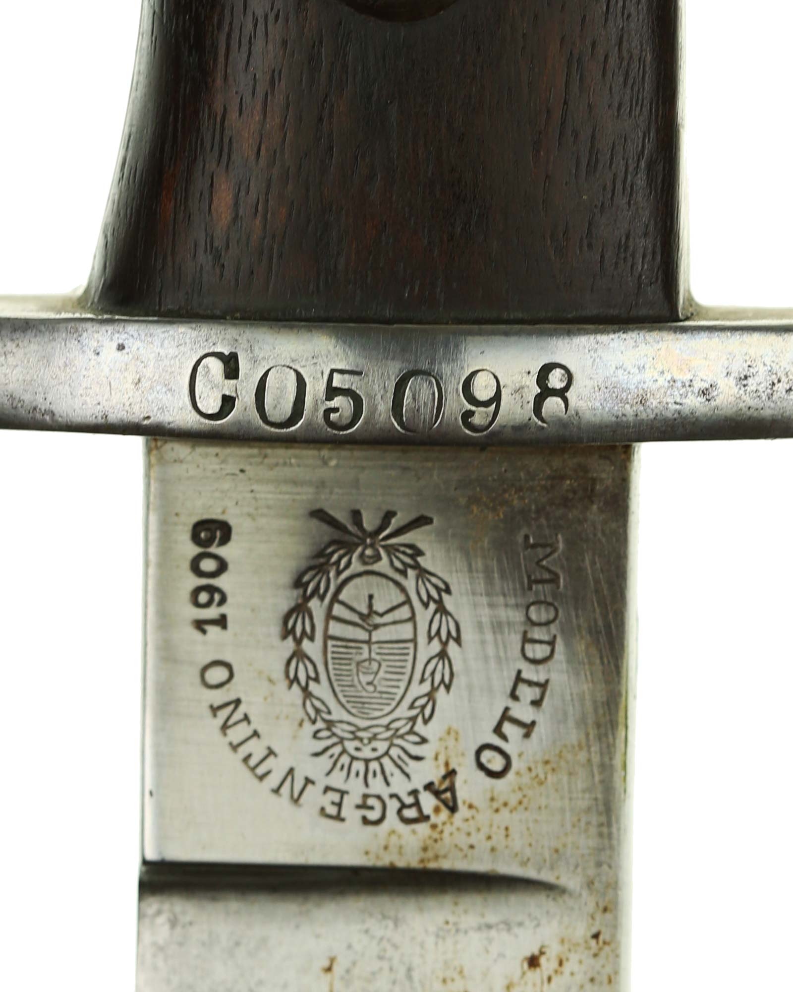 Argentine Machete / Bolo made in Germany by WKC in 1909, Modelo Argentino 1909 Sword or Machete, manufactured by Weyersberg Kirschbaum and Company of Solingen, Germany. Massive military issue jungle machete with numbered scabbard (05040) and a full Argentine crest on the blade. Used by the Argentine Elite Commando Force or Argentine Artillery. Wood grips, affixed with two rivets, have no cracks. Pommel is marked with an RA in a circle. Crossguard with number C05098.