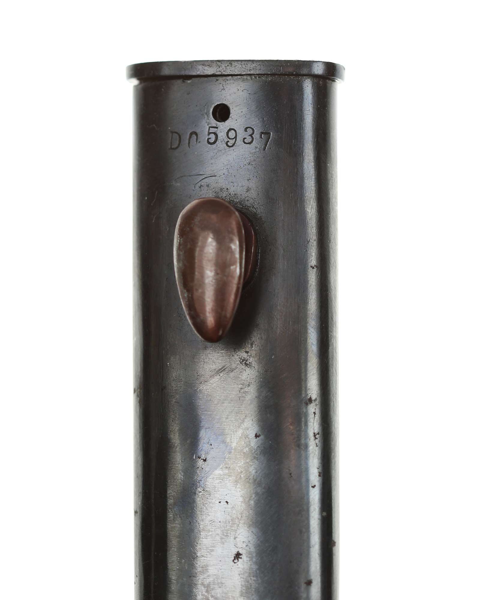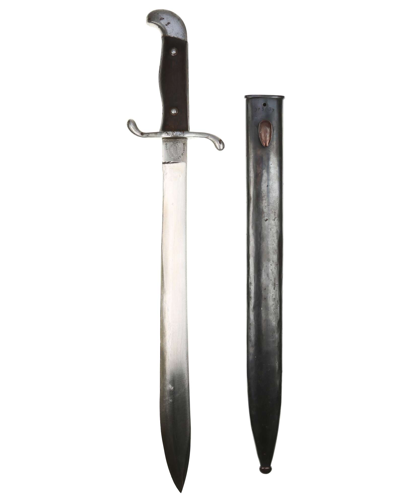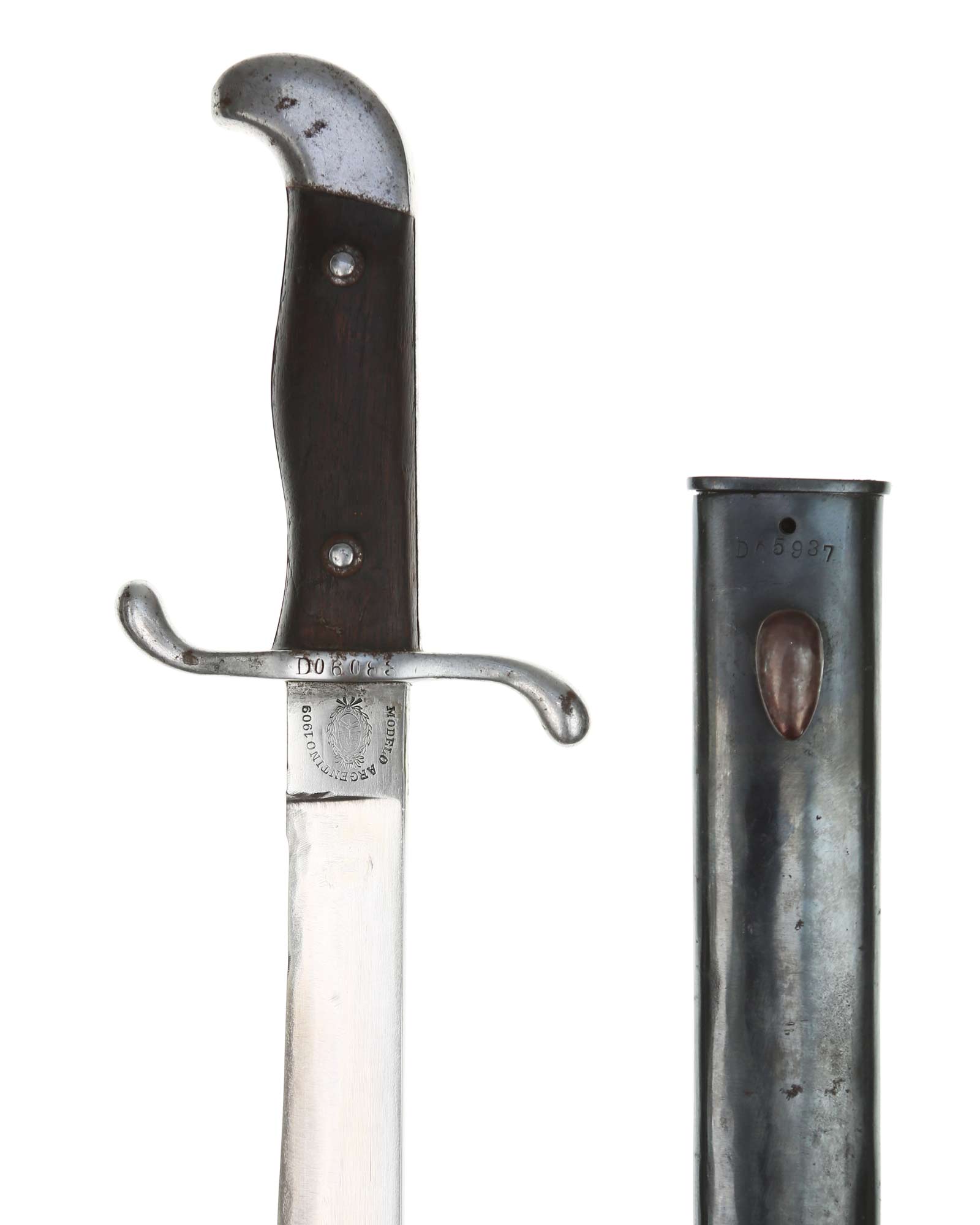Argentine Machete / Bolo made in Germany by WKC in 1909, Modelo Argentino 1909 Sword or Machete, manufactured by Weyersberg Kirschbaum and Company of Solingen, Germany. Massive military issue jungle machete with numbered scabbard (D05937) and a full Argentine crest on the blade. Used by the Argentine Elite Commando Force or Argentine Artillery. Wood grips, affixed with two rivets, have no cracks. Pommel is marked with an RA in a circle. Crossguard with number D06083.
