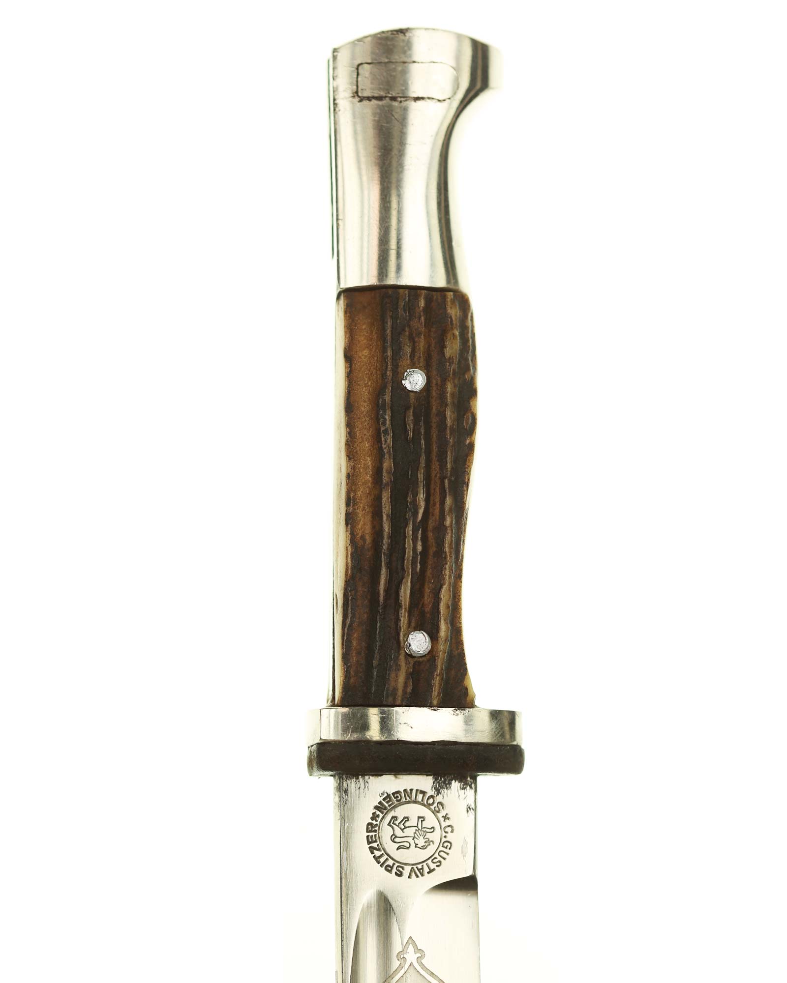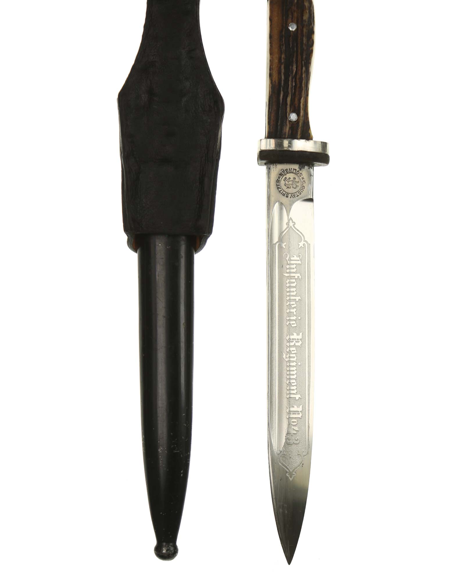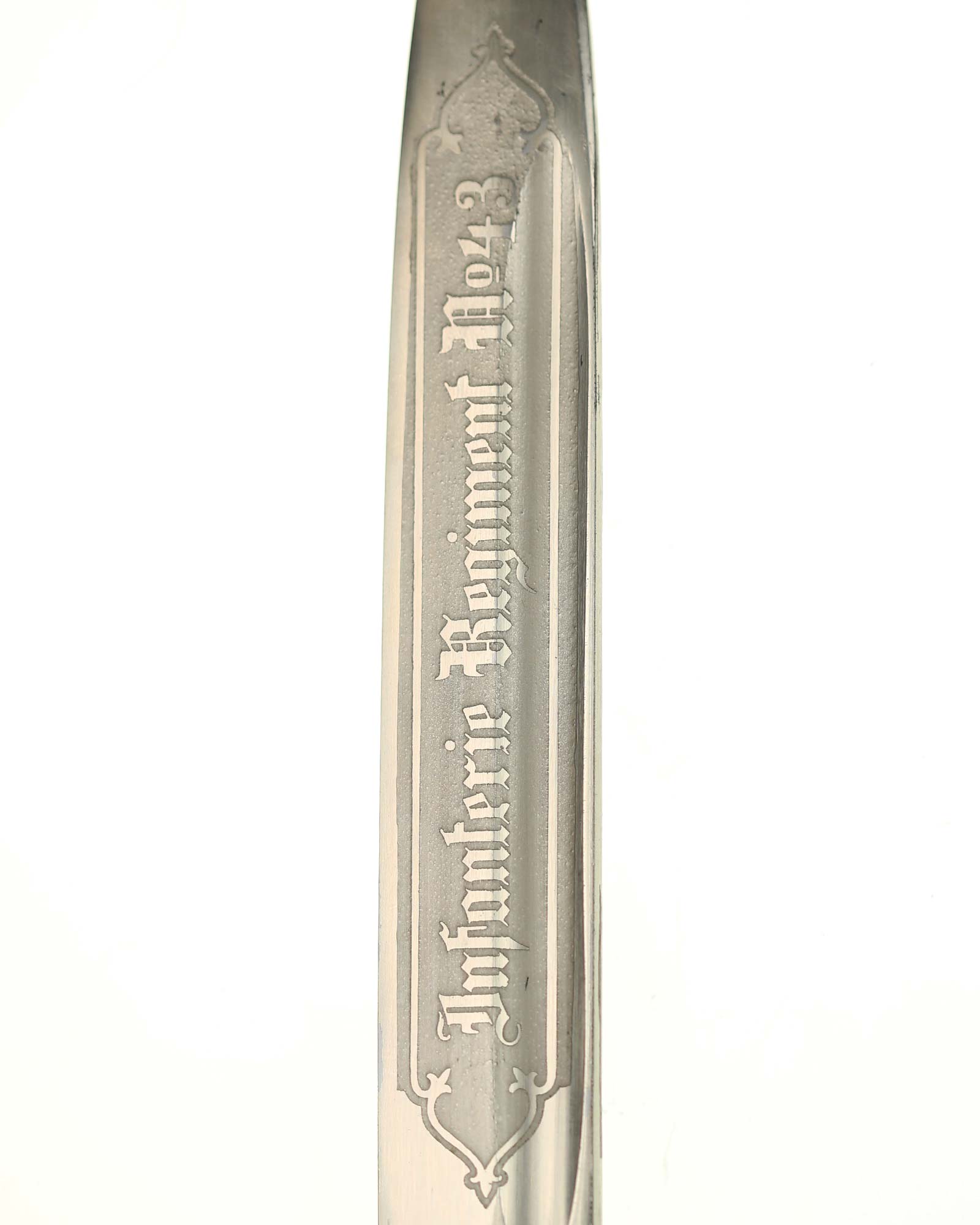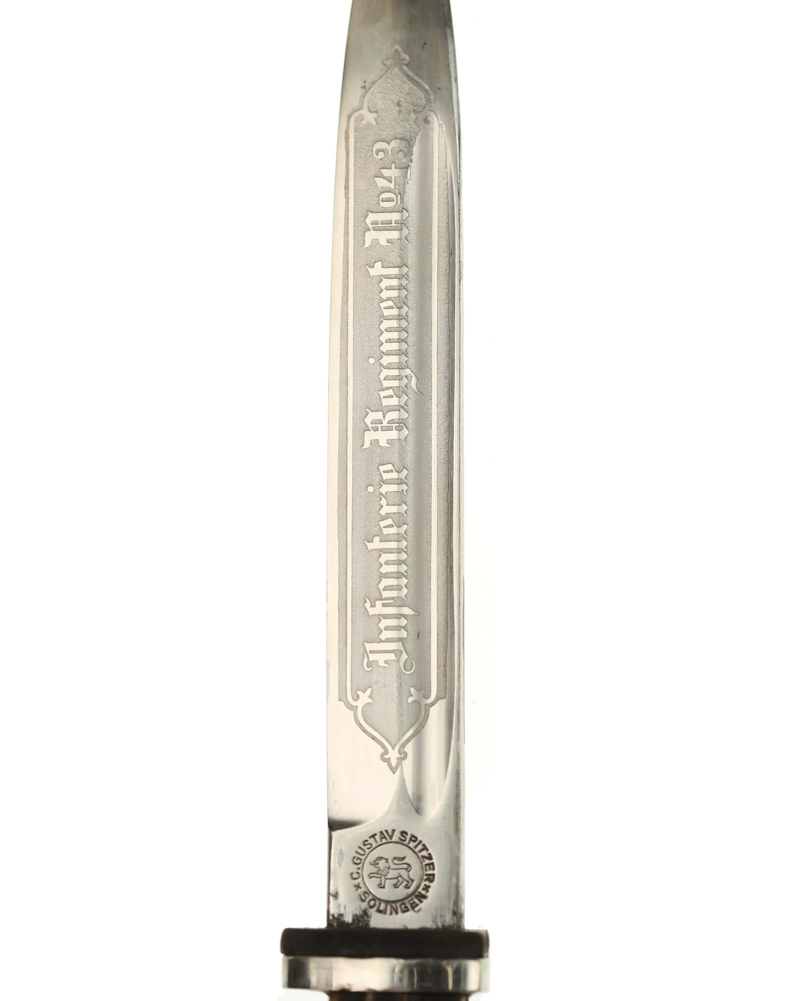 Blade: The blade has a fine fuller. This blade is bright throughout and is in near mint condition. The obverse has Pattern with inscription "The Erinnerung an meine Dienstzeit". The reverse is stamped with the maker mark Gustav Spitzer Solingen, the second etched "Infanterie Regiment No 43", and the original blade washer is in place.