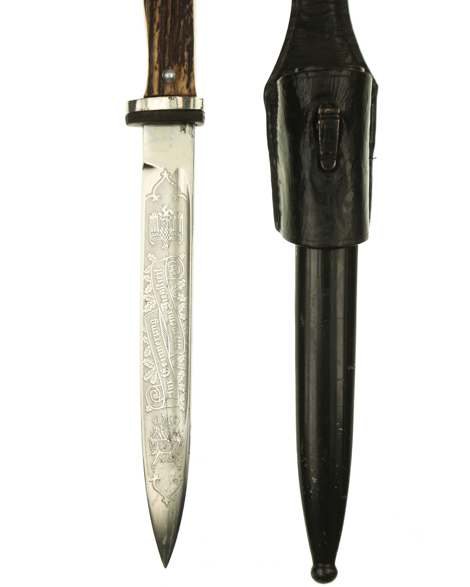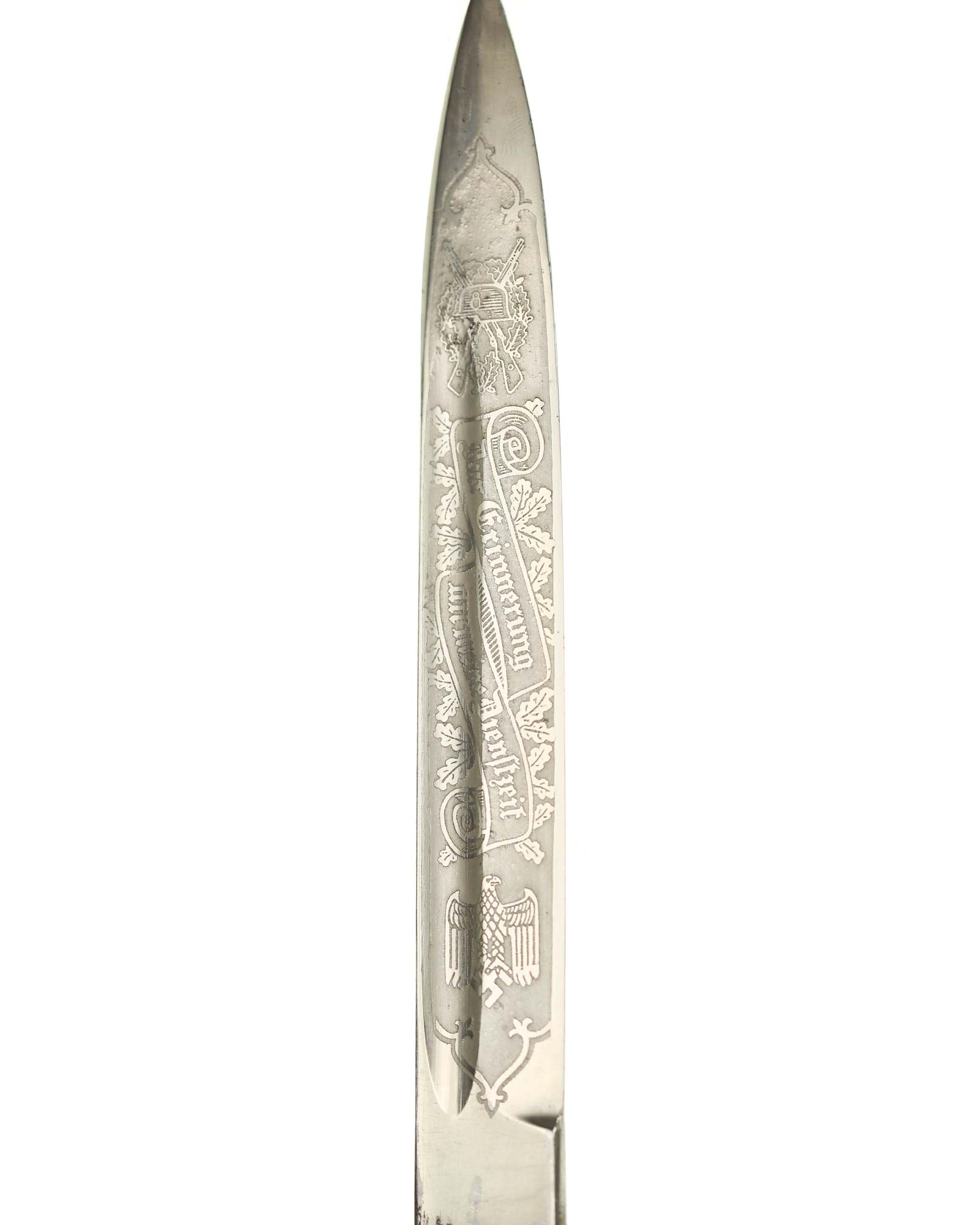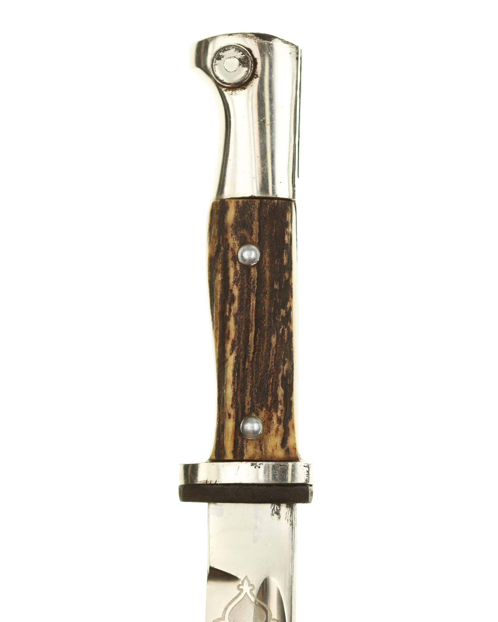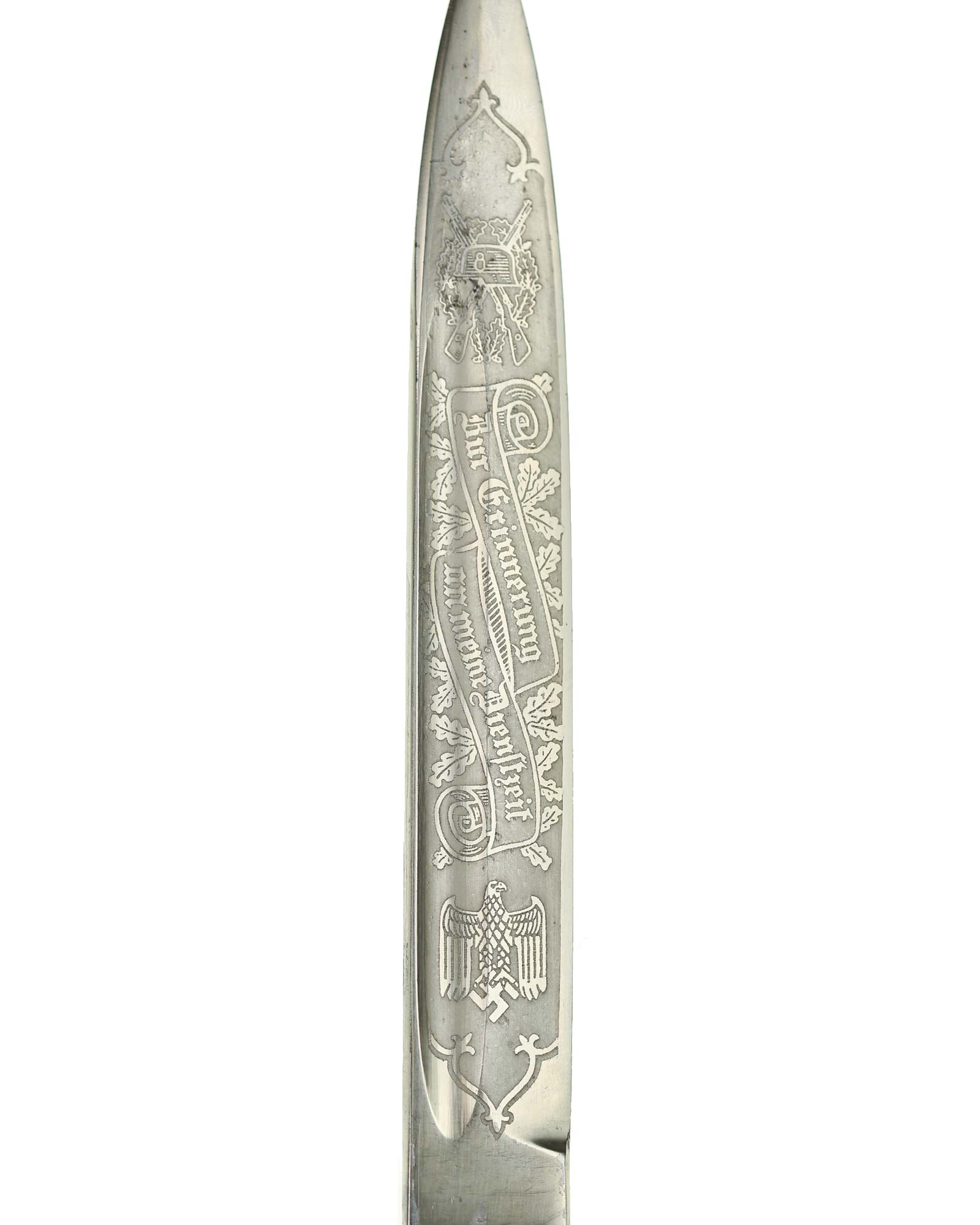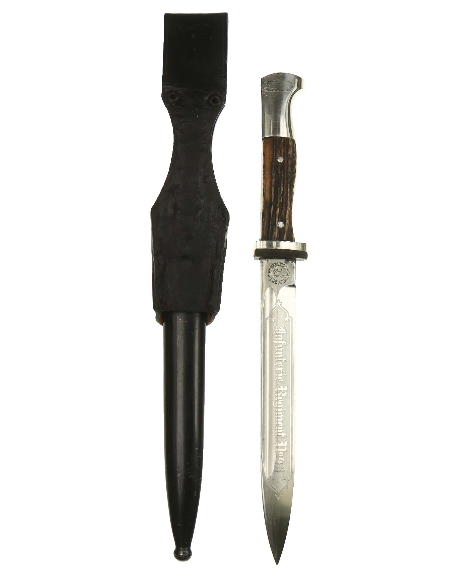 Blade: The blade has a fine fuller. This blade is bright throughout and is in near mint condition. The obverse has Pattern with inscription "The Erinnerung an meine Dienstzeit". The reverse is stamped with the maker mark Gustav Spitzer Solingen, the second etched "Infanterie Regiment No 43", and the original blade washer is in place.