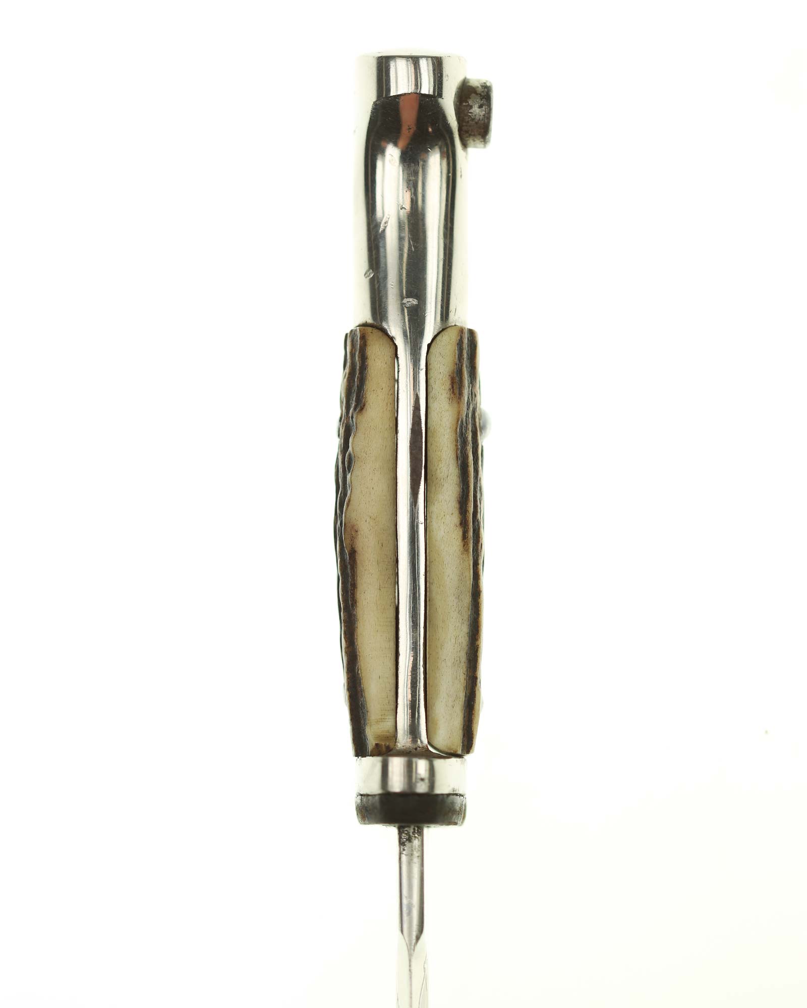 Grip: The grip plates are in perfect condition. There are retained by steel rivets with dressed obverse heads. The nickel hilt plating on this bayonet is remains fine throughout. The mortise button and blade lock work well.