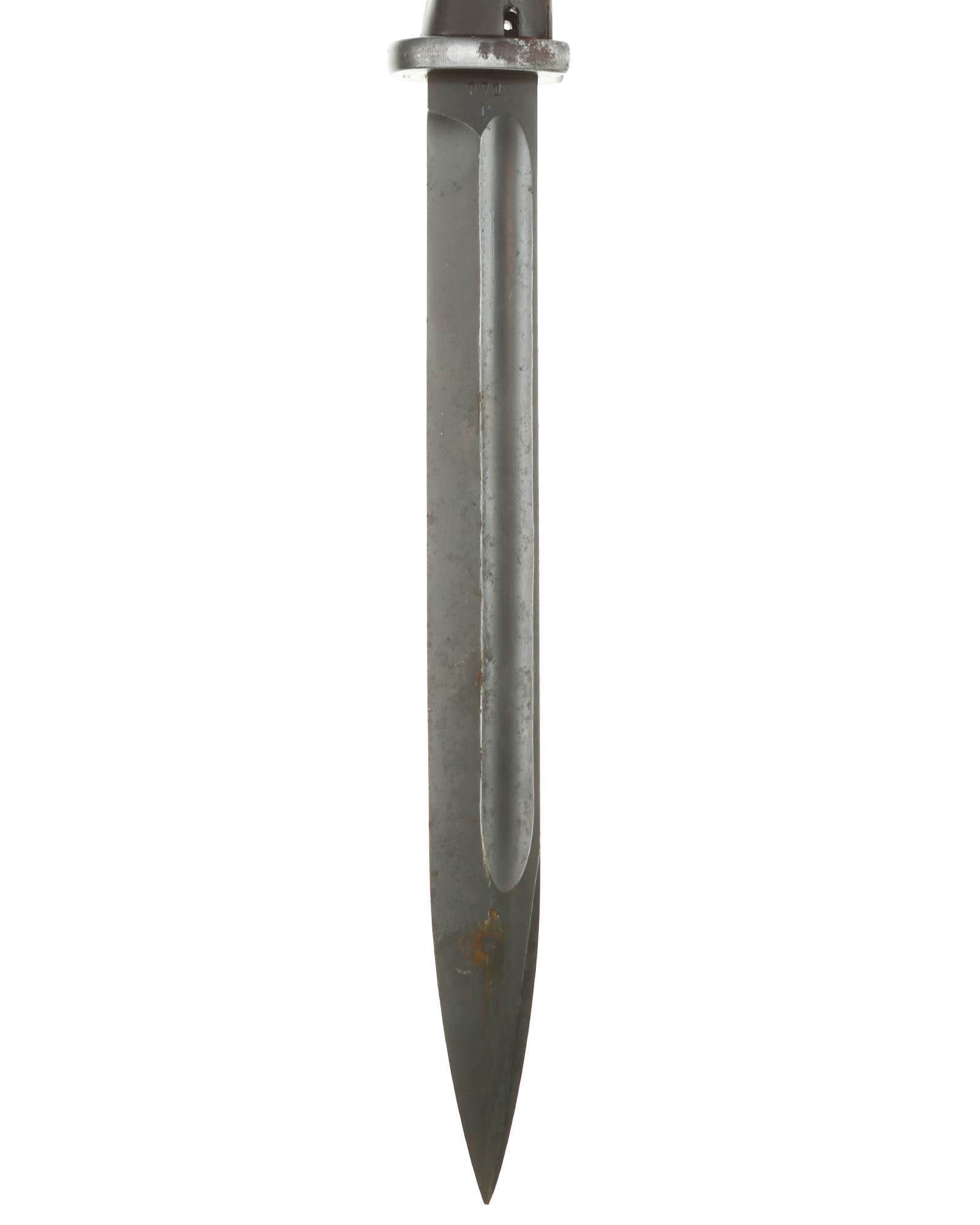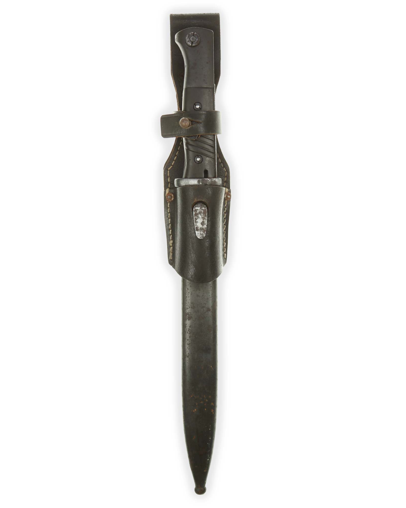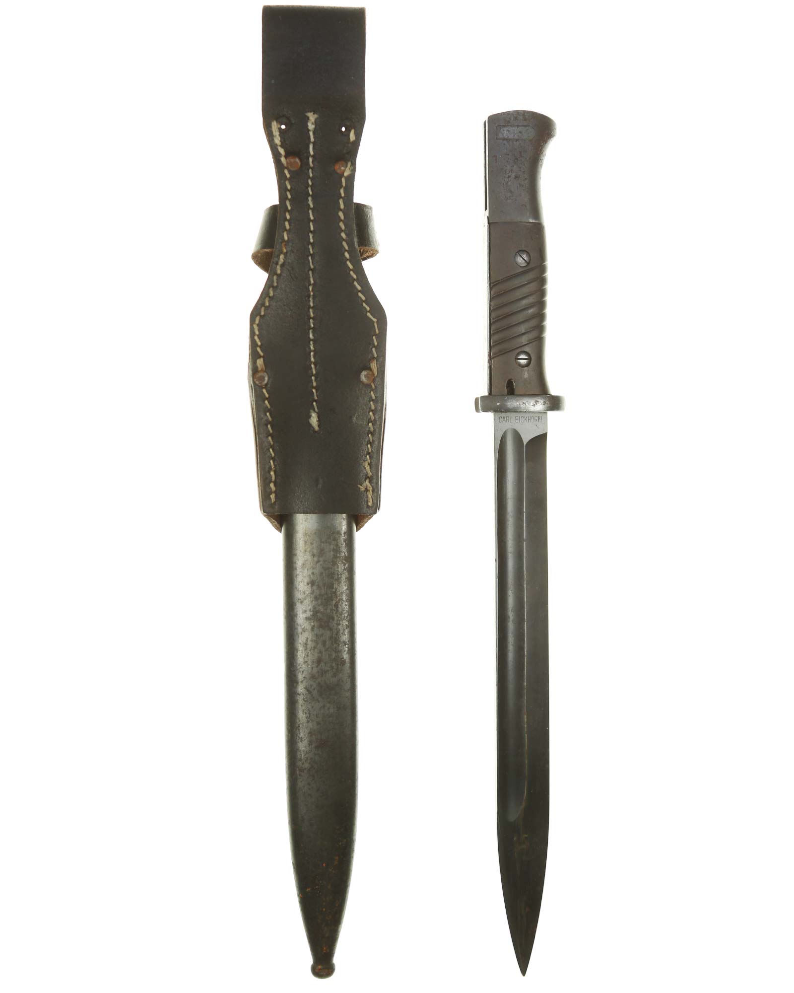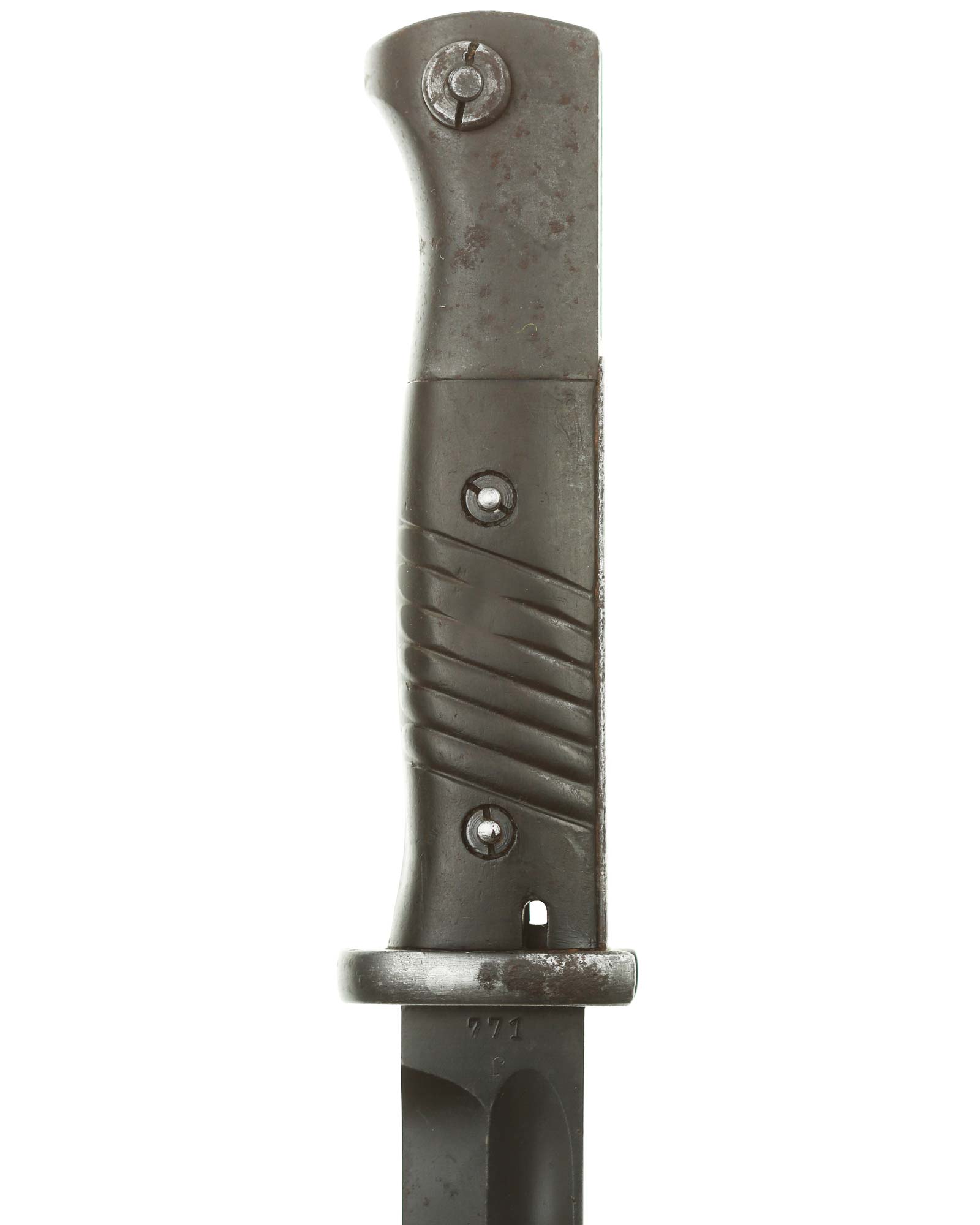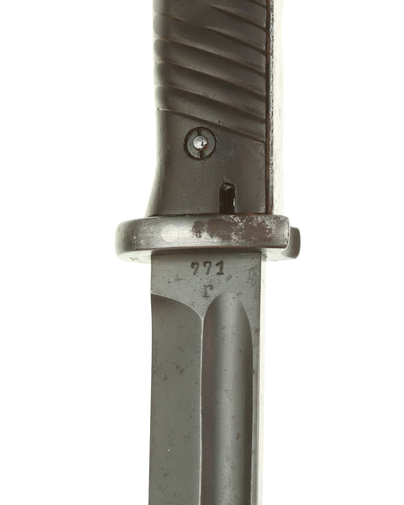 German 3rd Reich marked M84/98 (K98) knife bayonet with number 771 and maker mark Original Eickhorn Solingen, the steel blade is 253 mm, it is complete with steel scabbard. The general condition is EXC++.