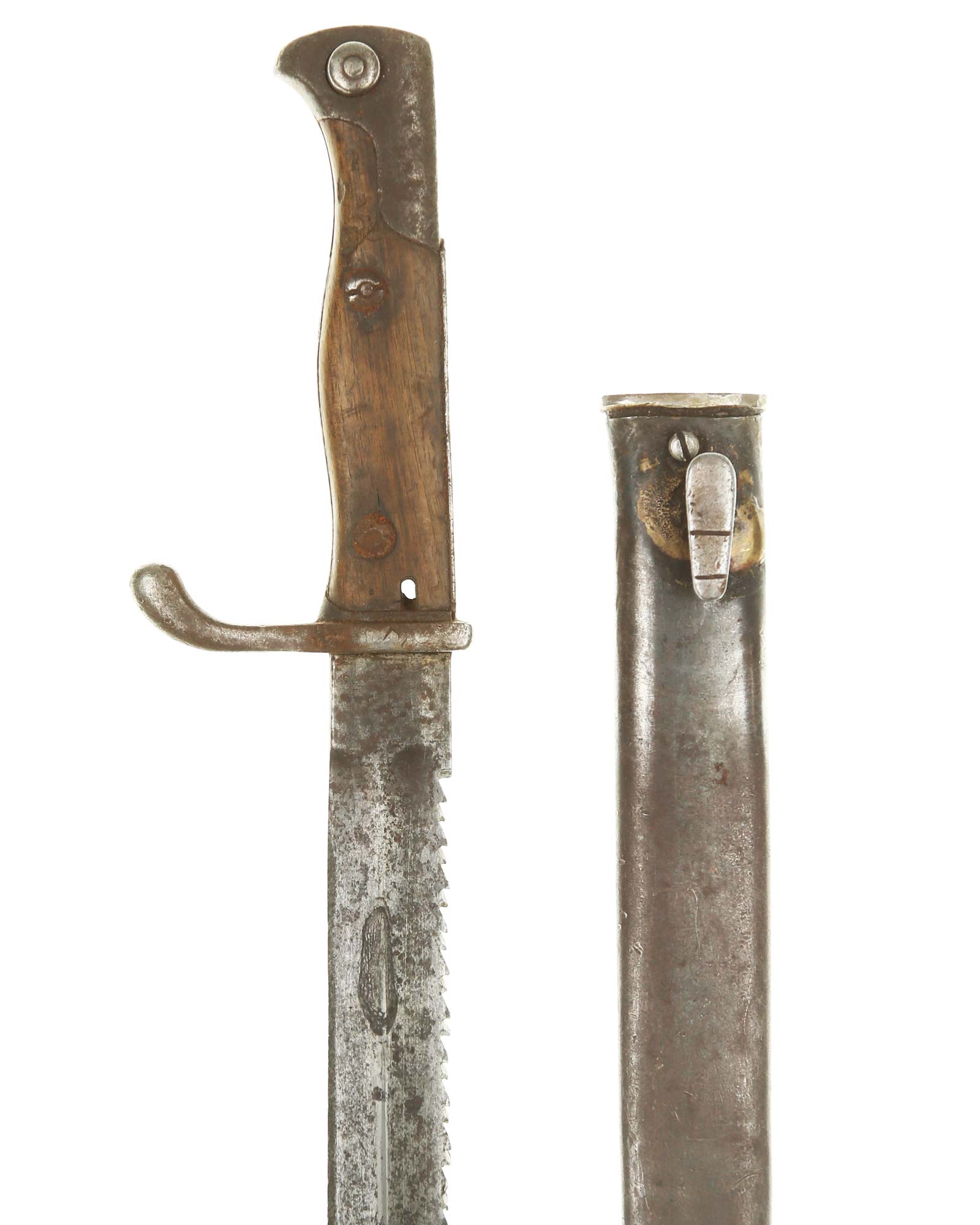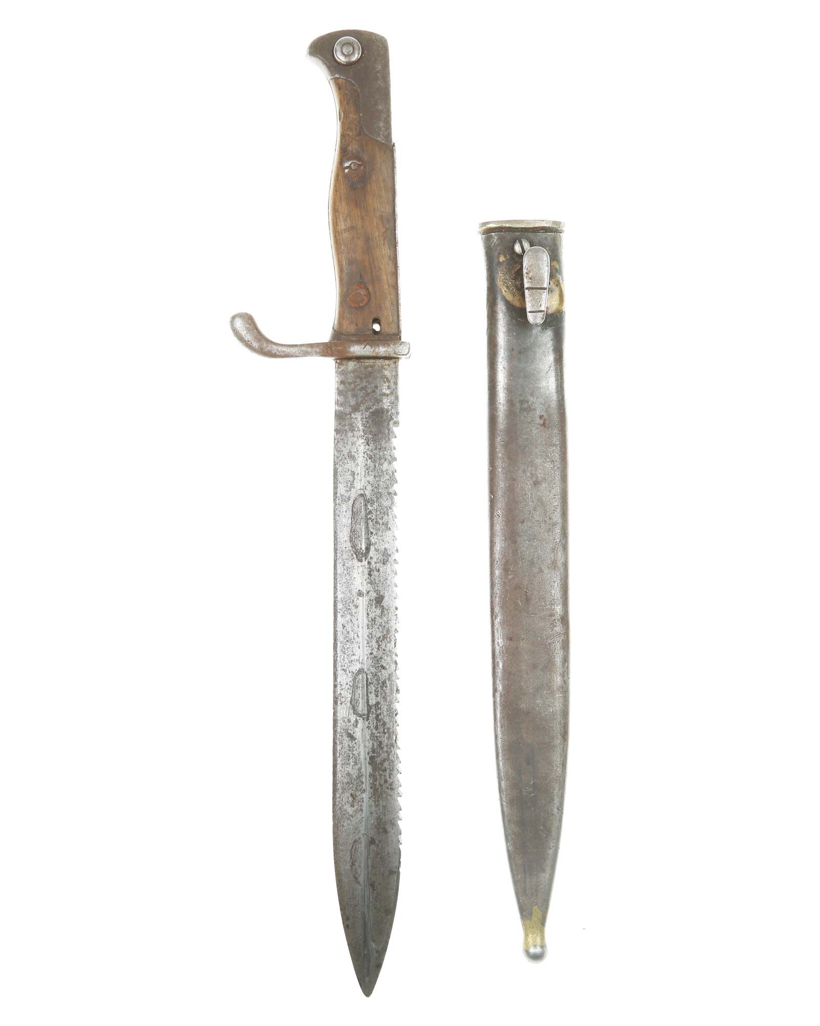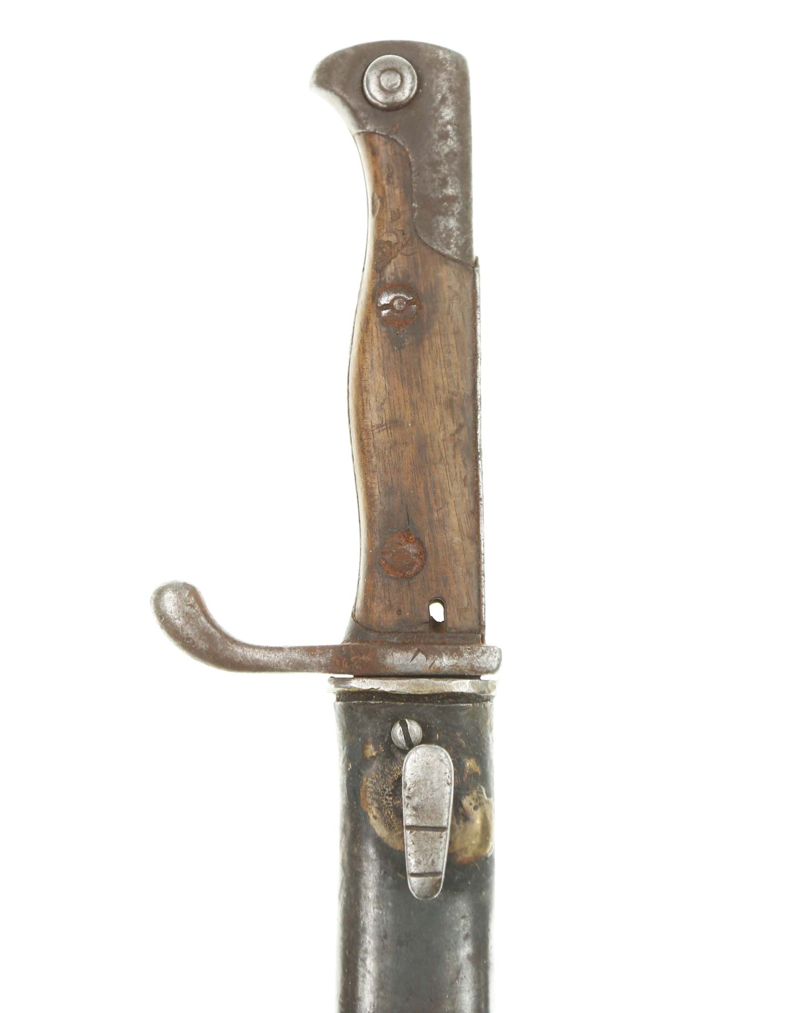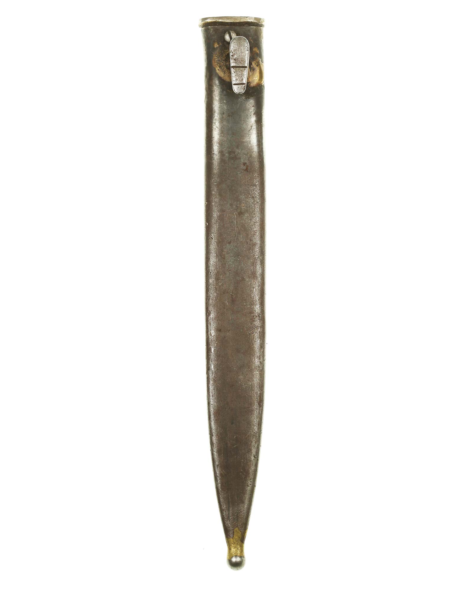 This Prussian Bayonet with the manufacturer: Waffenfabrik Mauser A.G. Oberndorf. This is in EXC+ condition. The push button attachment works well. This is a 42.2 cm long bayonet. Handle with two wooden grip scales, screwed twice, sheet steel sheath.